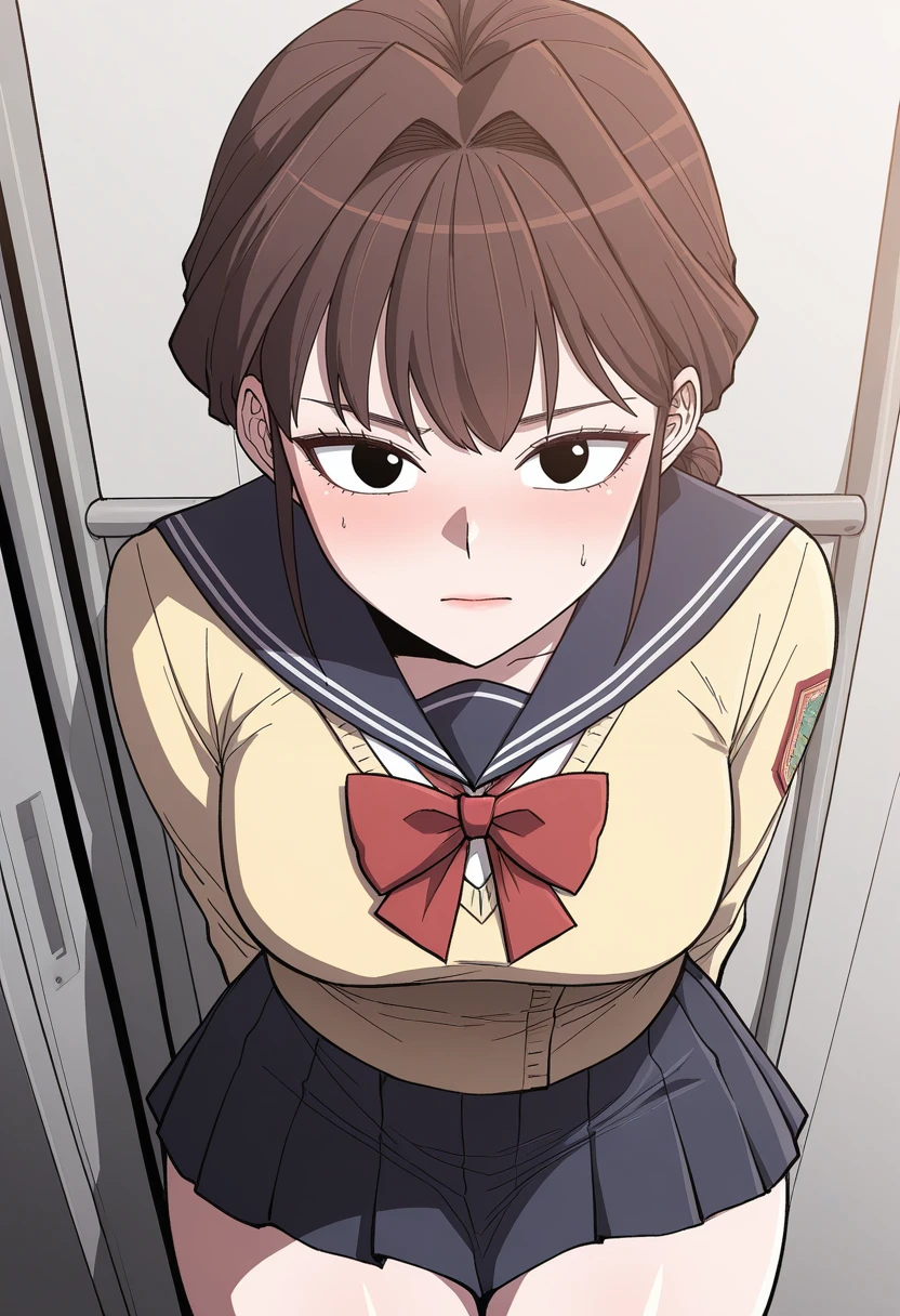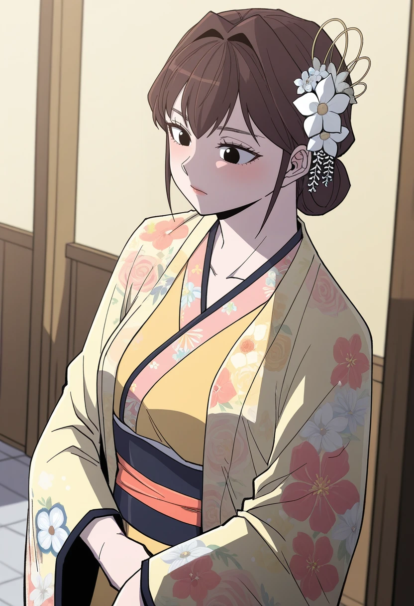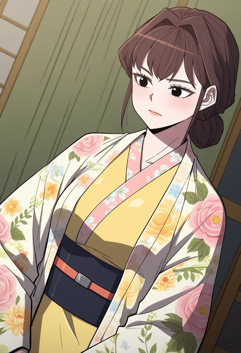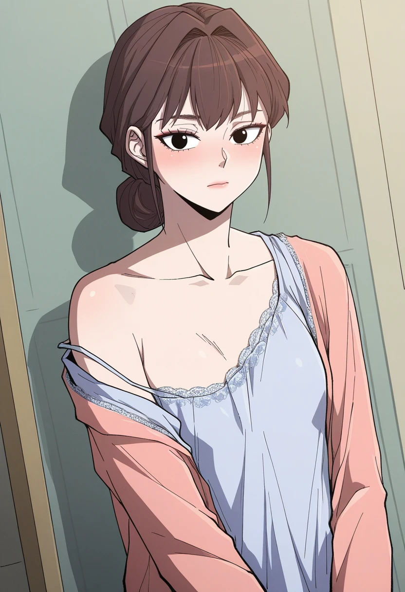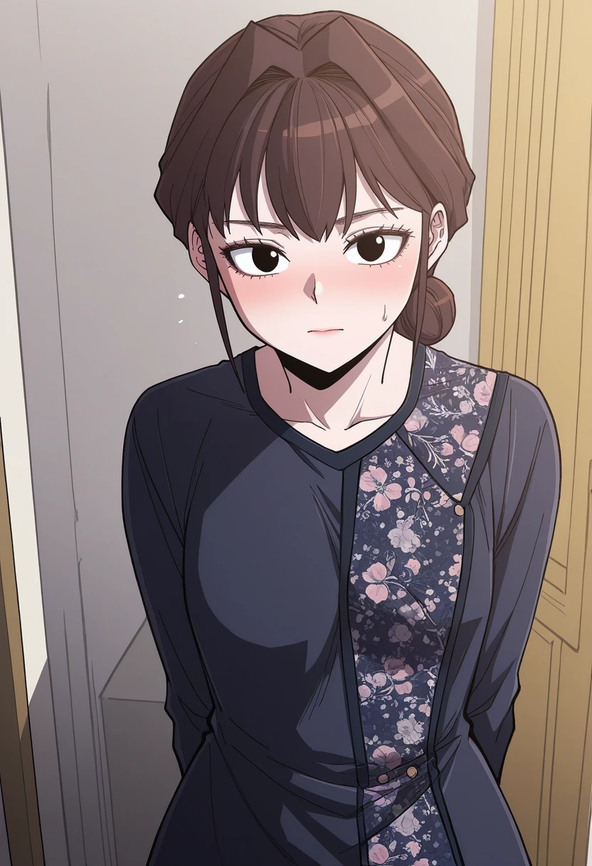Eon Yeong, 1girl, solo, black eyes, bangs, brown hair, hair bun, single hair bun, small ,