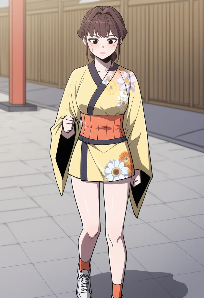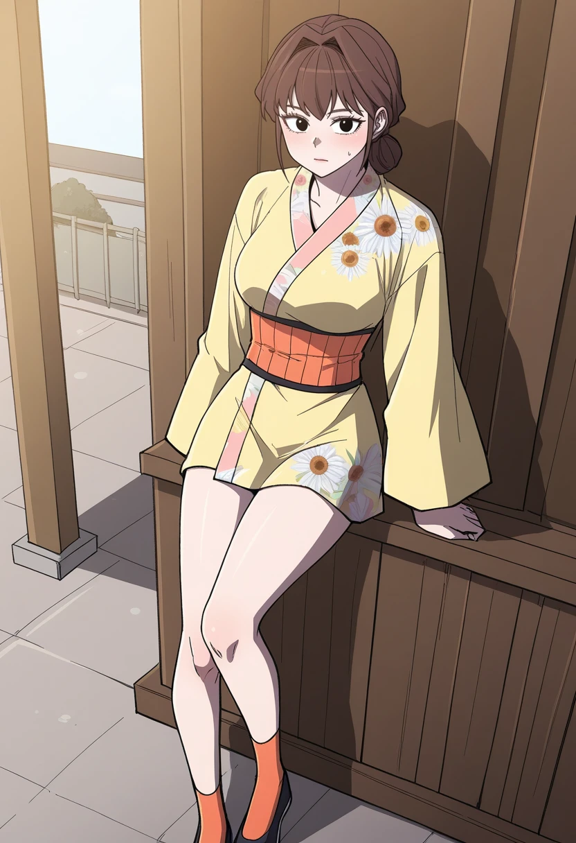 casual_out, kimono, short kimono, yellow kimono, floral print, wide sleeves, long sleeves, orange socks, shoes, orange obi,