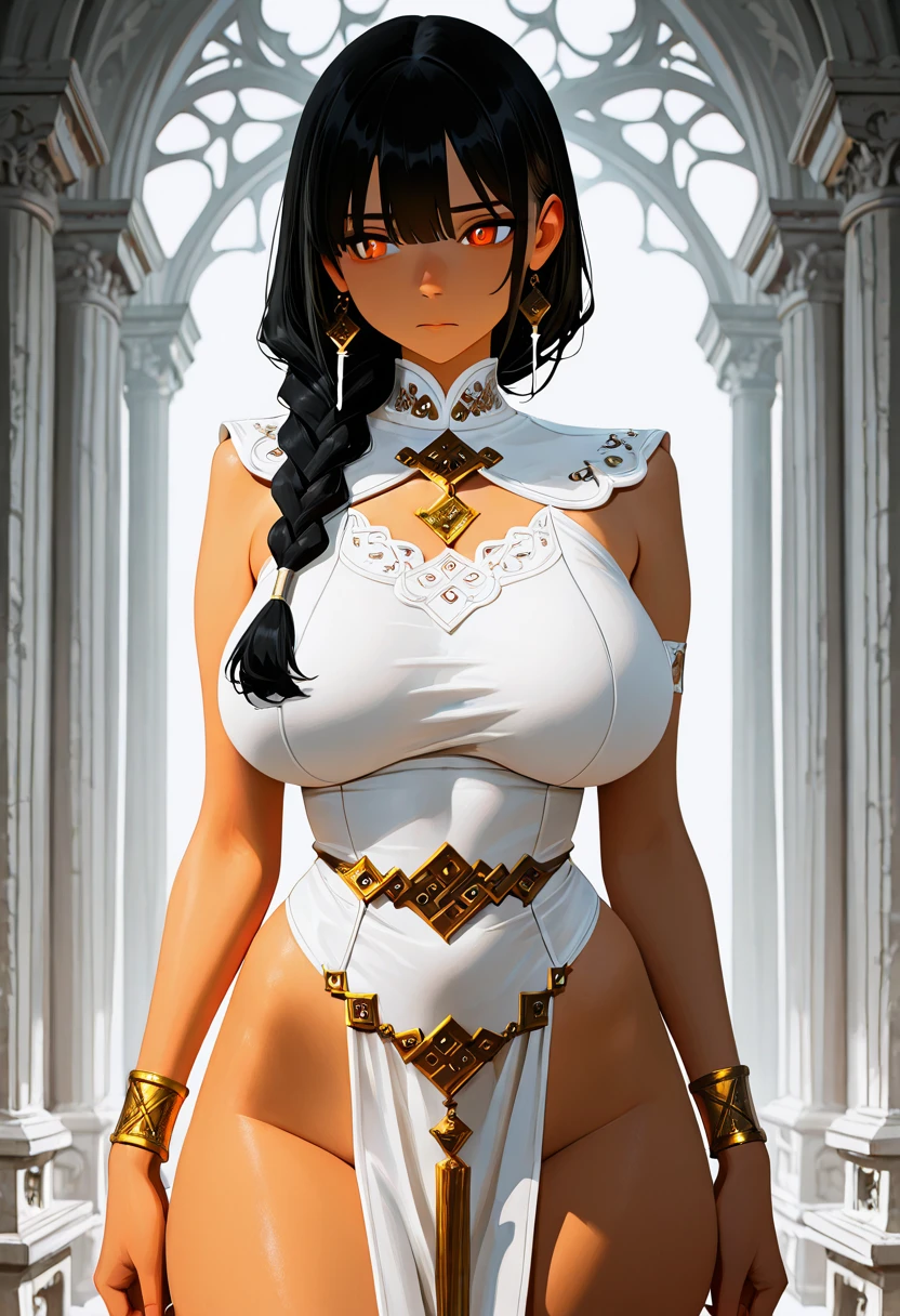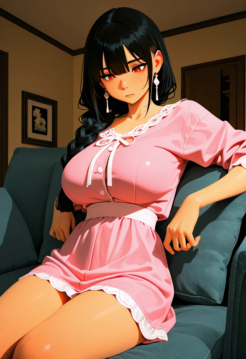 NalaniFR,1girl,solo, black hair,bangs,long hair, braided hair,large saggy ,
