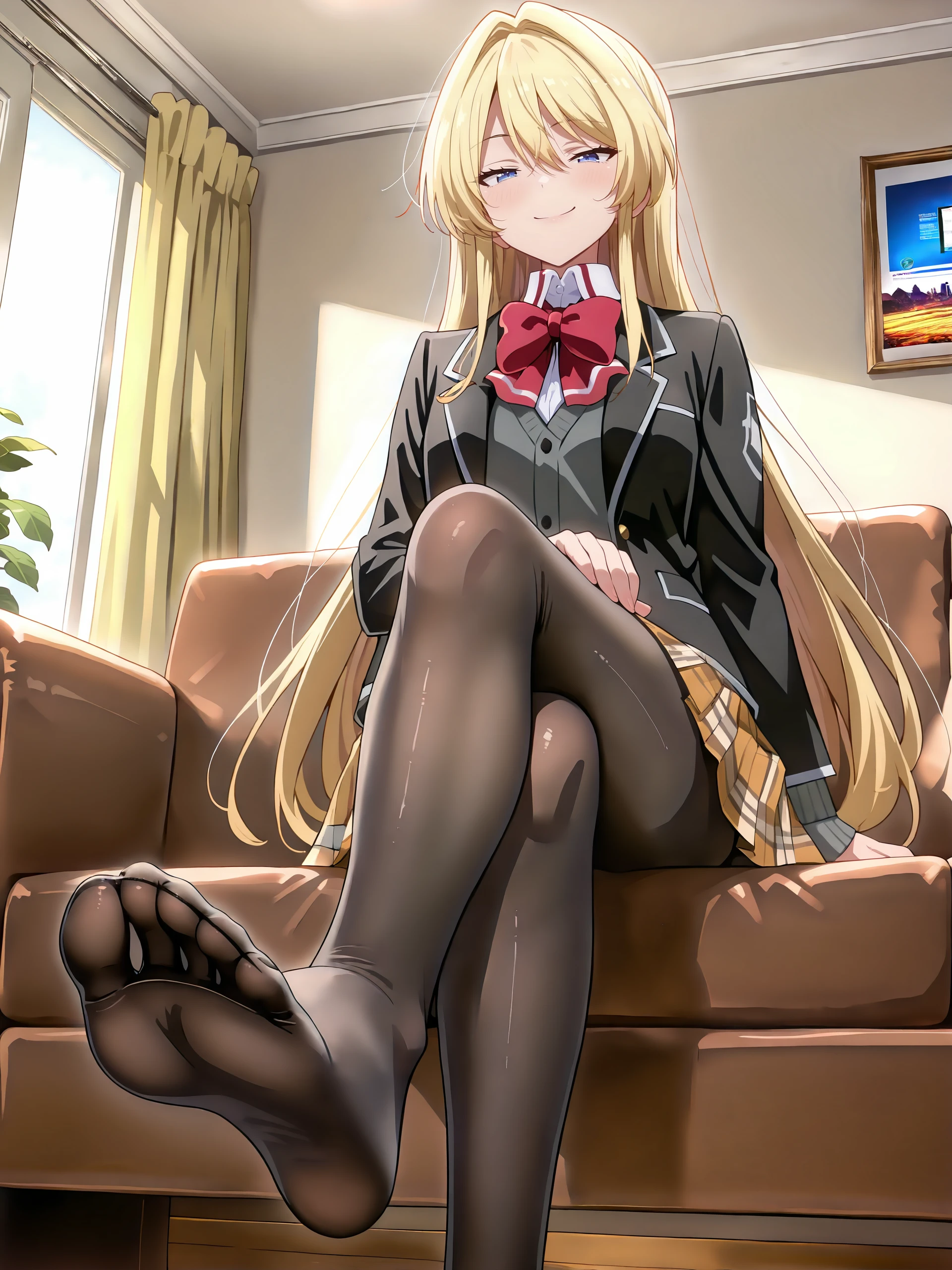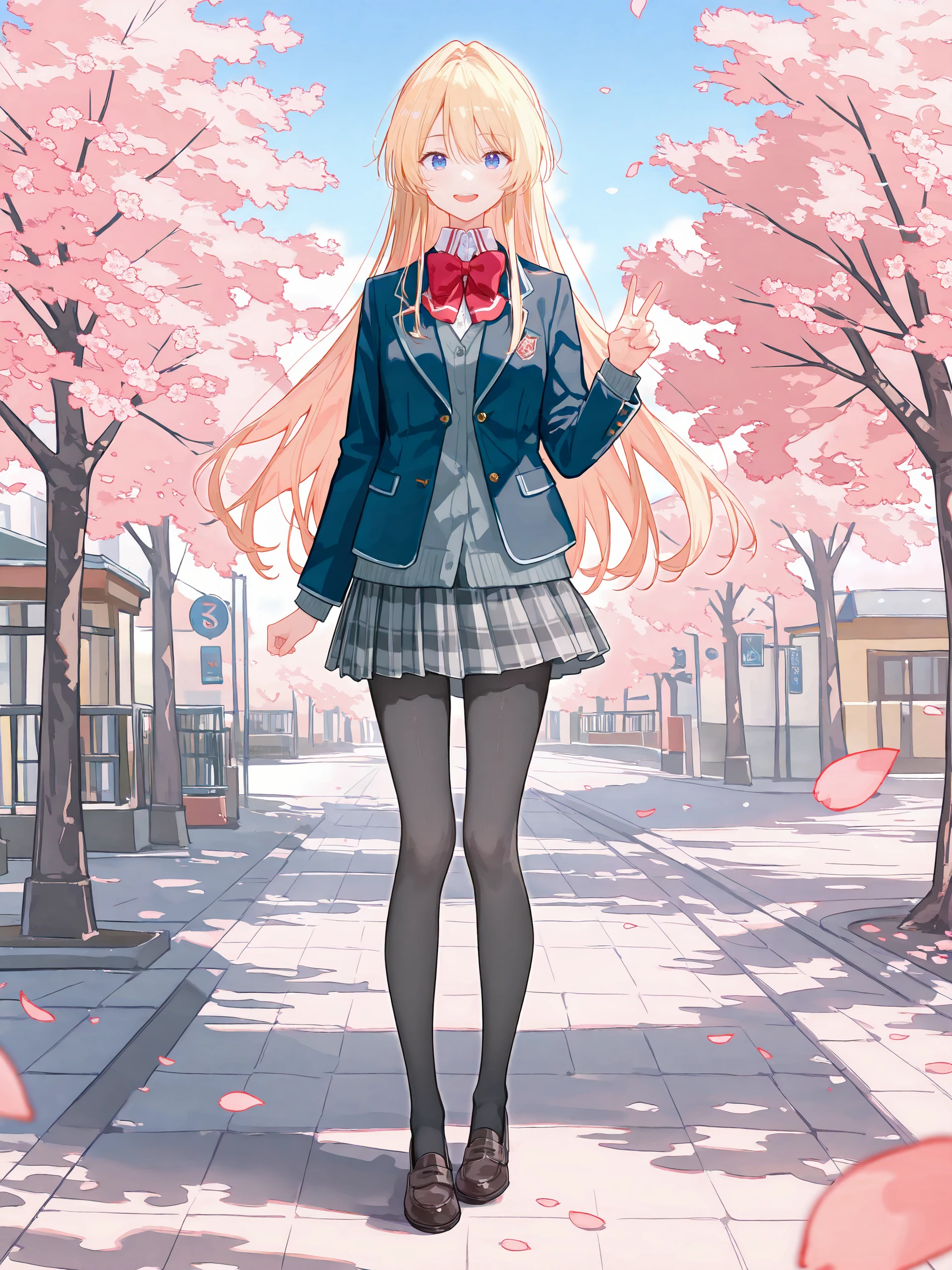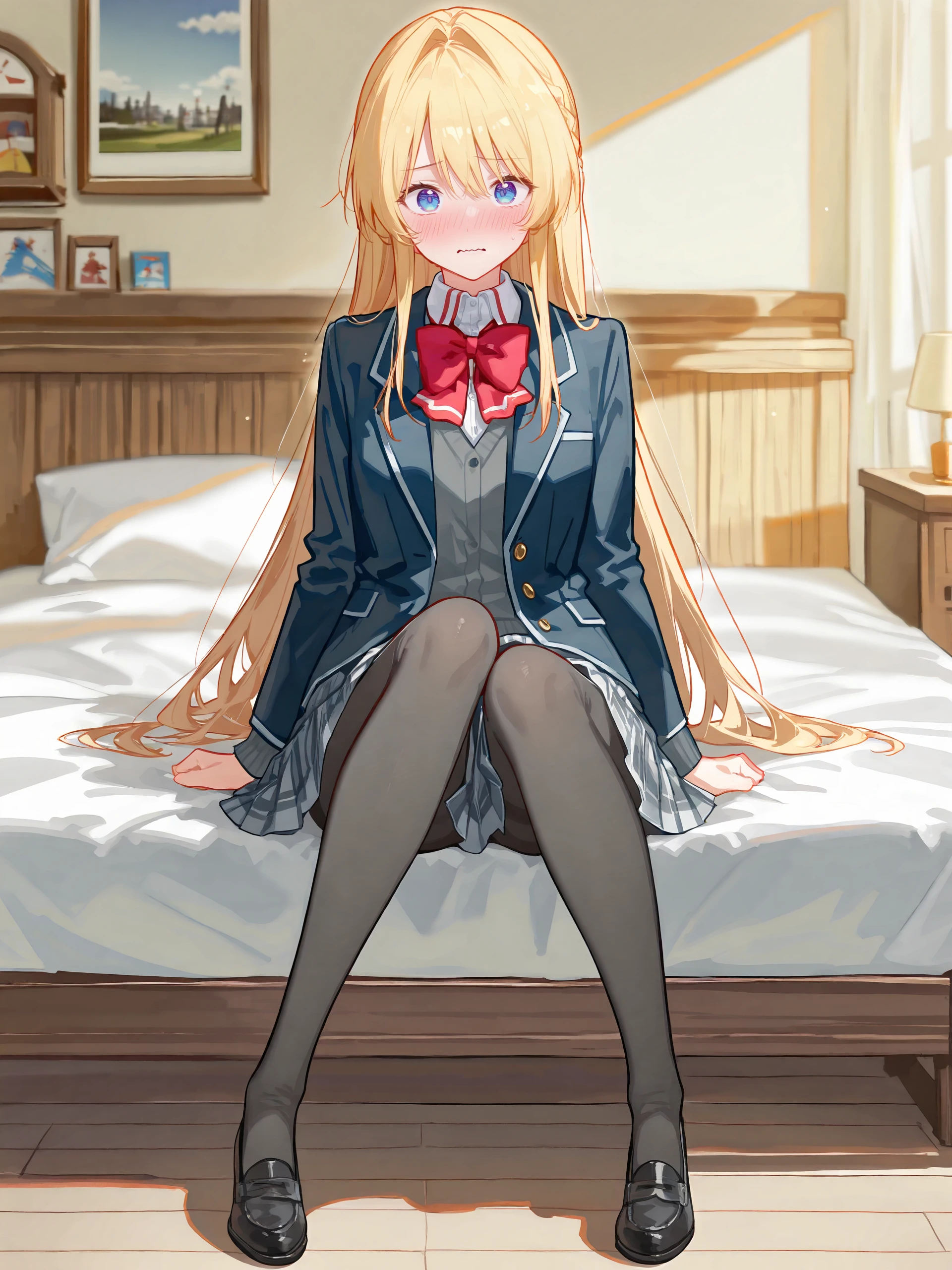 school uniform, pleated skirt, plaid skirt, white collared shirt, blazer, red bowtie, loafers, black pantyhose