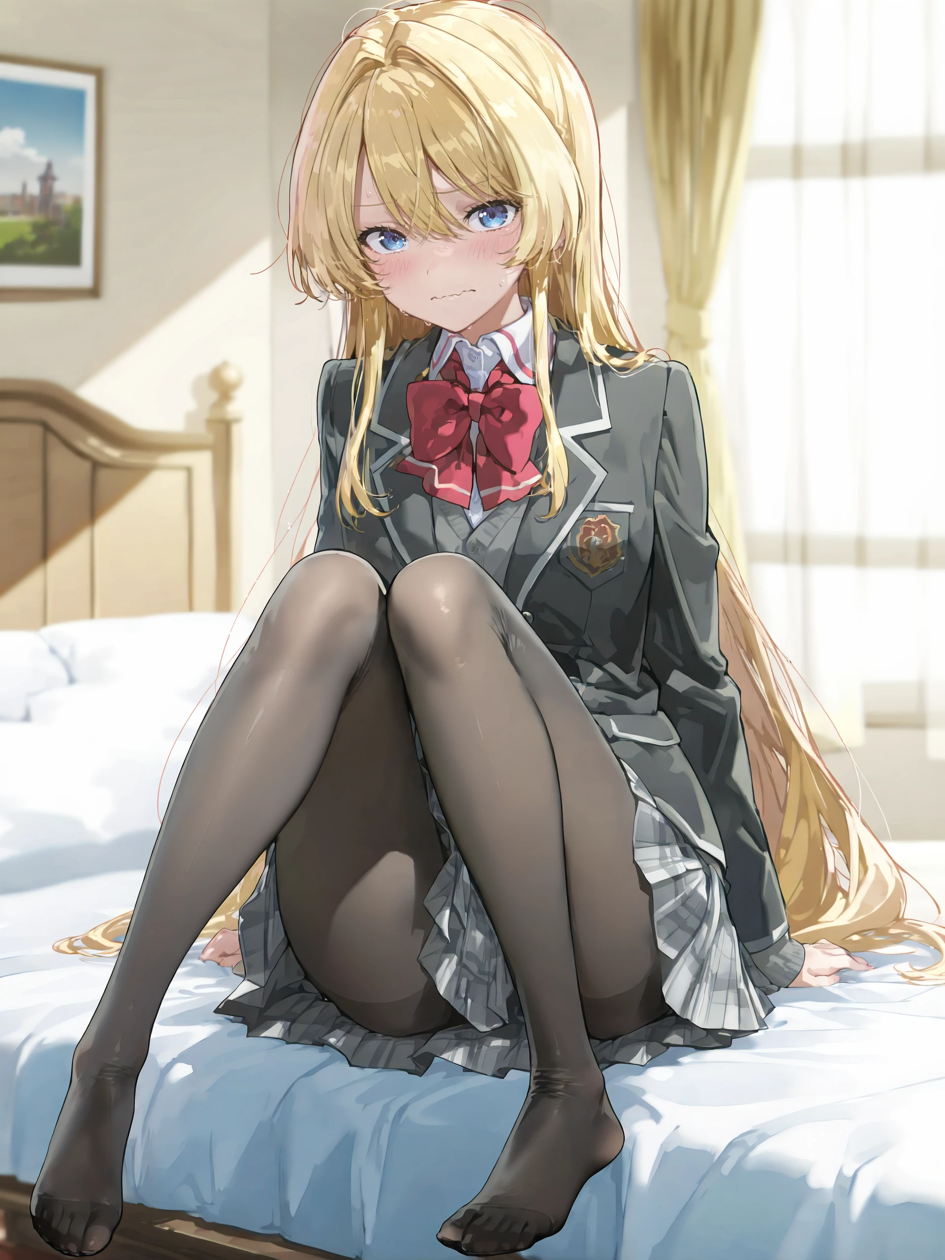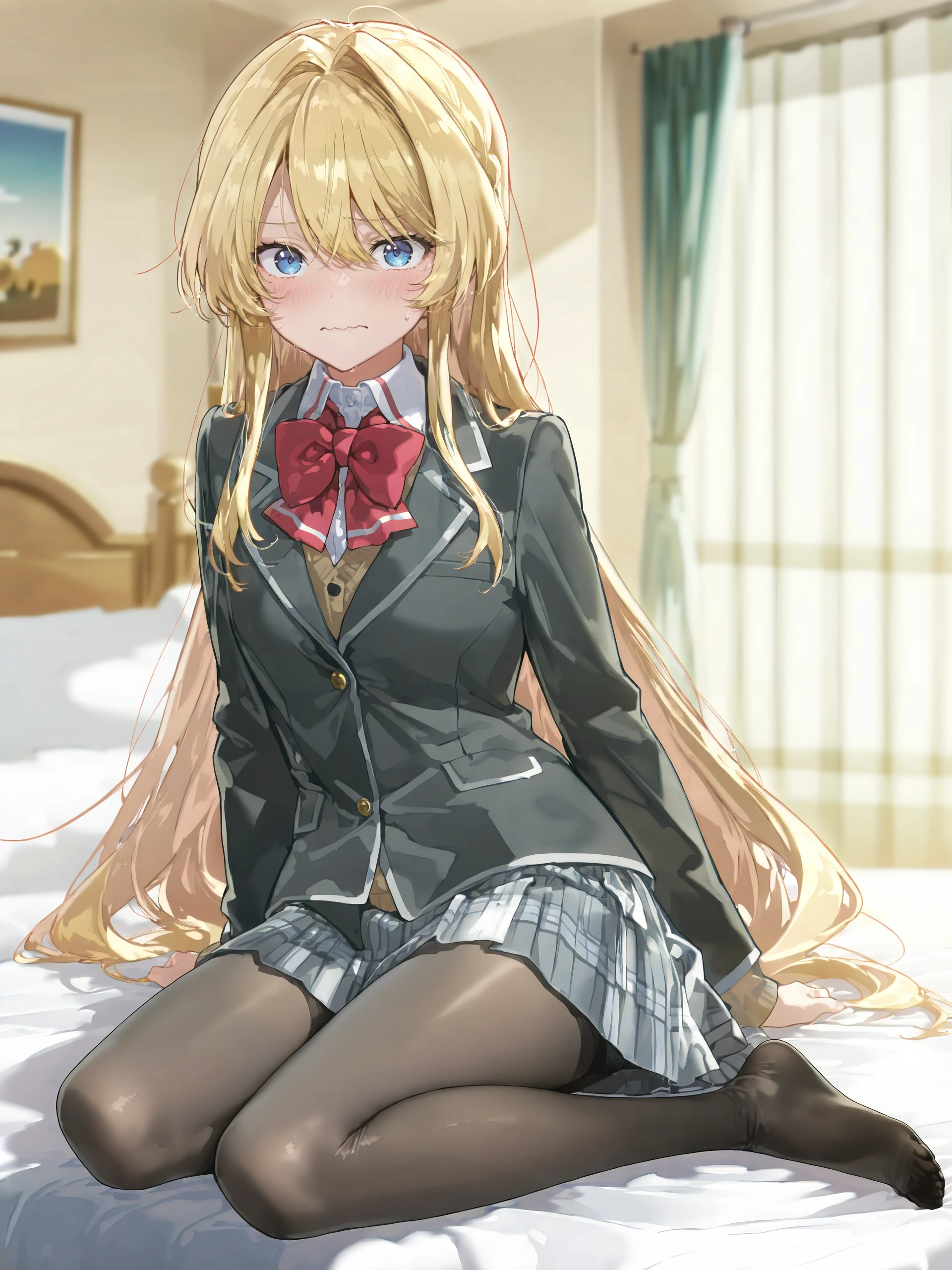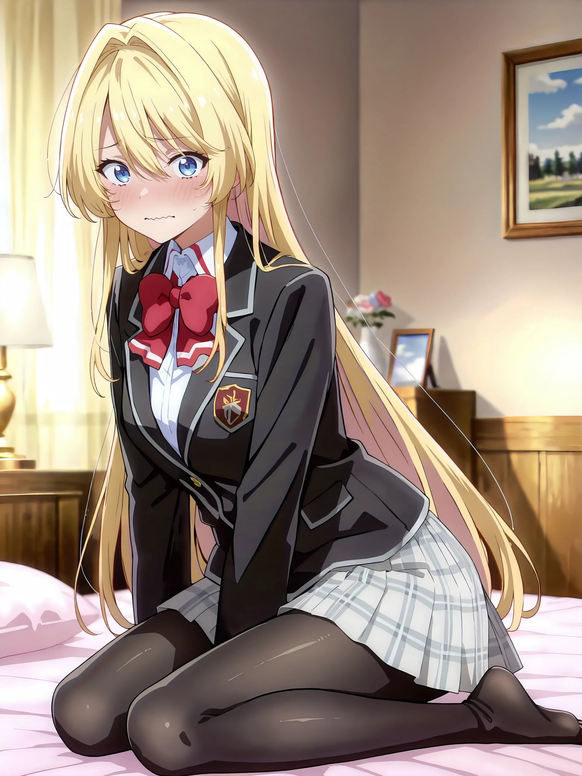 school uniform, pleated skirt, plaid skirt, white collared shirt, blazer, red bowtie, loafers, black pantyhose