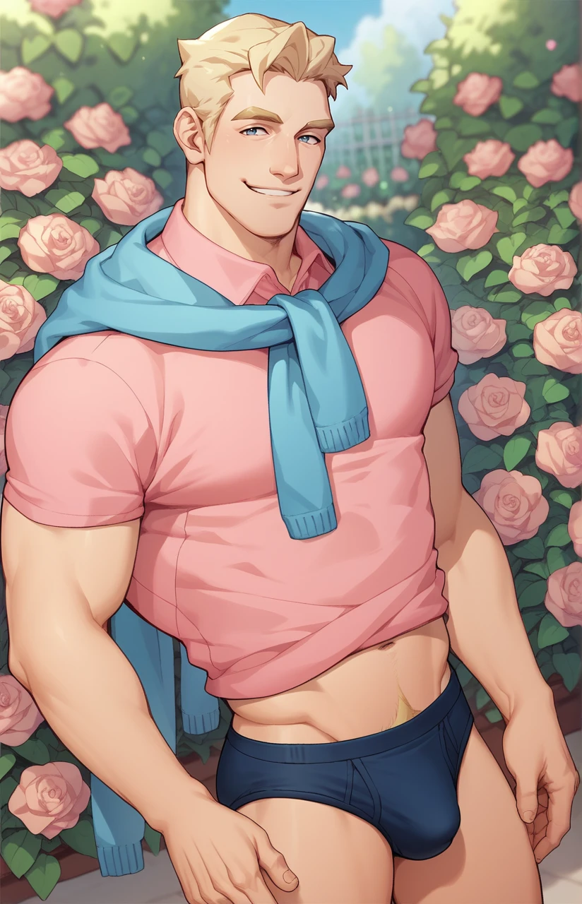 pink shirt, blue scarf,