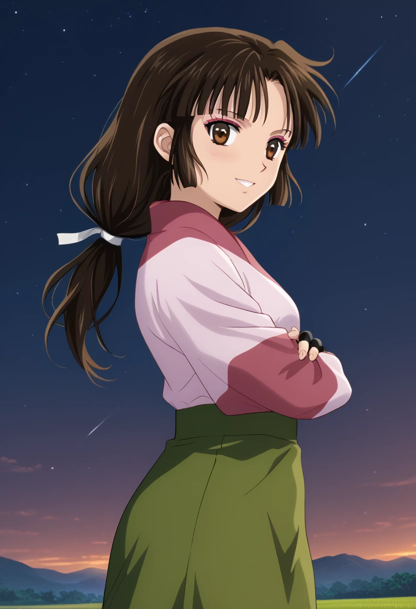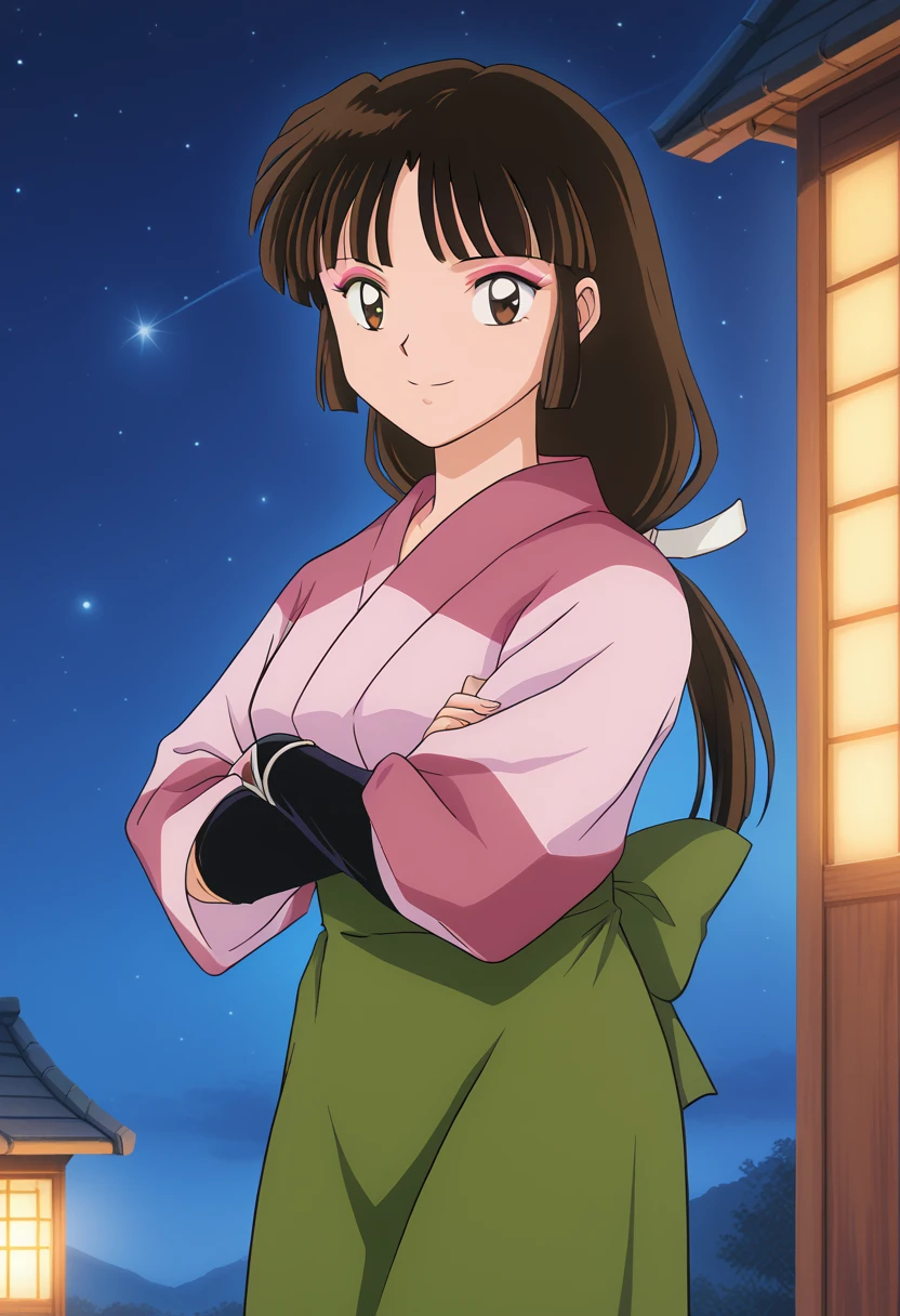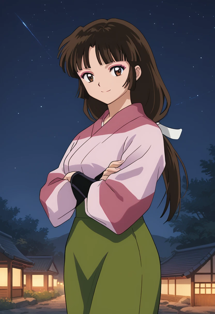 ◽️"sango, brown eyes, makeup, blunt bangs, brown hair, low-tied long hair, kimono, pink kimono, skirt, green skirt, fingerless gloves"