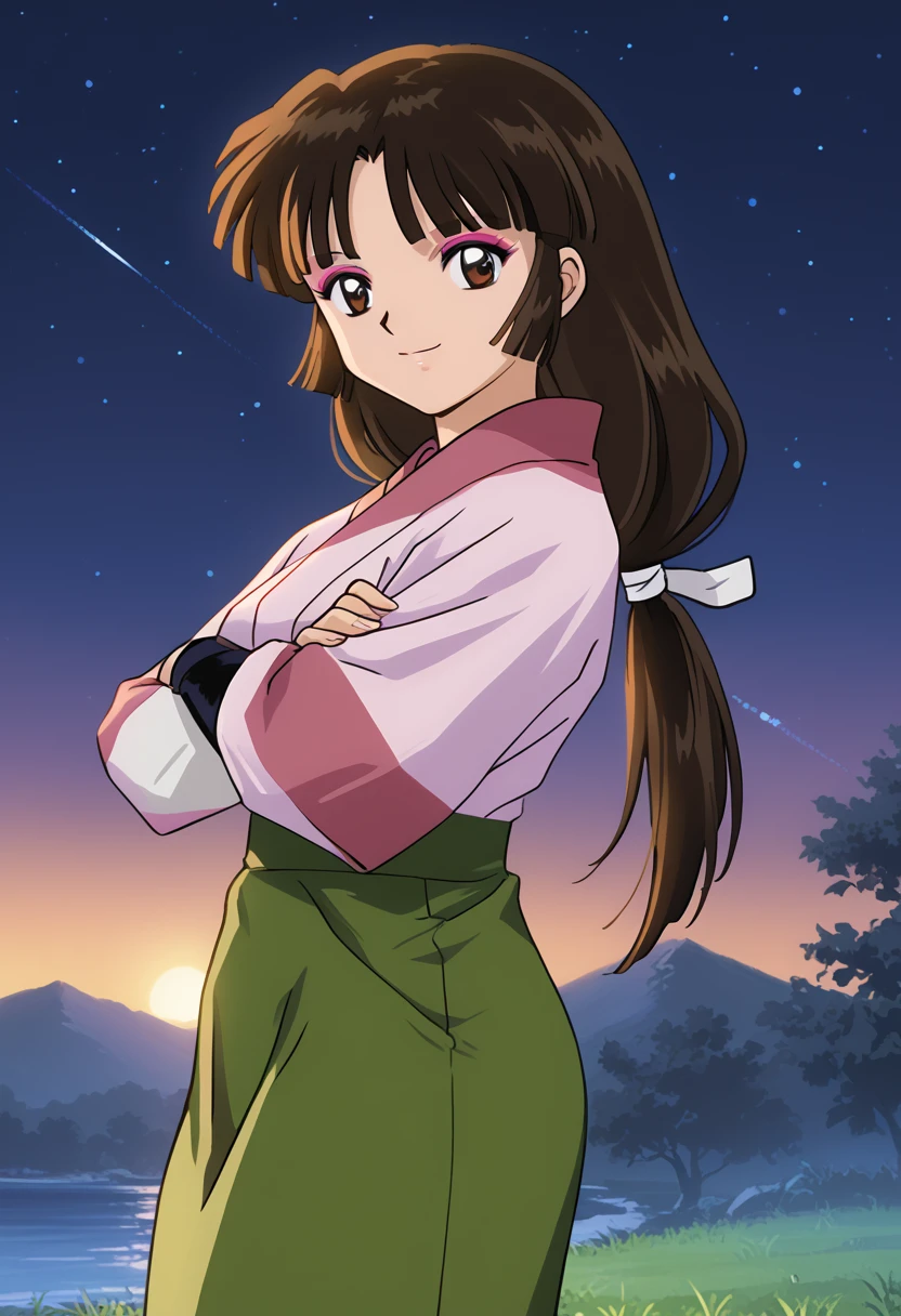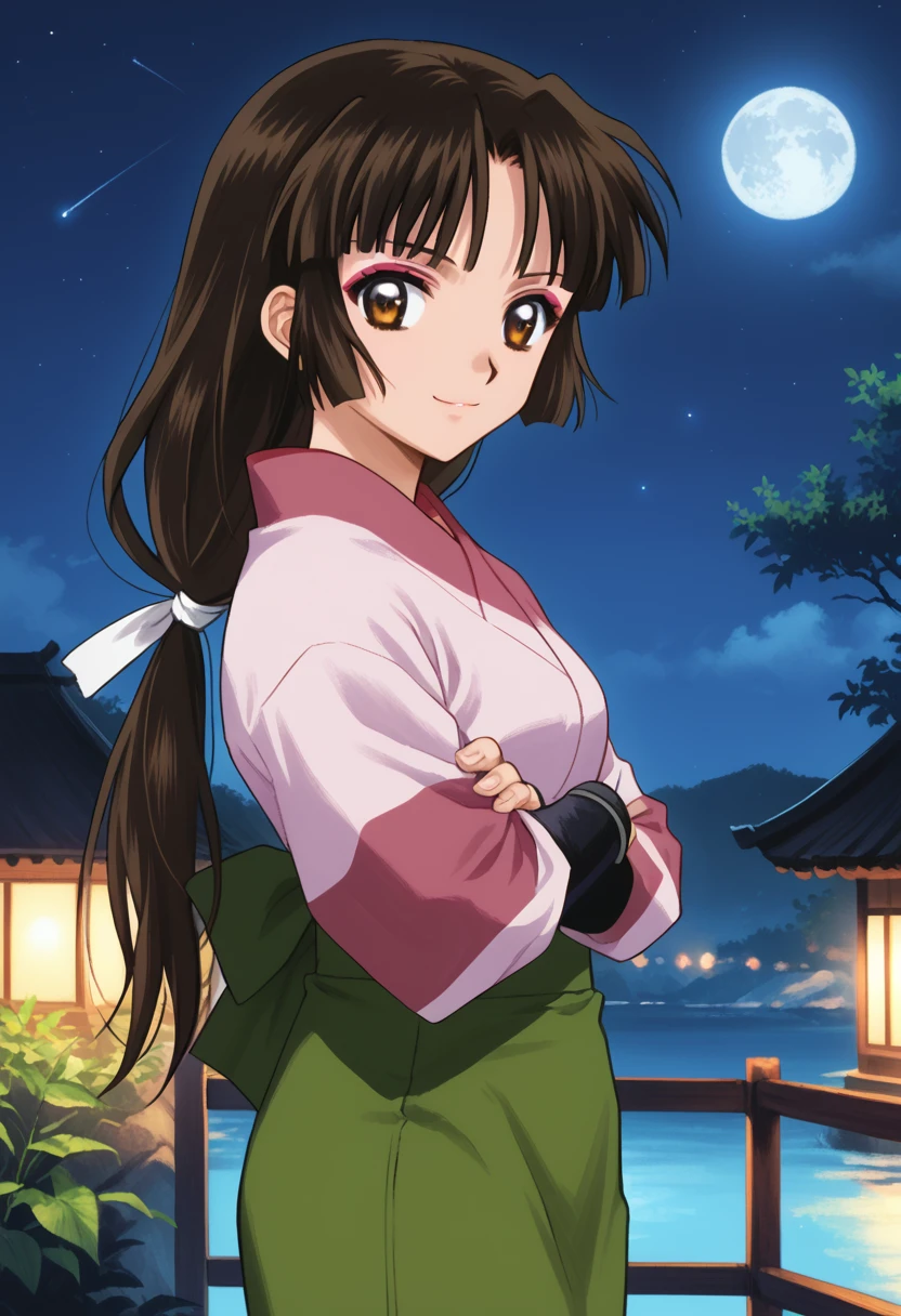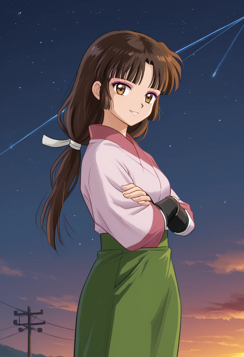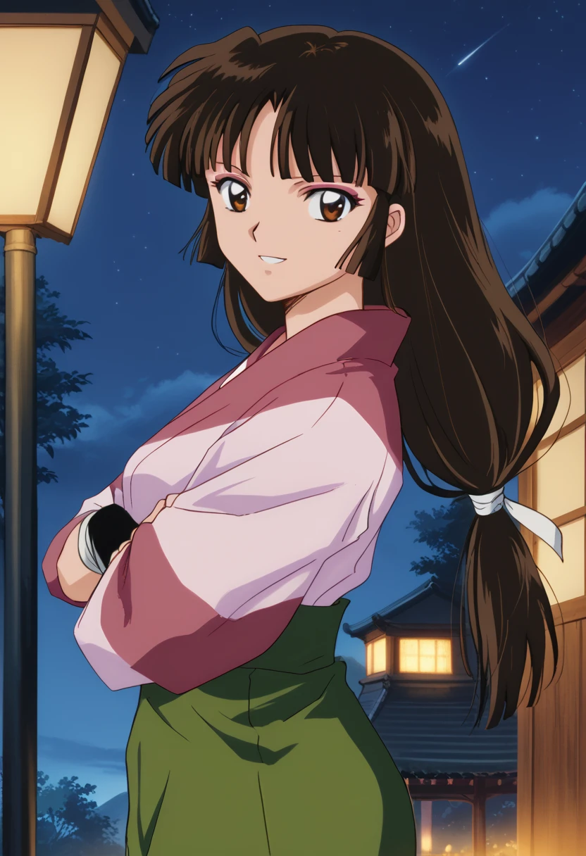 ◽️"sango, brown eyes, makeup, blunt bangs, brown hair, low-tied long hair, kimono, pink kimono, skirt, green skirt, fingerless gloves"