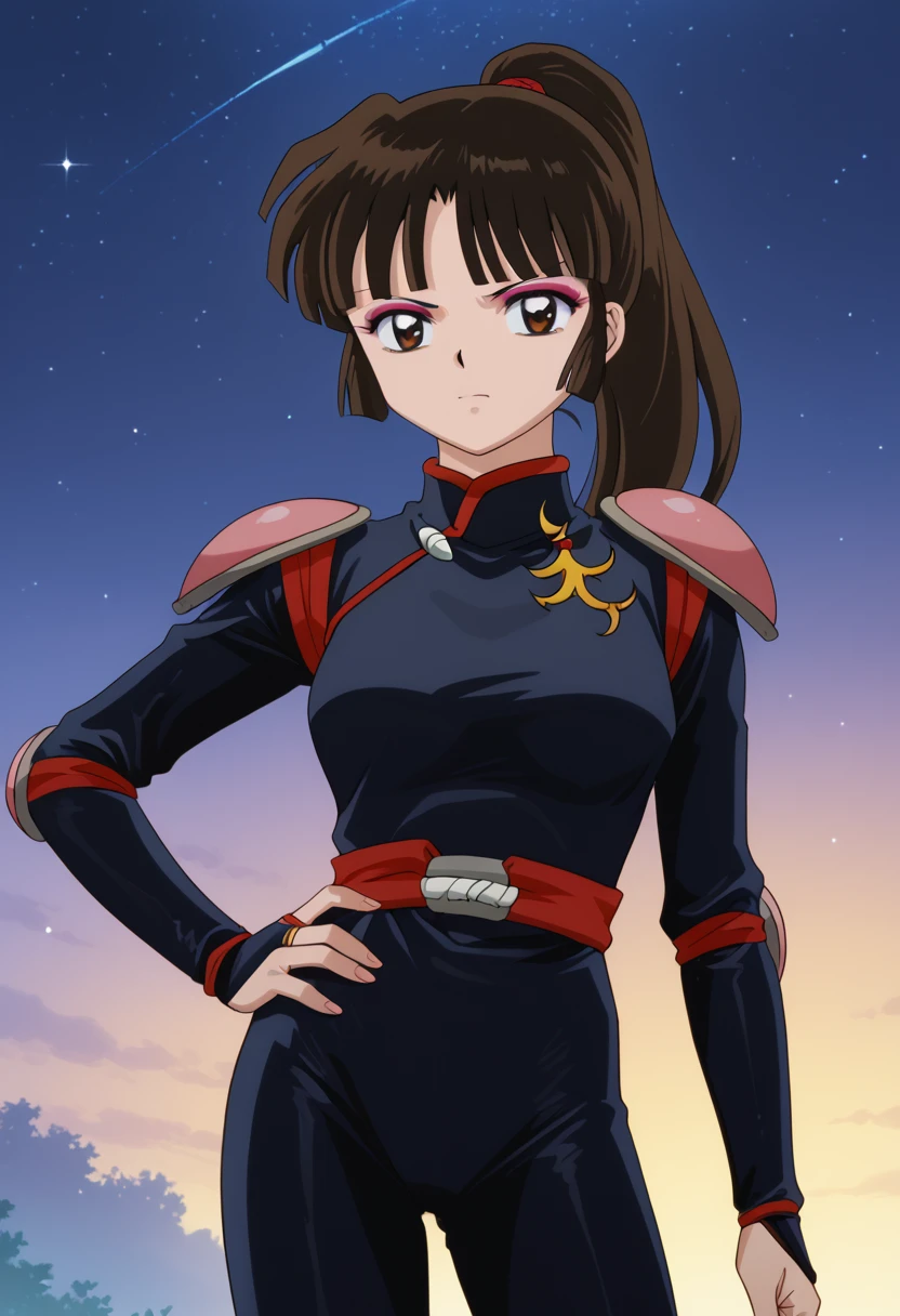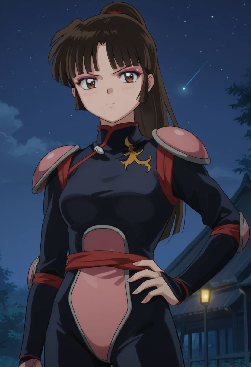 ◽️"sango, brown eyes, makeup, blunt bangs, brown hair, ponytail, , black , shoulder pads, fingerless gloves"