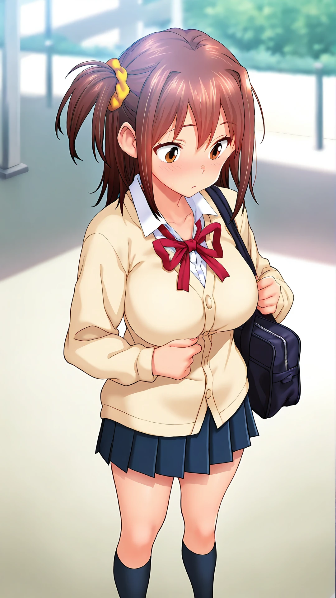 Kasuga Hinata,1girl,solo,skirt,brown eyes,school uniform,brown hair,cardigan,socks,pleated skirt,kneehighs,scrunchie,two side up,breasts,hair ornament,black socks,