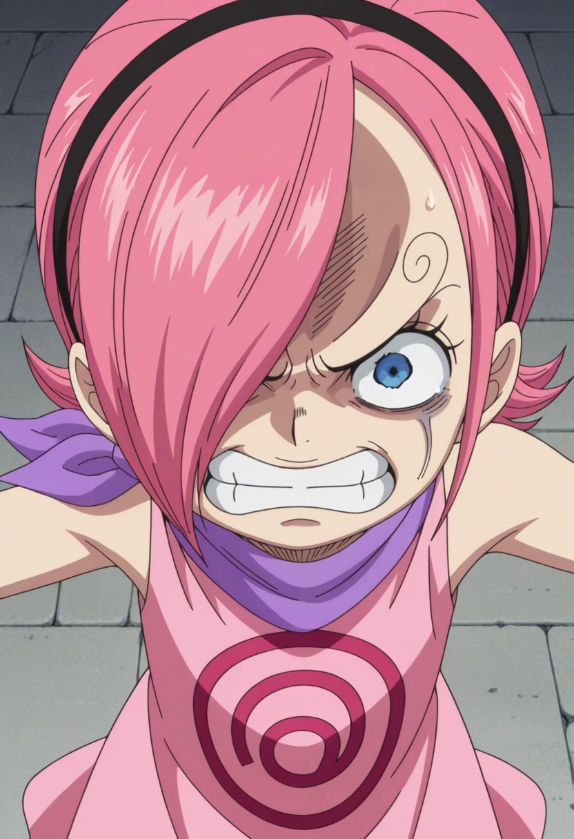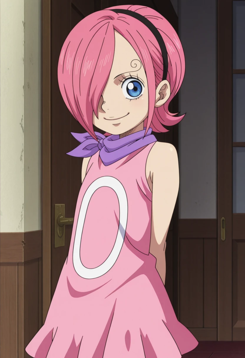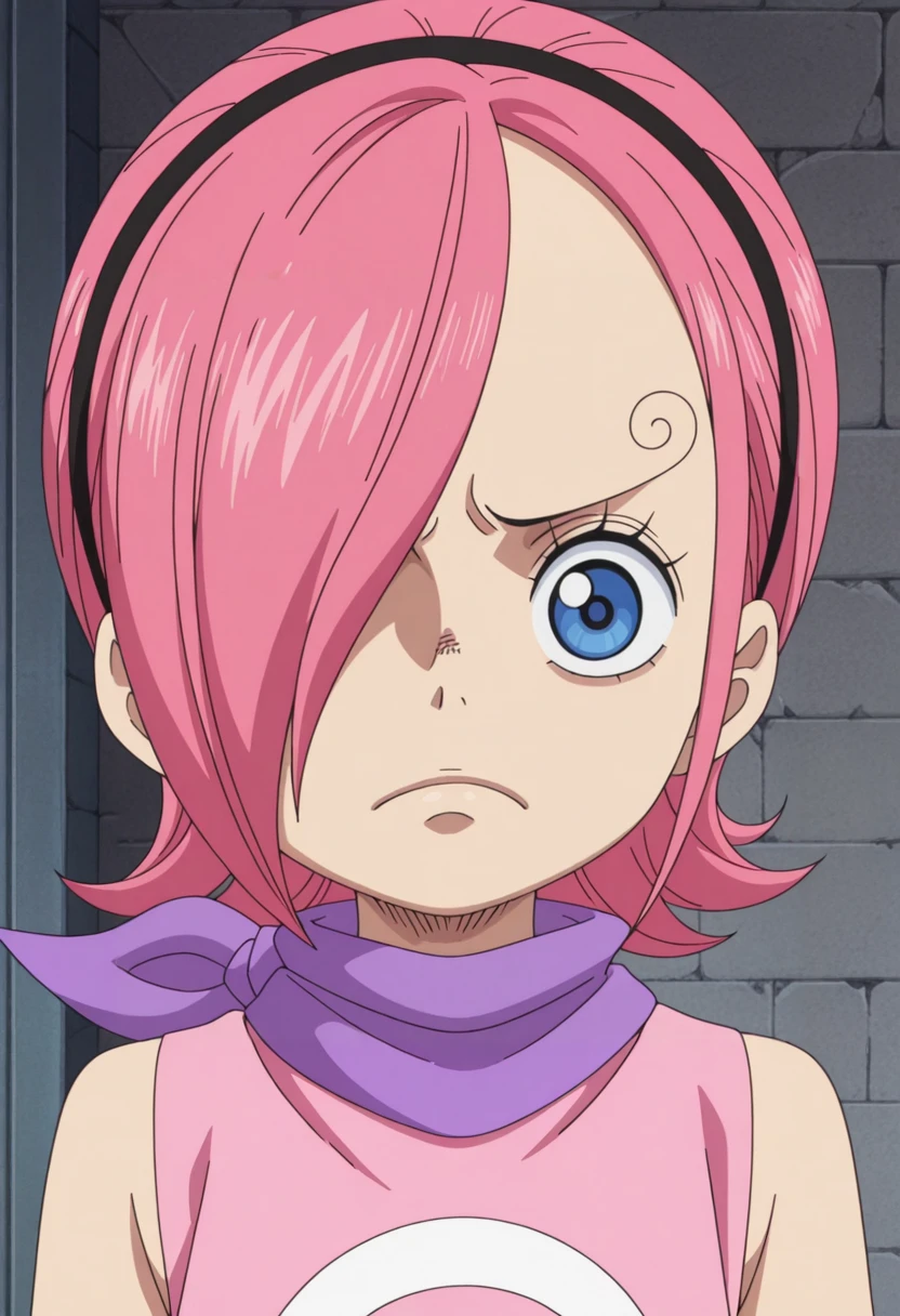 reiju, 1girl, blue eyes, pink hair, hairband, hair over one eye, neckerchief, o pink dress/loop dress, sleeveless,