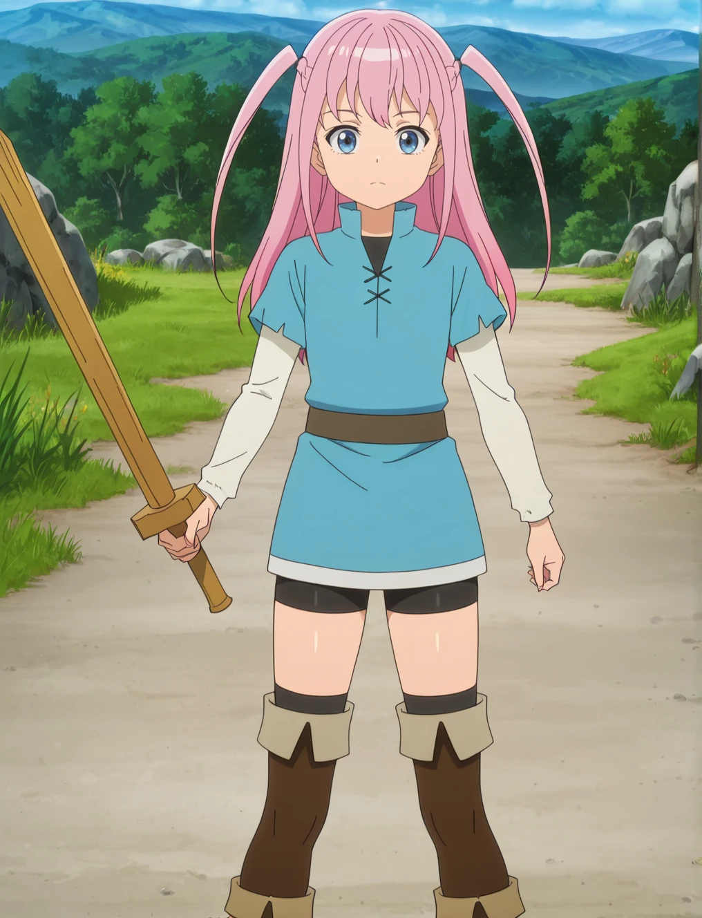 brown footwear, short over long sleeves, layered sleeves, high collar, blue shirt, boots, long sleeves, bike shorts
