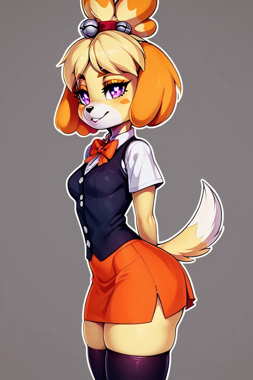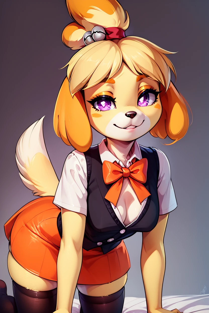 zzFallIsabelle, short hair, blonde hair, animal ears, bow, furry female, dog girl, topknot, purple eyes, skindentation, animal nose, bright pupils, furry, black vest, orange skirt, orange bowtie, white shirt, short sleeves, collared shirt, black thighhighs,
