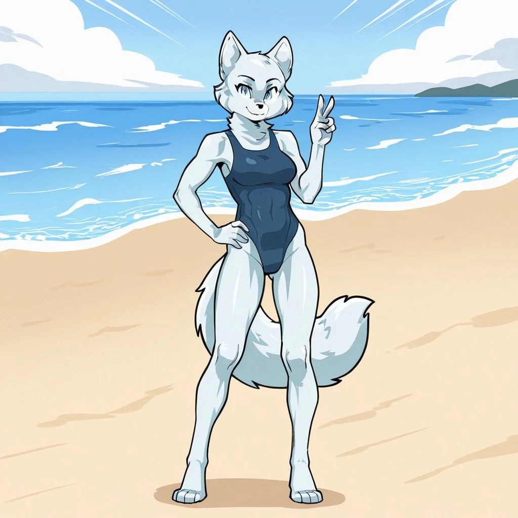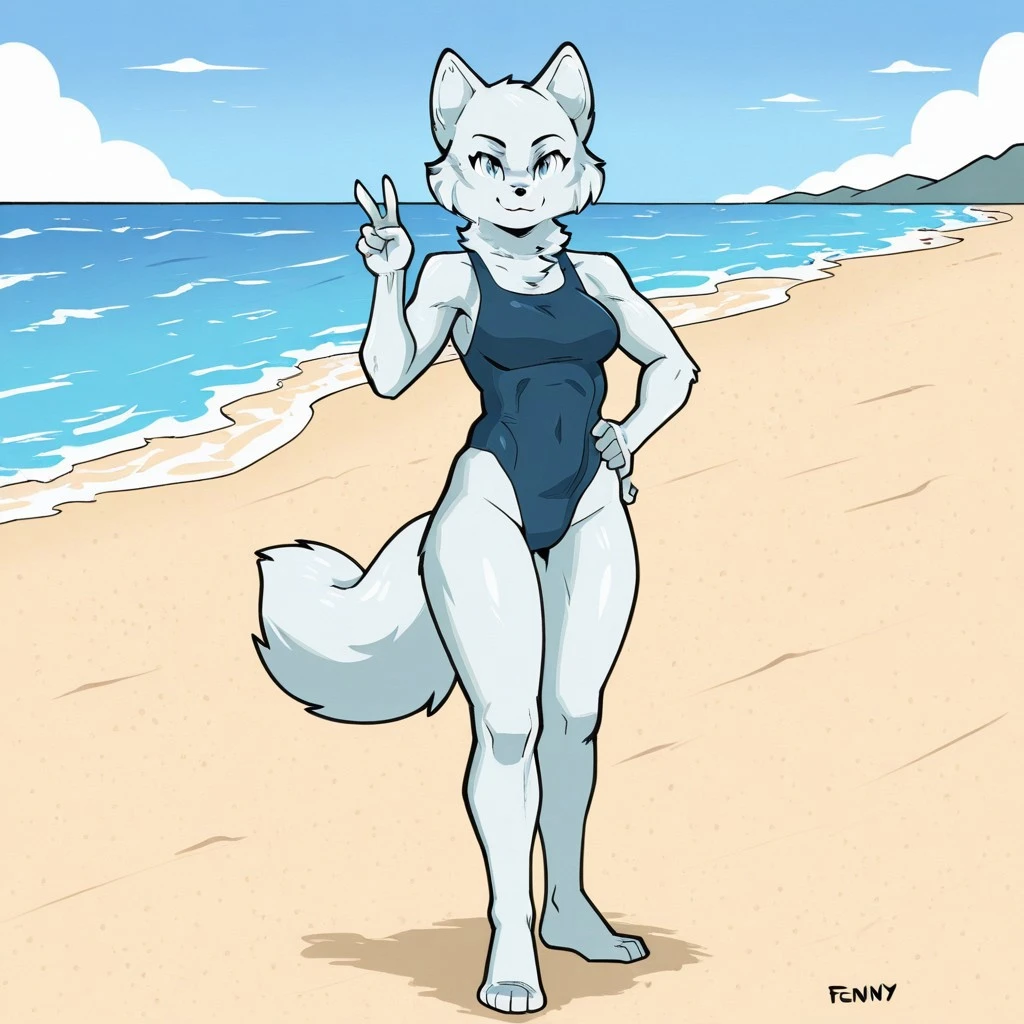arctic fox, fox girl, white fur, blue eyes, black nose, fox ears, fox tail, medium breasts,