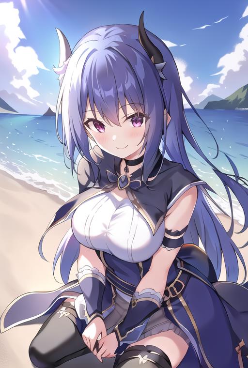 Origin Outfit: "horns, blue hair, choker, capelet, dress, gloves, elbow gloves, sheath, pantyhose, white legwear, black footwear, boots, rei \\(princess_connect!\\),"