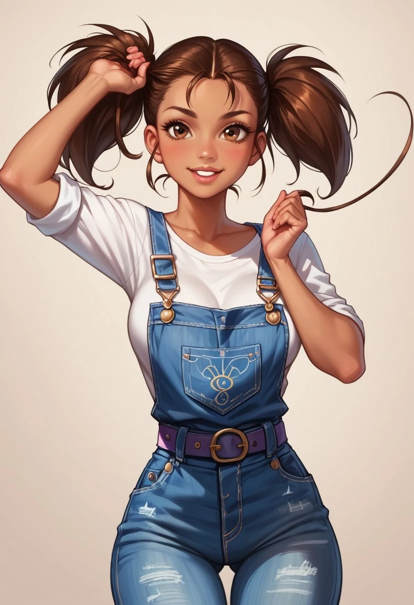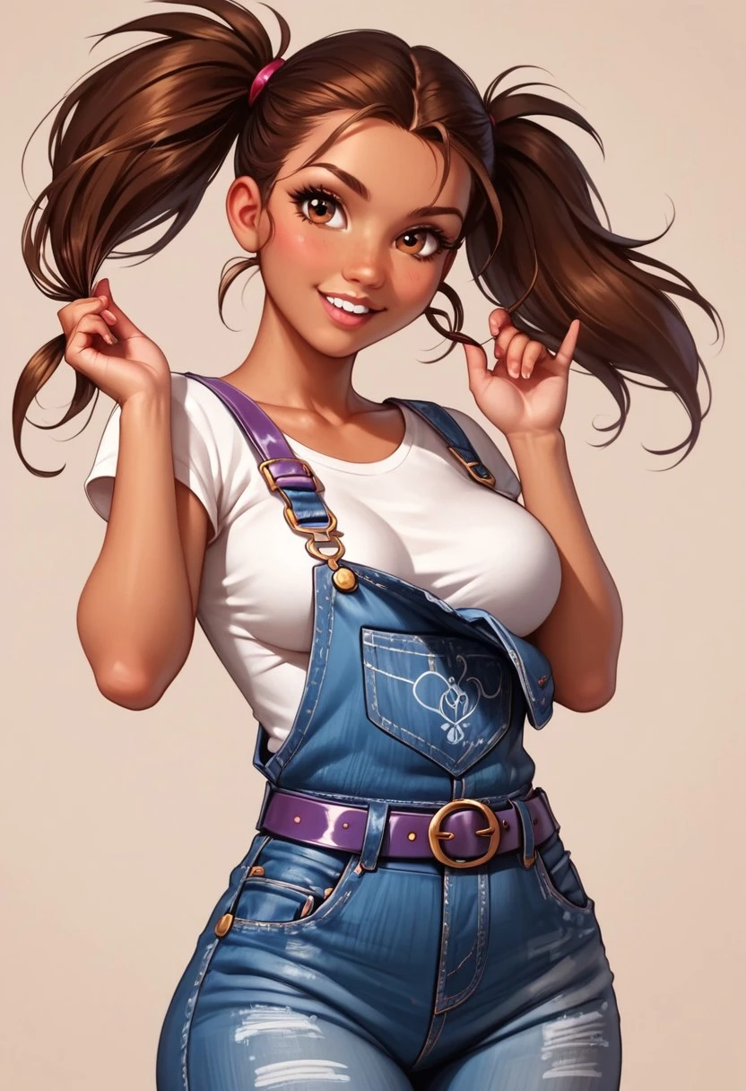 Manon Chamack, tan skin female, brown hair, hair pulled back into two ponytails, two ponytails, golden-brown eyes, two upper front buck teeth, white t-shirt, rolled-up sleeves, purple denim overalls with pink flower patterns, purple belt, red shoes with black soles,