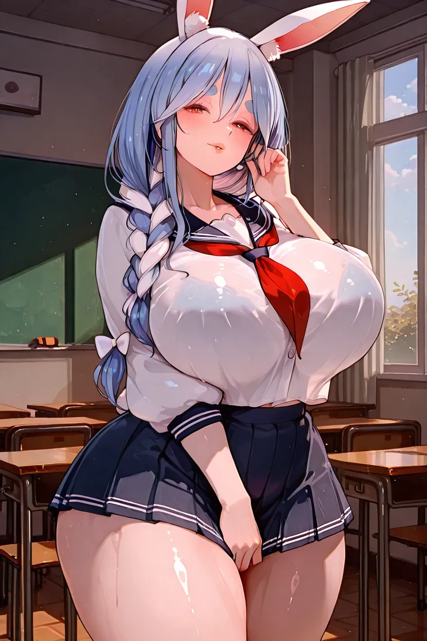 1girl, Usada_Pekora (Hololive), mature Female, red eyes. two toned_eyes, orange_eyes, rabbit_girl, animal_ears, rabbit_ears, blue_hair, animal_ear_fluff, lips, glossy lips, thick lips, massive_breasts, hololive_art_style, 4k, HD, high-resolution, superb quality, anime_drawn