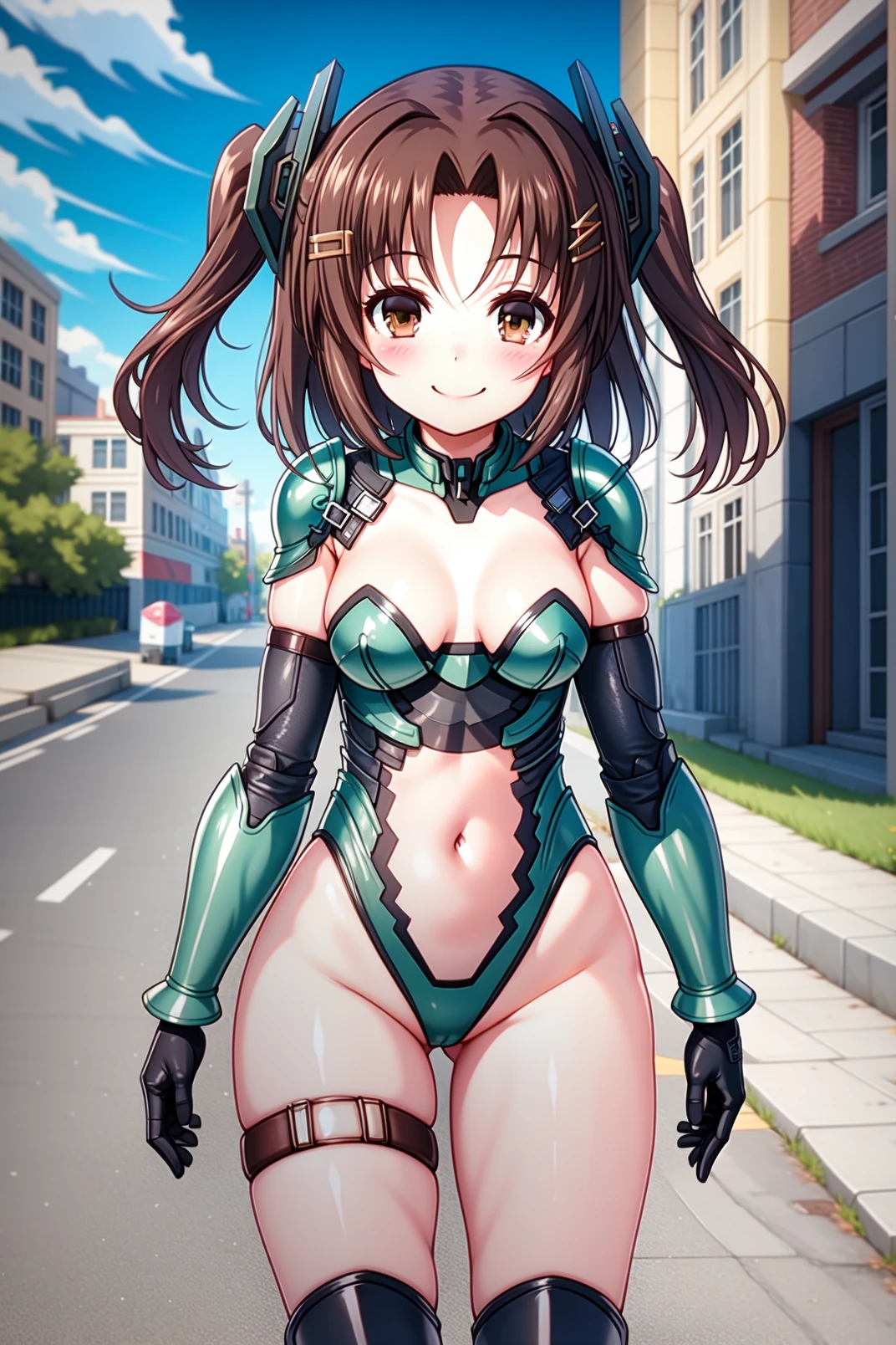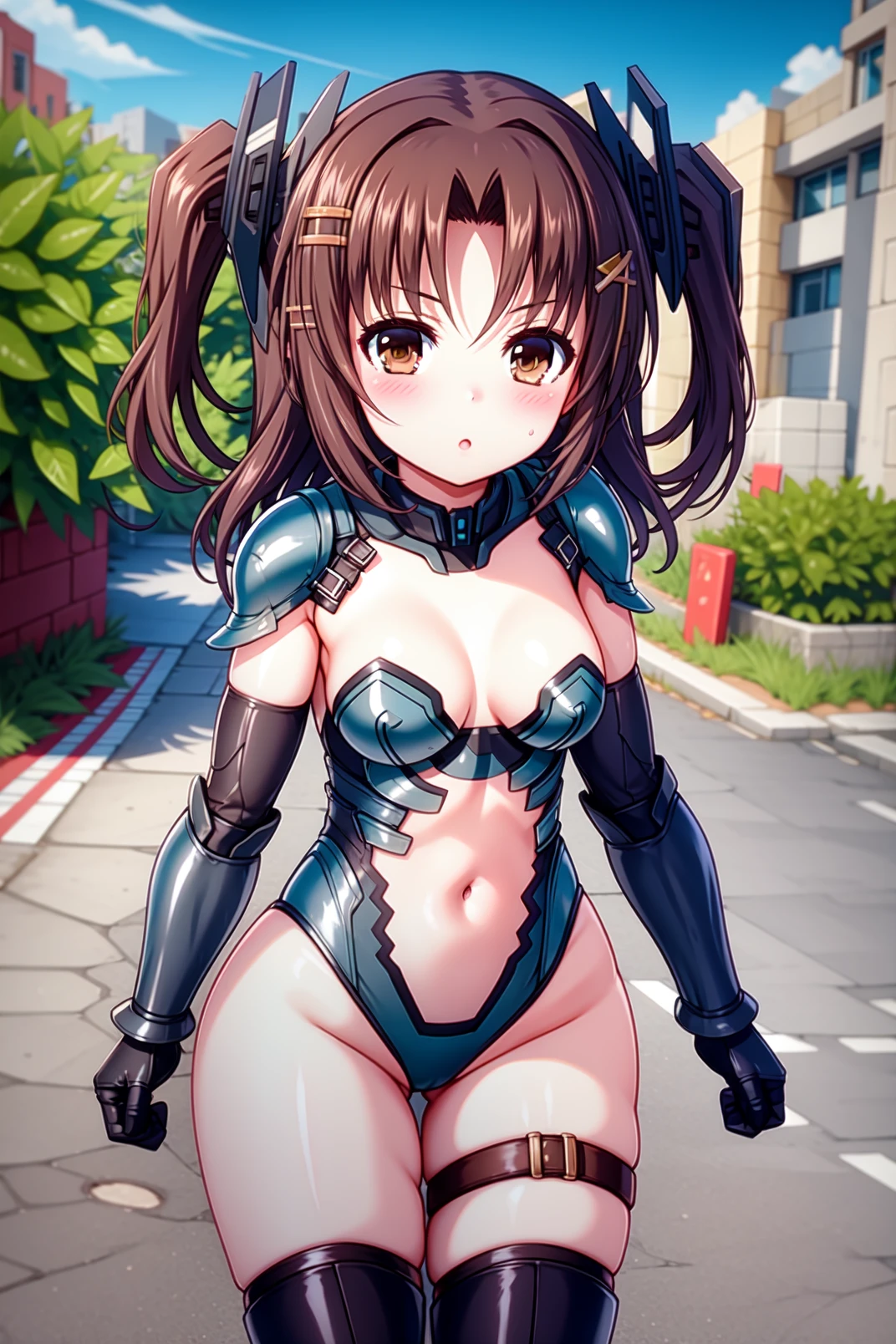 AST: grey leotard, armor, shoulder armor, leotard, see-through, covered navel, skindentation, hair ornament, headgear, grey thighhighs, thighhighs, thigh boots, armored boots, thigh strap, black gloves, elbow gloves