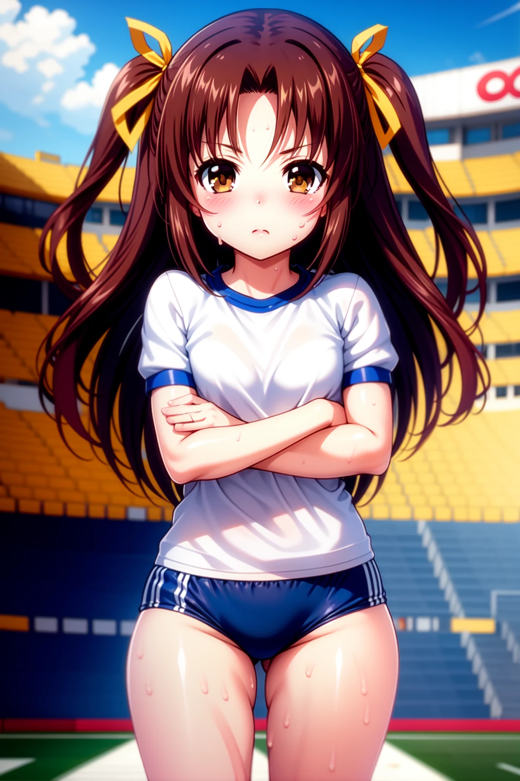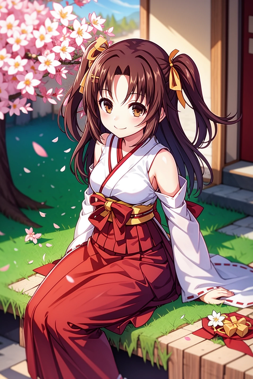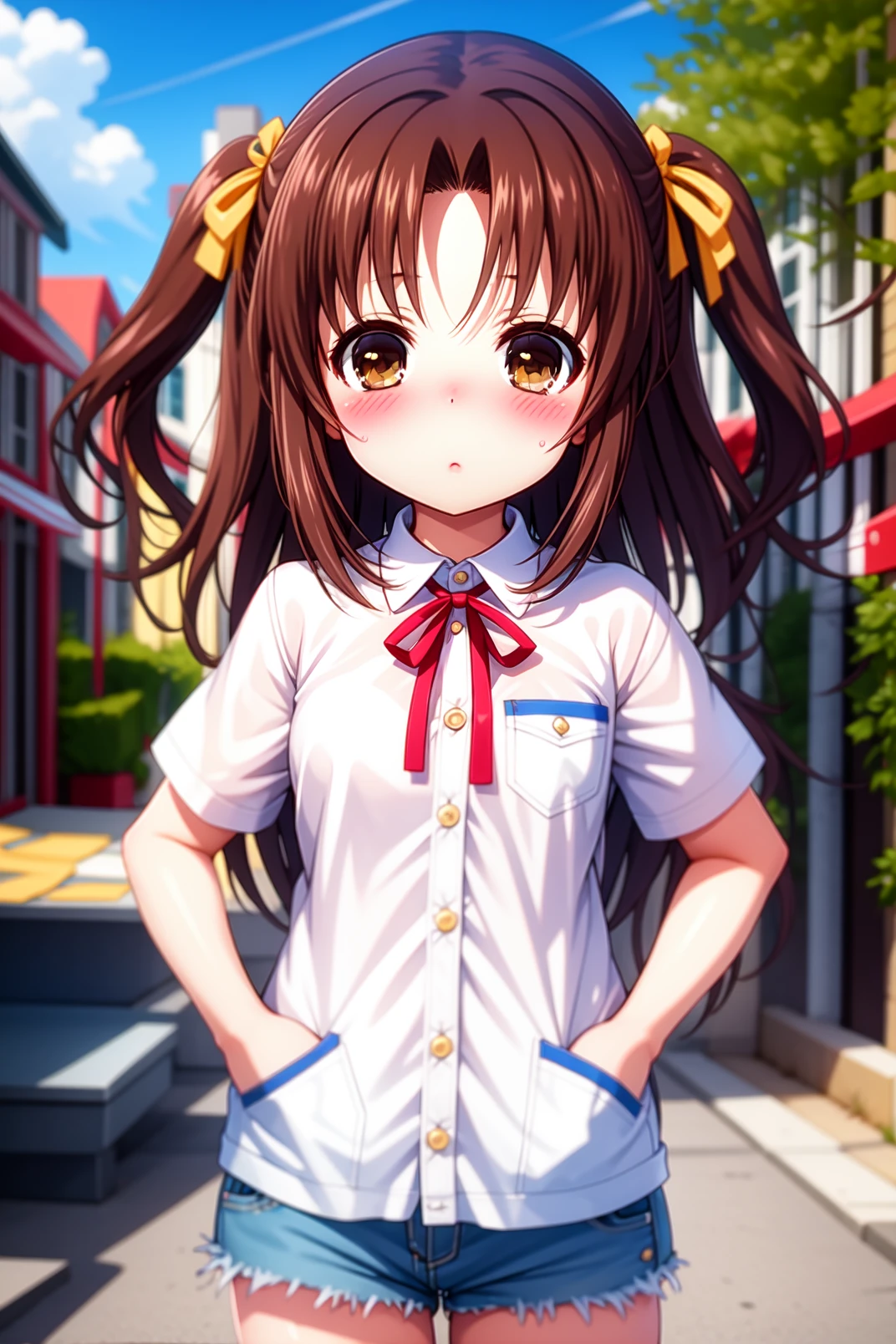 mikie, brown eyes, brown hair, medium hair, parted bangs, two side up