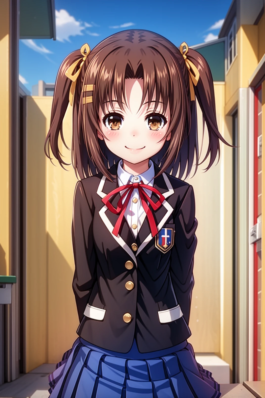hair ribbon, yellow ribbon, school uniform, blazer, black jacket, pleated skirt, blue skirt