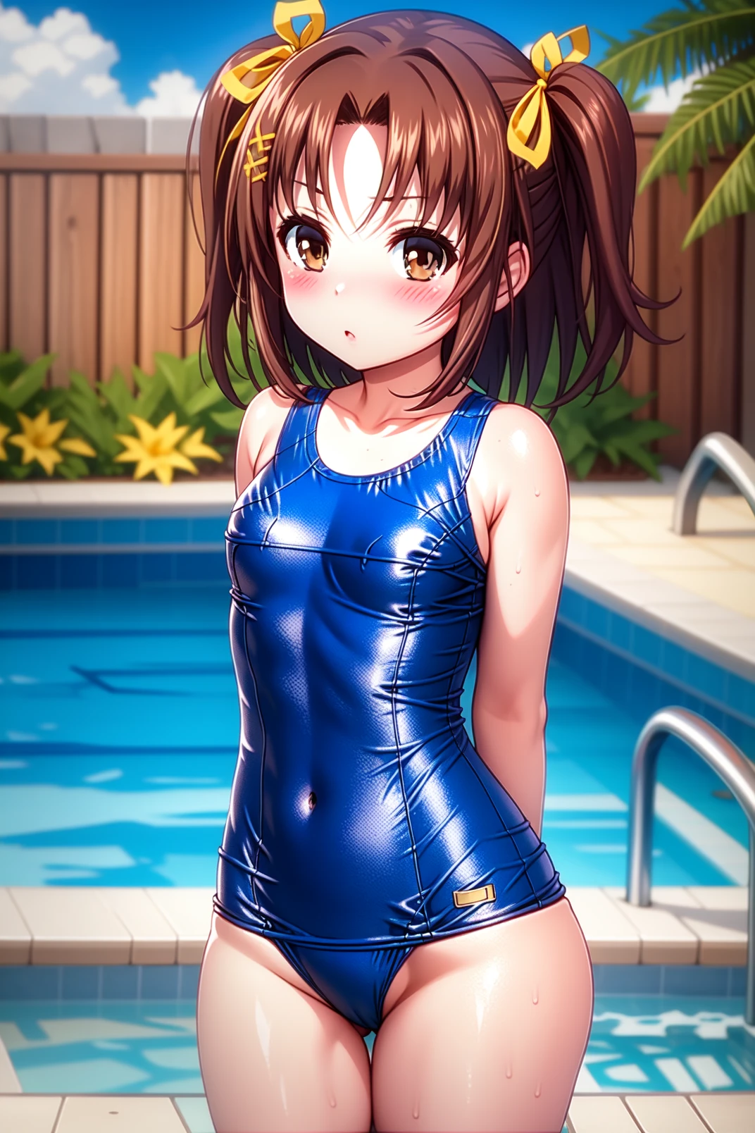 school outfit: hair ribbon, yellow ribbon, school uniform, blazer, black jacket, pleated skirt, blue skirt