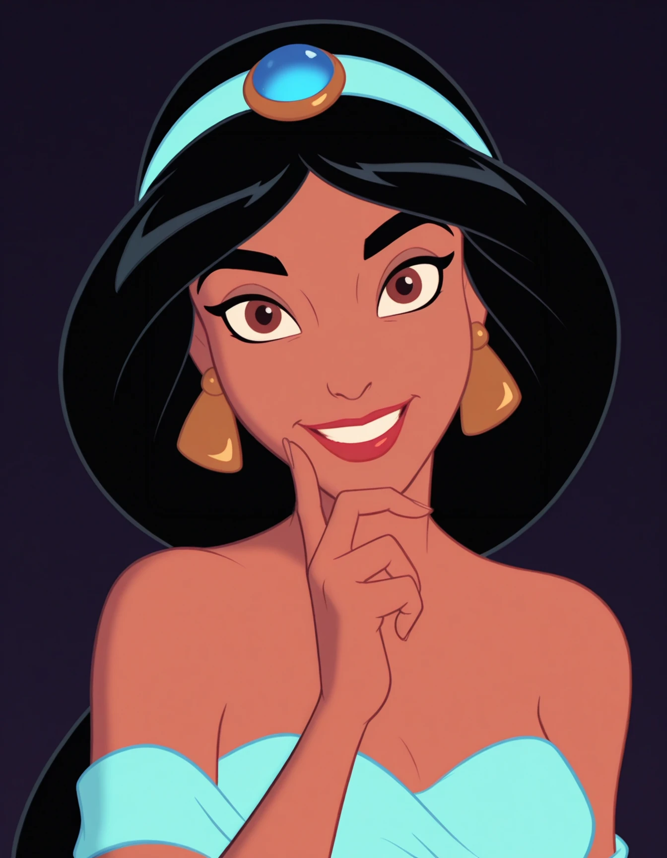 xeqjasminex, black hair, very long hair, high ponytail, brown eyes, earrings, tiara, lipstick, dark-skinned female
