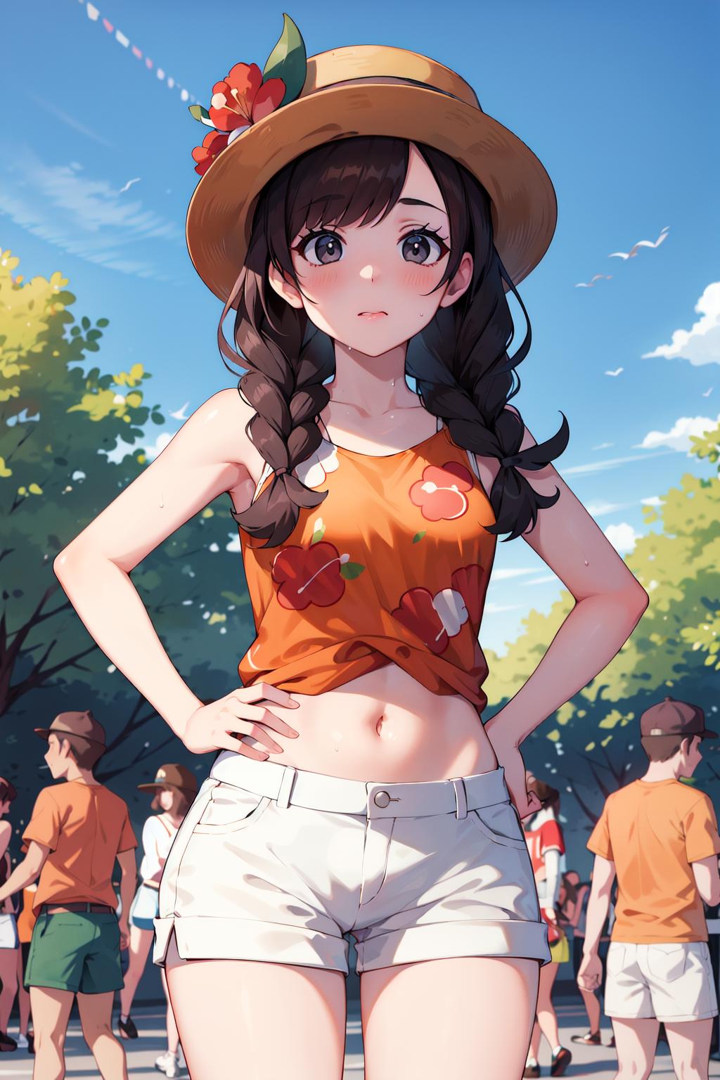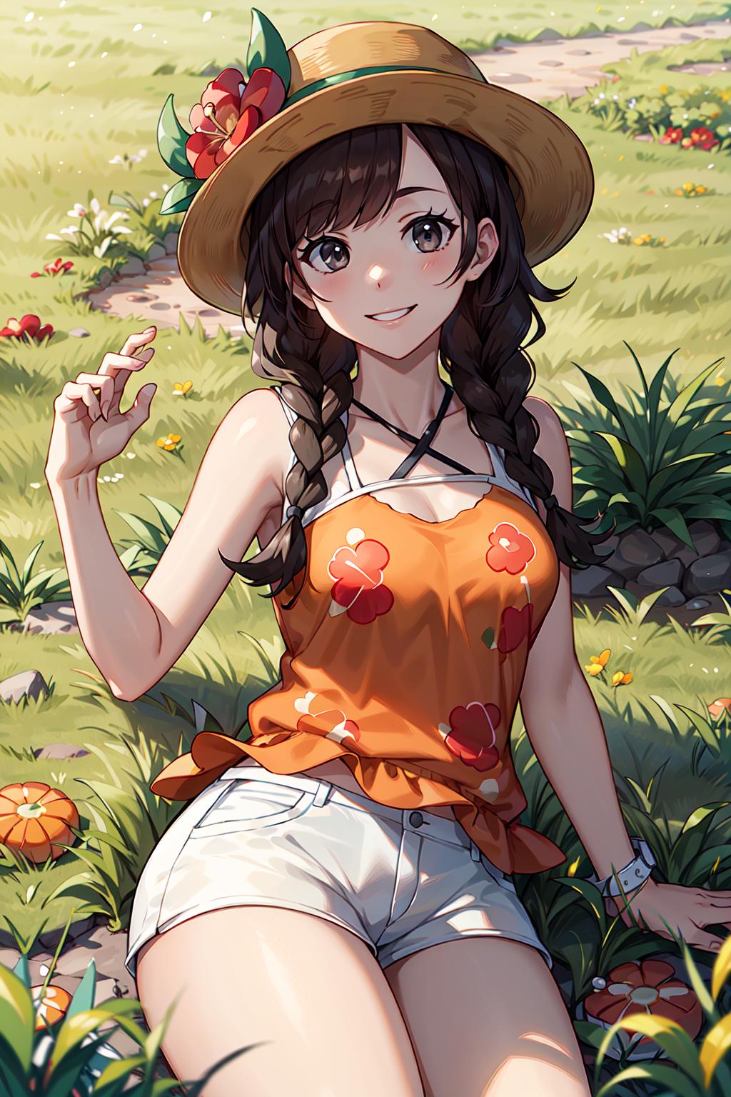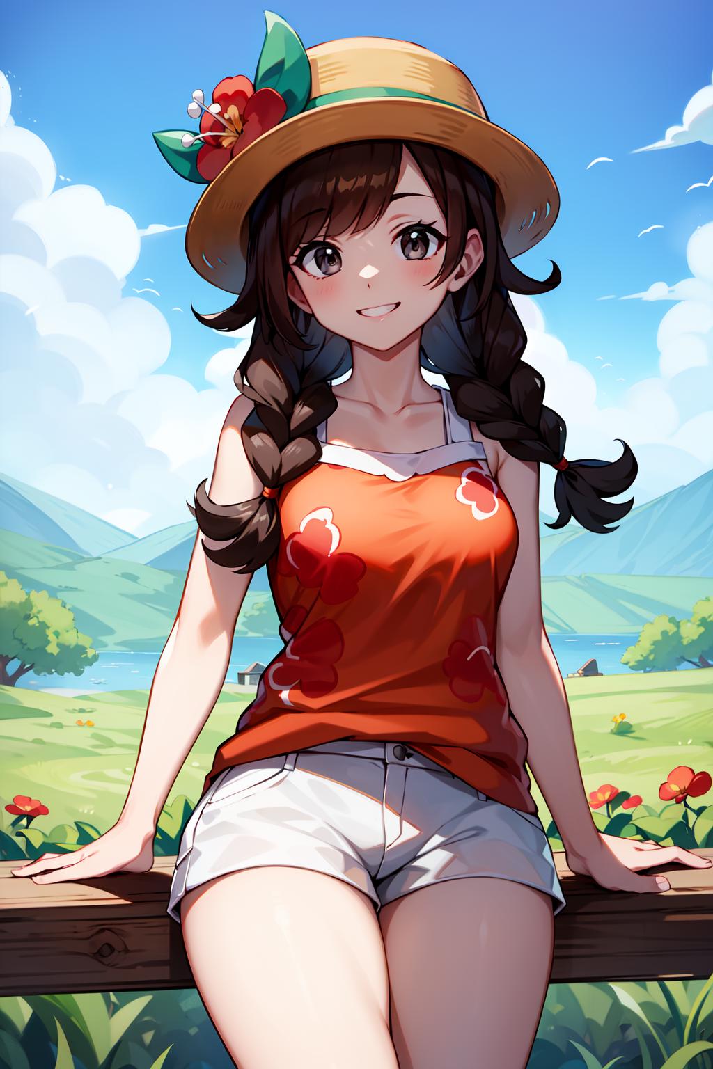 selene2, 1girl, solo, white shorts, selene \(pokemon\), twin braids, shirt, hat flower, long hair, bangs, red flower, orange shirt, eyelashes, sleeveless, brown hair, brown headwear, grey eyes, sleeveless shirt, short shorts, jewelry