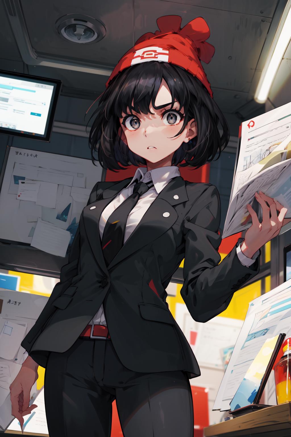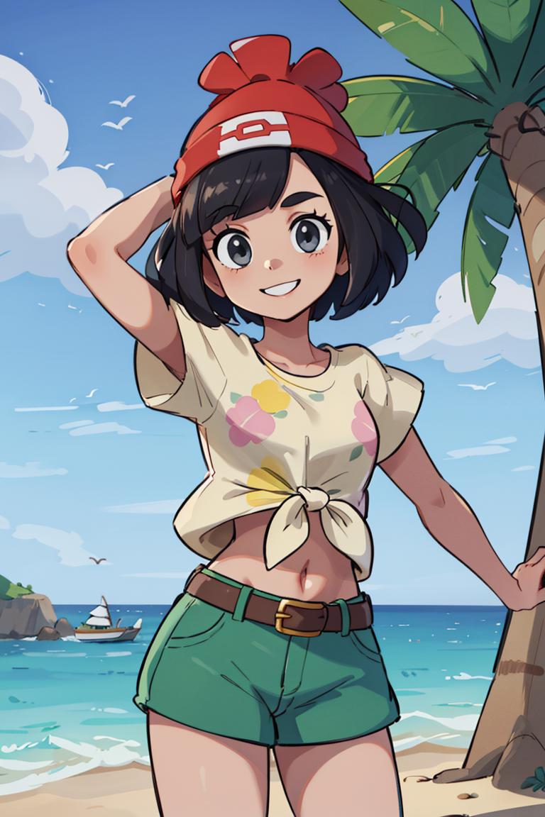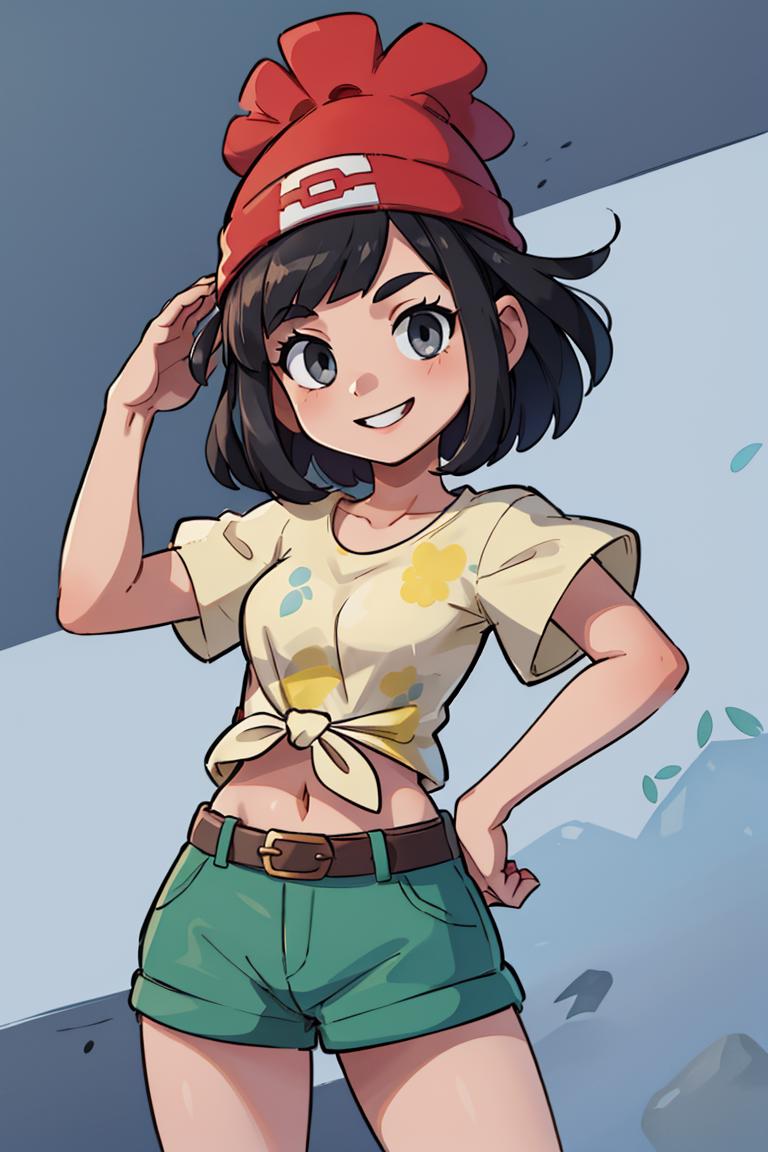 selene1, 1girl, selene \(pokemon\), solo, grey eyes, black hair, green shorts, red headwear, beanie, shirt, tied shirt, floral print, short hair, short sleeves, short shorts, striped, yellow shirt, belt, midriff