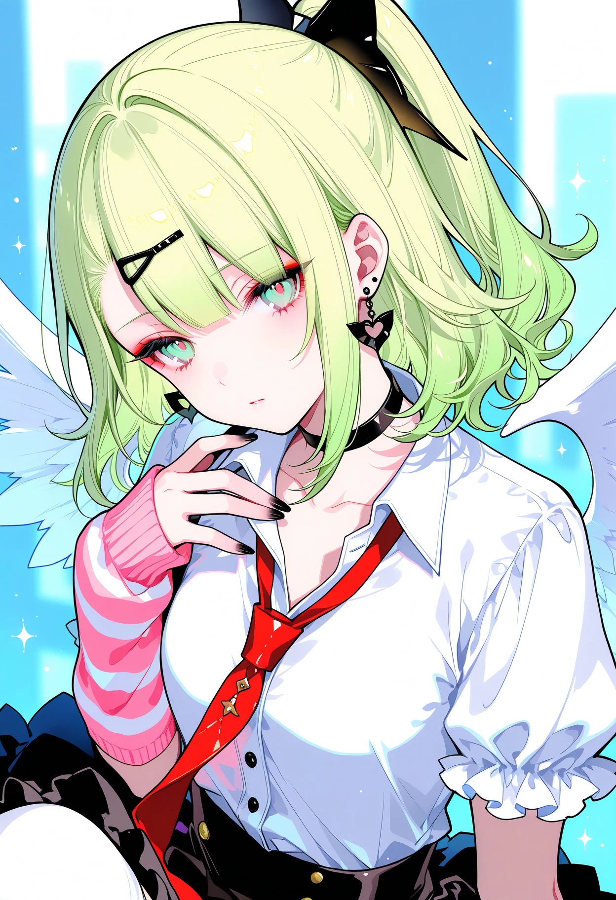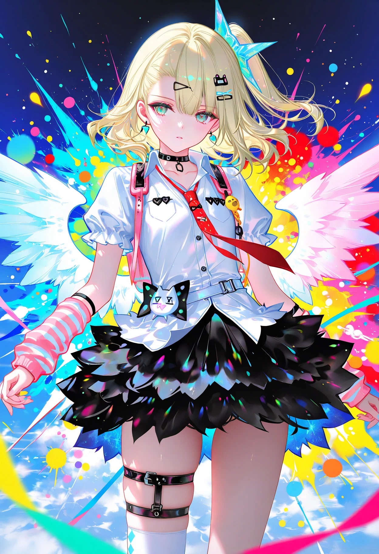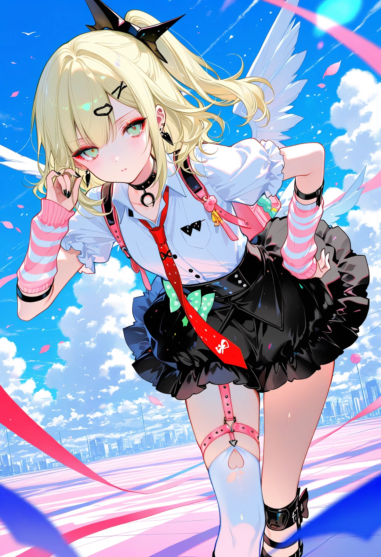 sunna,(thigh strap, bow),blonde hair,hair ornament,white shirt, red necktie, hairclip, collared shirt,jewelry, wings, one side up,choker, single thighhigh, earrings, asymmetrical legwear, arm warmers, black choker, nail polish, collarbone, white thighhighs, black skirt, puffy short sleeves, puffy sleeves,