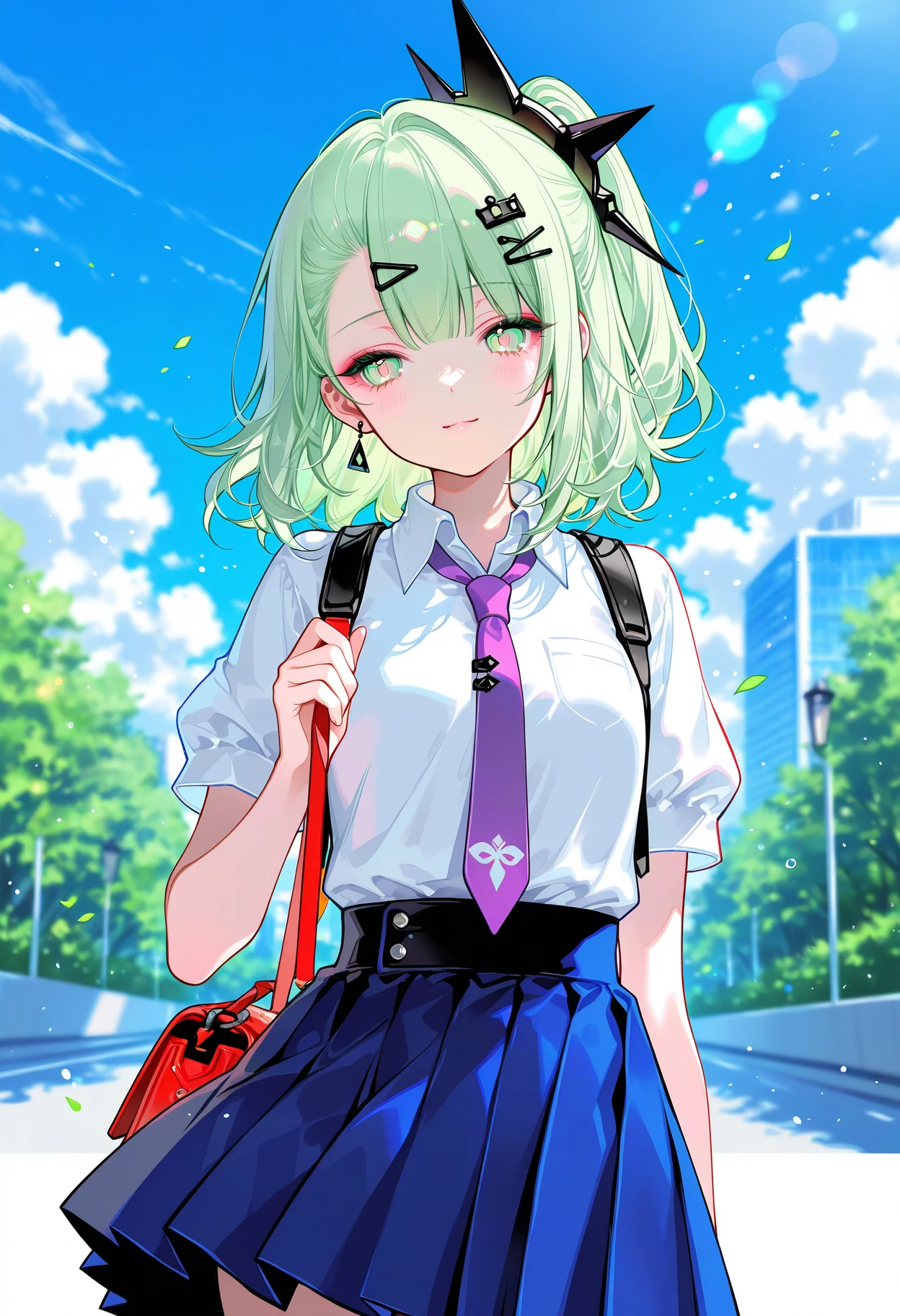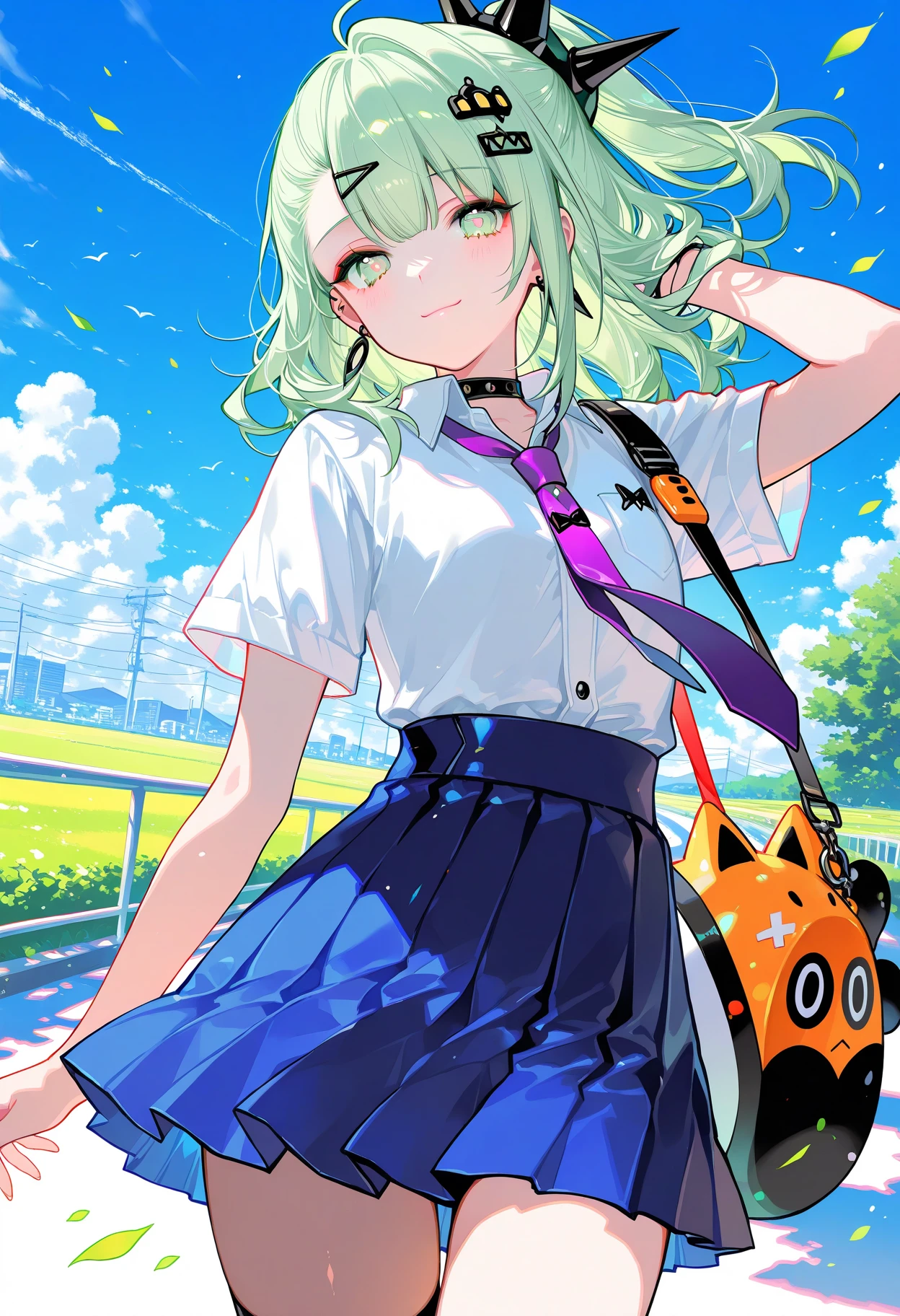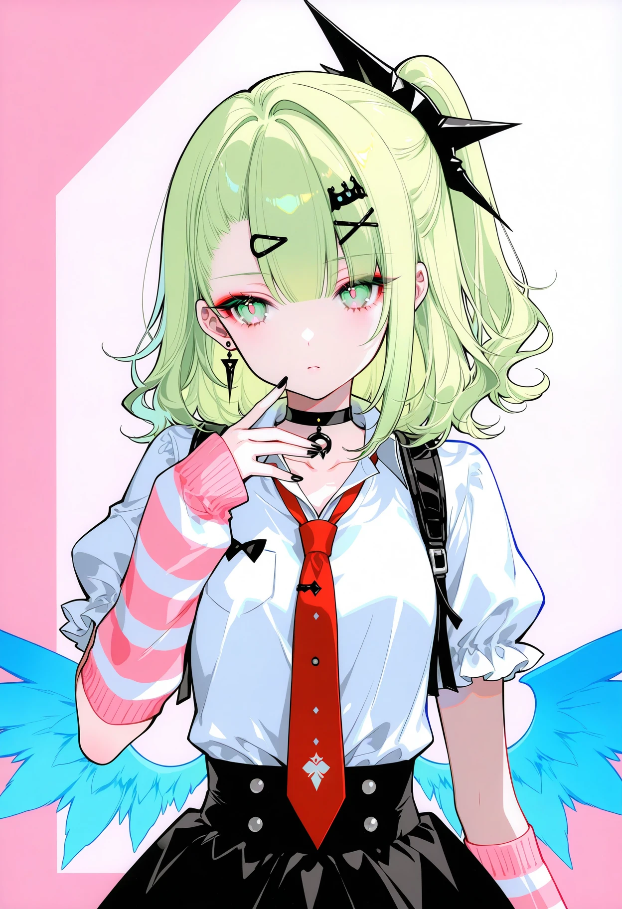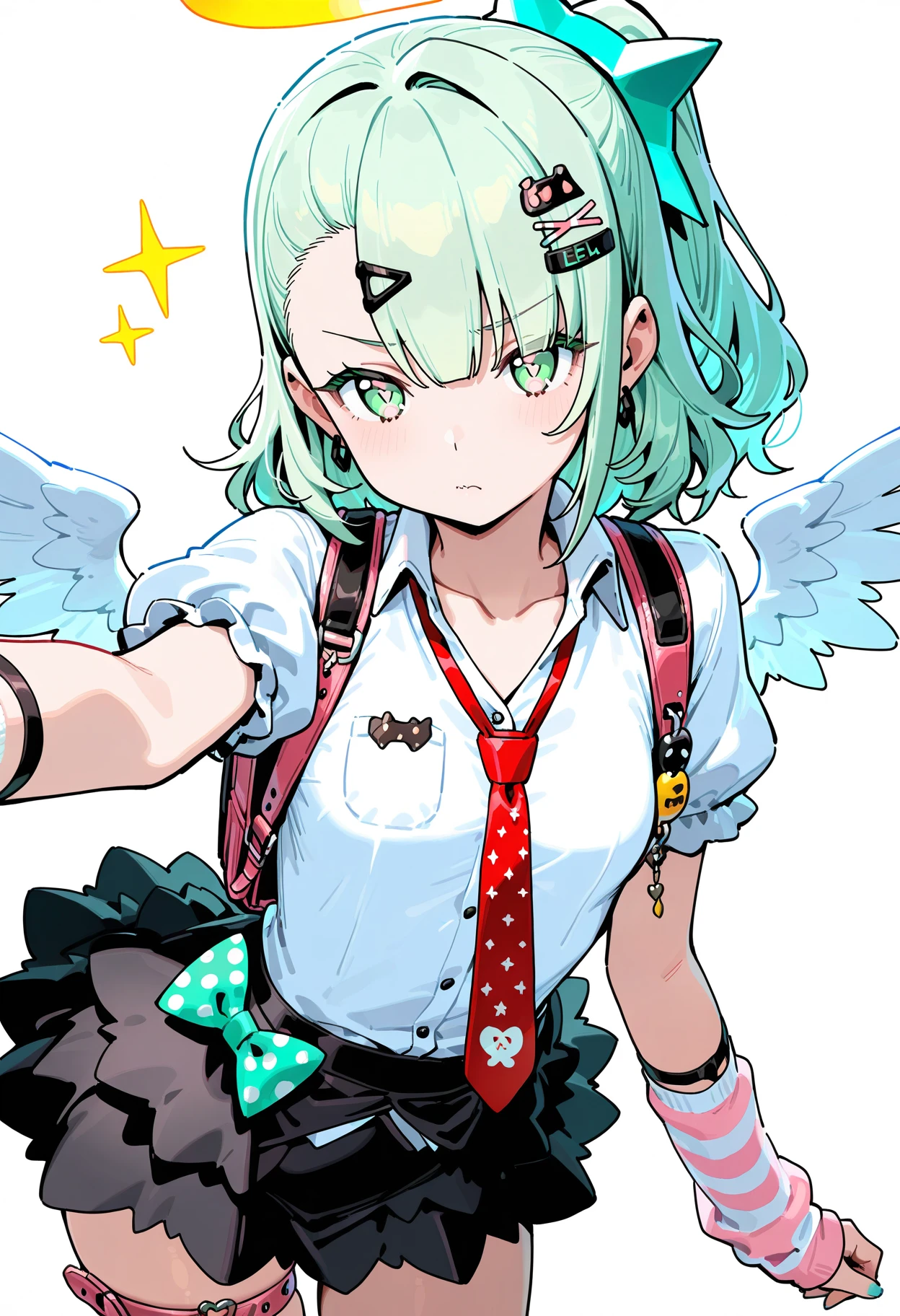 sunna,(thigh strap, bow),blonde hair,hair ornament,white shirt, red necktie, hairclip, collared shirt,jewelry, wings, one side up,choker, single thighhigh, earrings, asymmetrical legwear, arm warmers, black choker, nail polish, collarbone, white thighhighs, black skirt, puffy short sleeves, puffy sleeves,