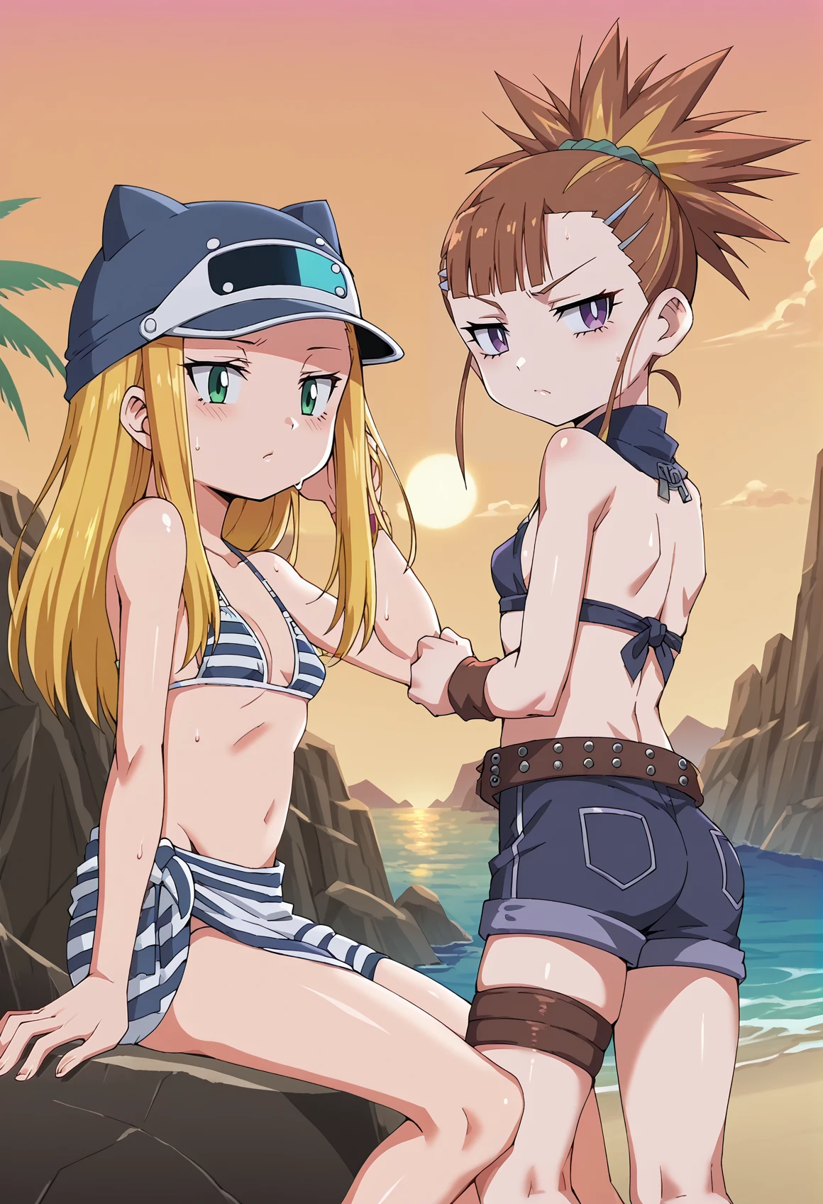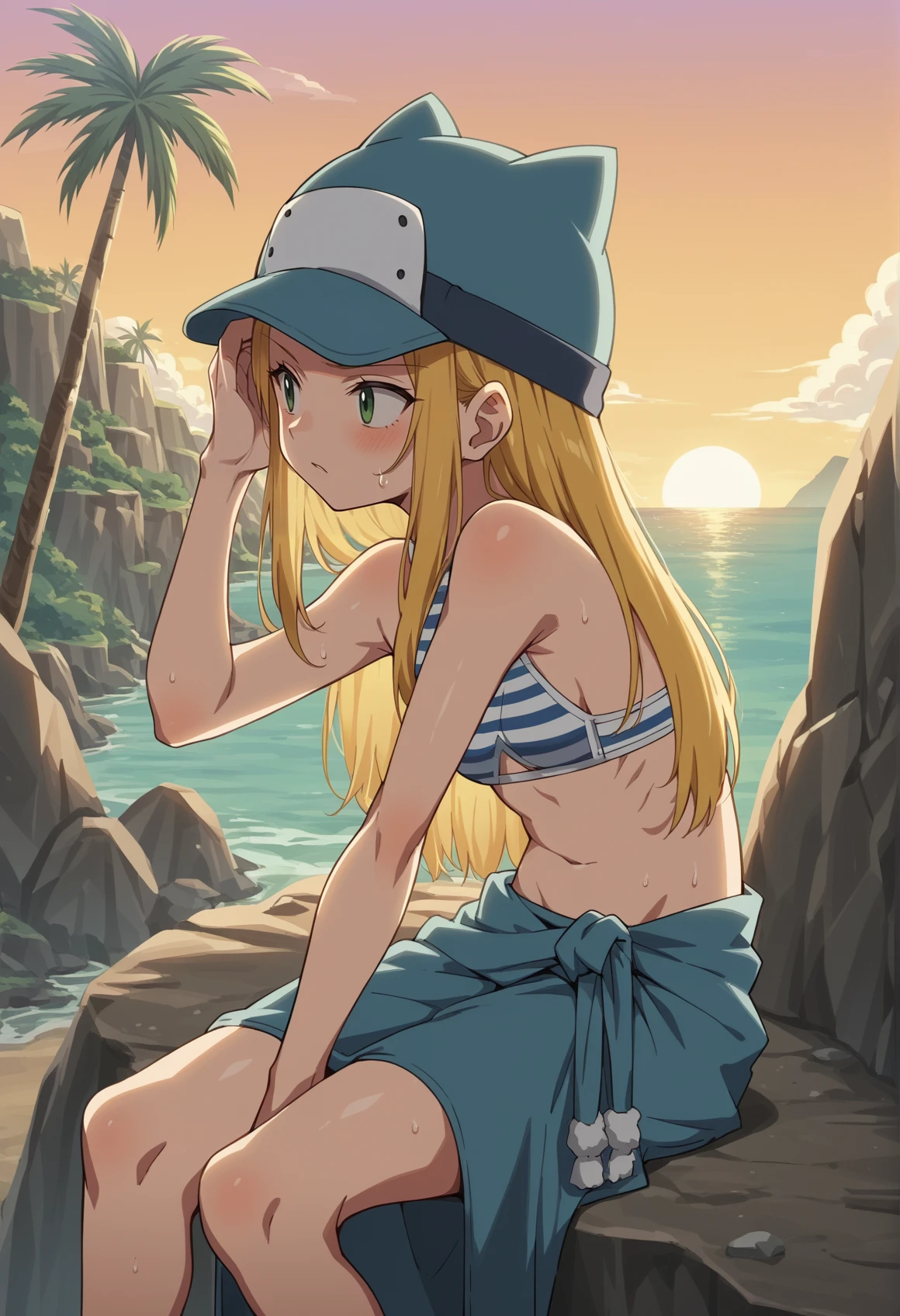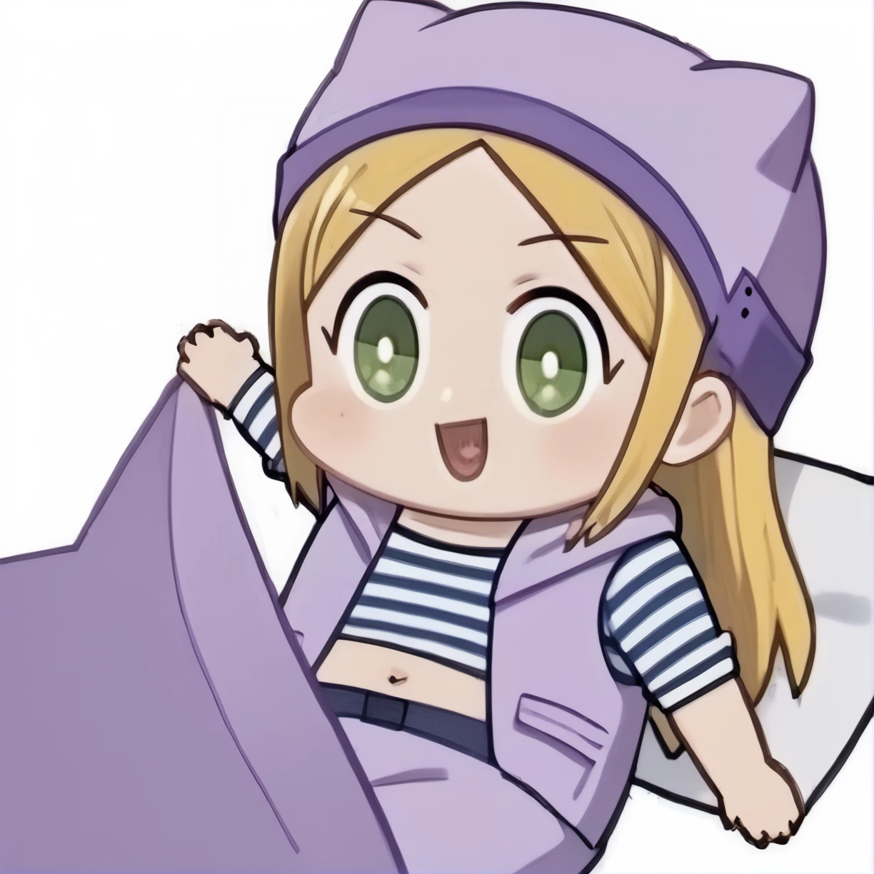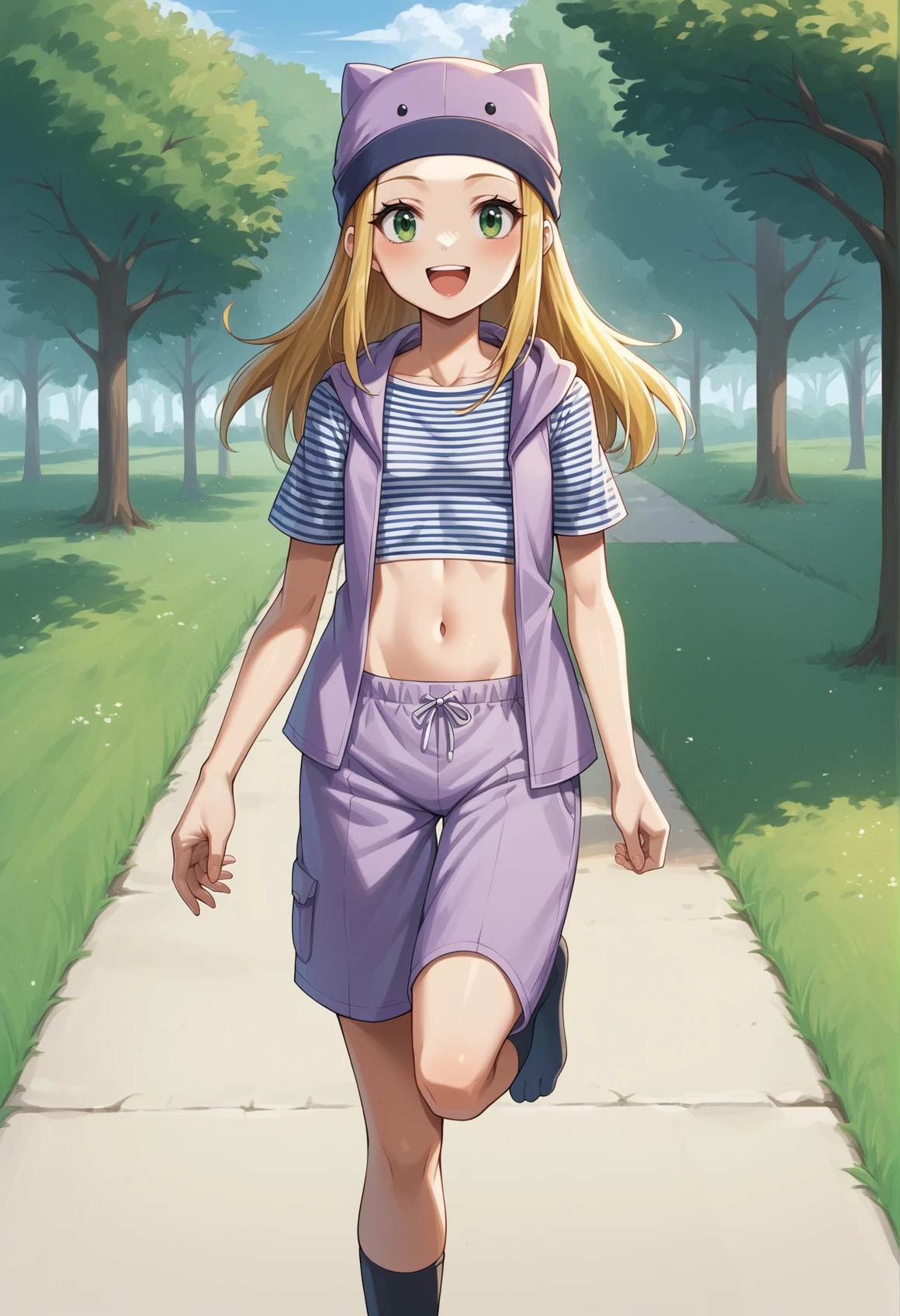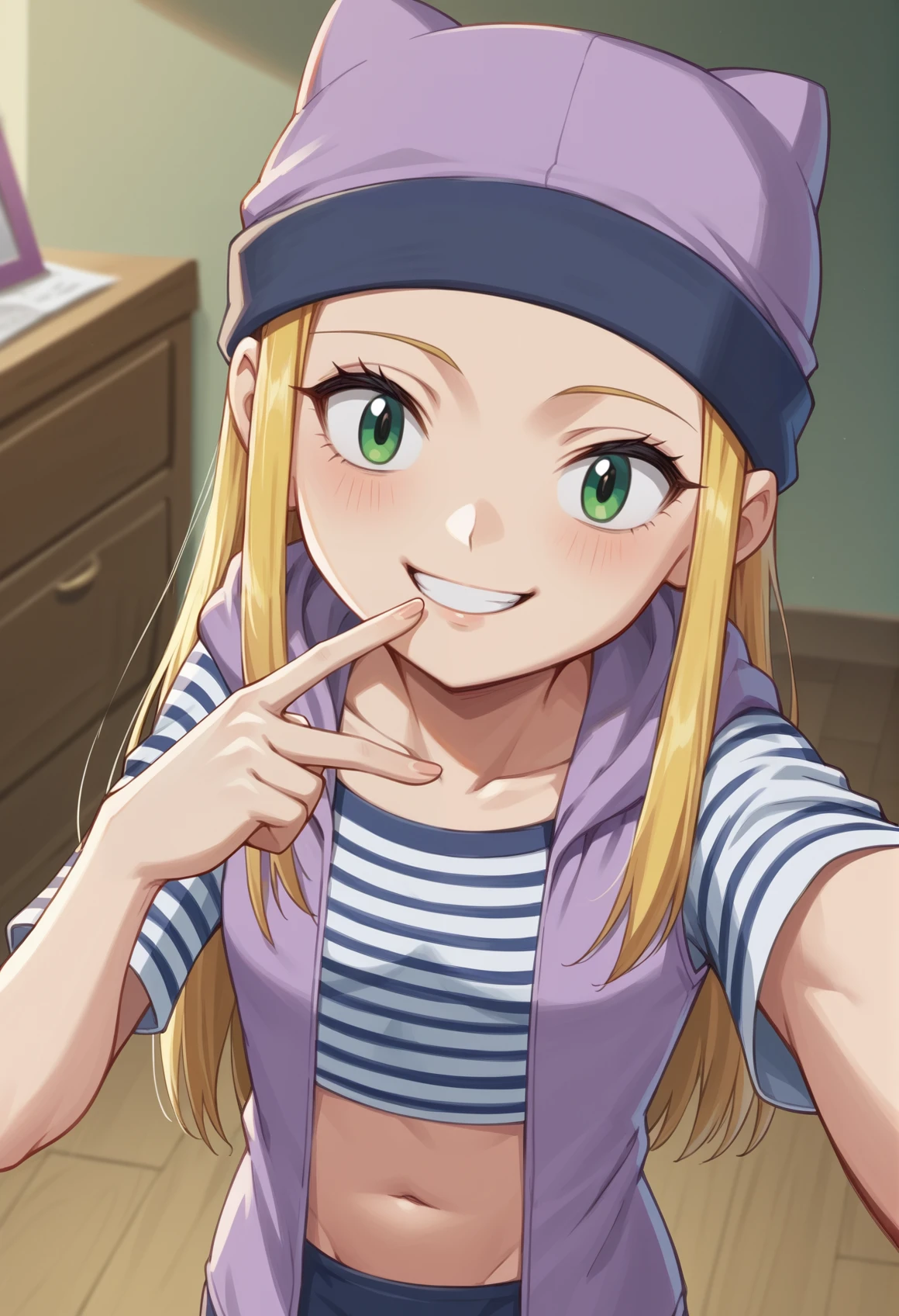 long hair, blonde hair, green eyes, animal hat, striped shirt, purple vest, navel, miniskirt