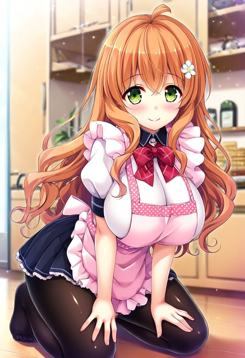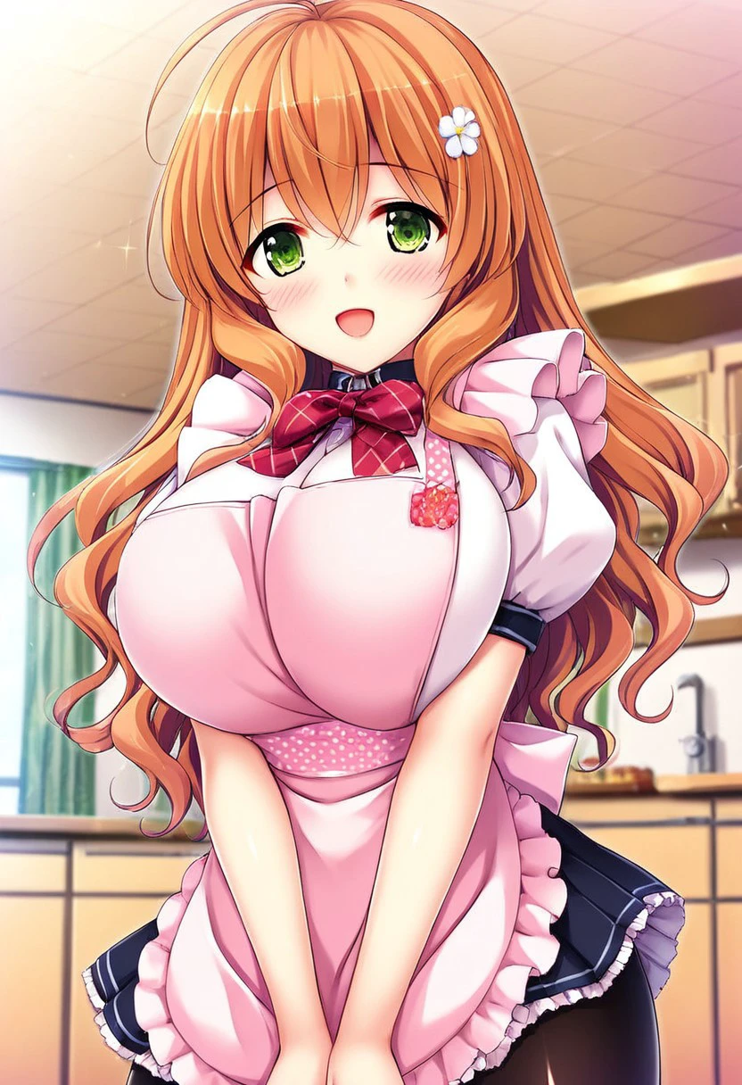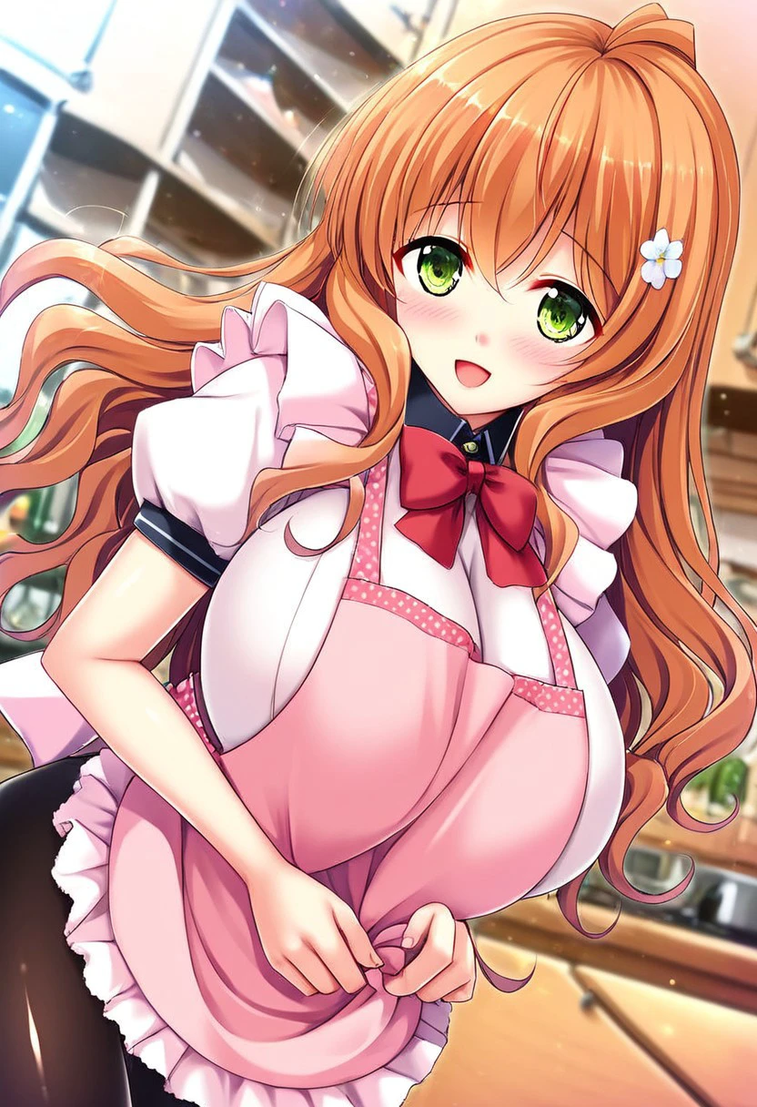 Outfit 2: pink apron, full apron, red bow, school uniform, shirt, puffy sleeves, short sleeves, pleated miniskirt, miniskirt, black pantyhose, white shirt, white sleeves,