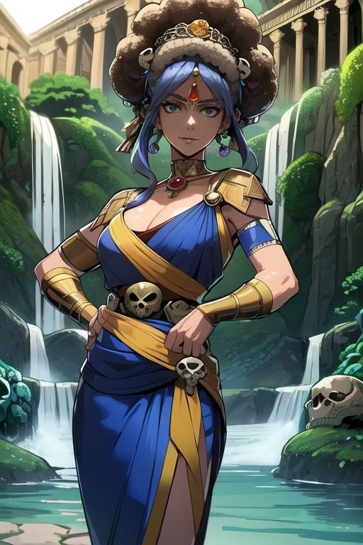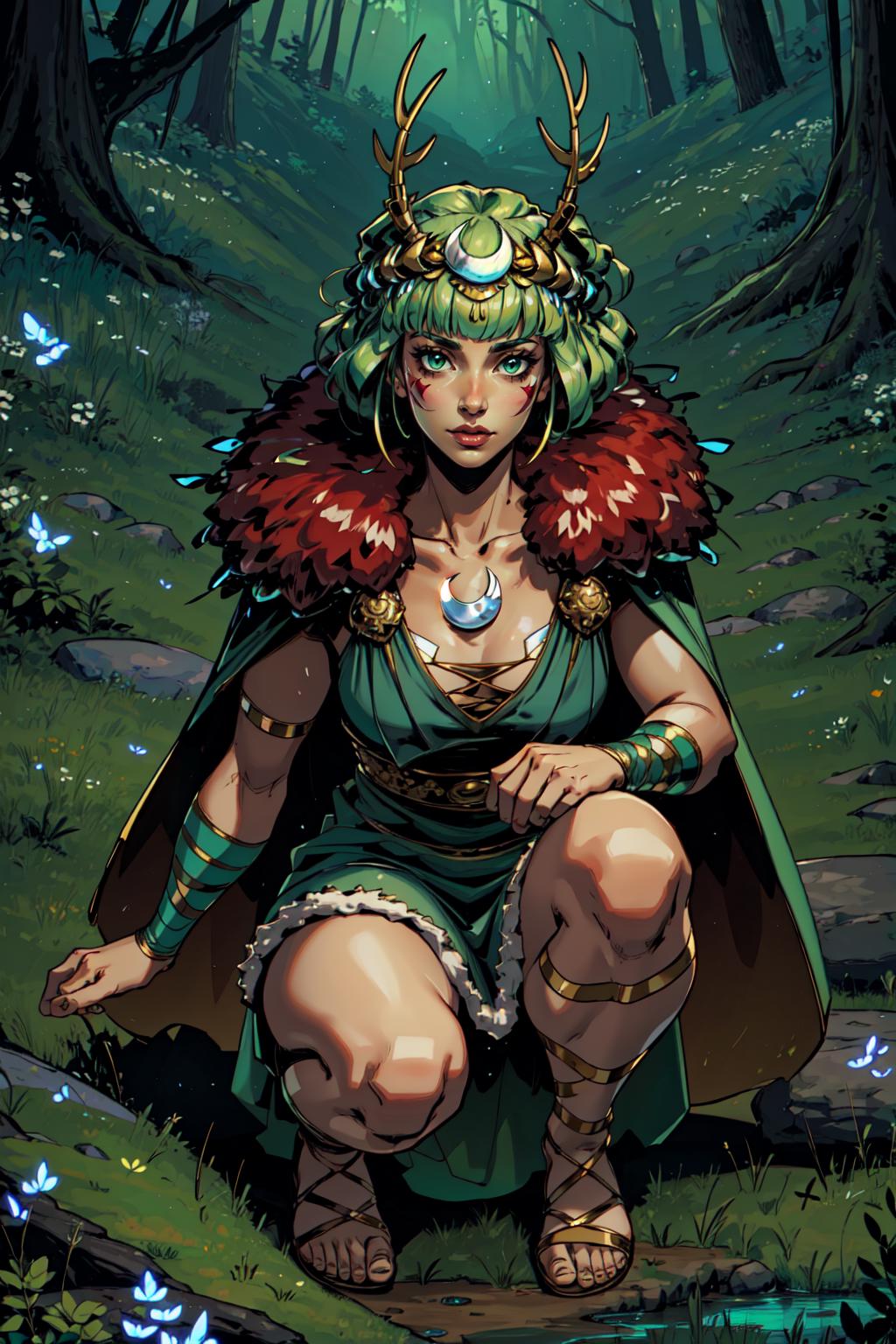 laurels crown, toga, dress, greaves, animal on the shoulder, glowing feet, skulls, fury (Meg and her sisters were tagged with this one)