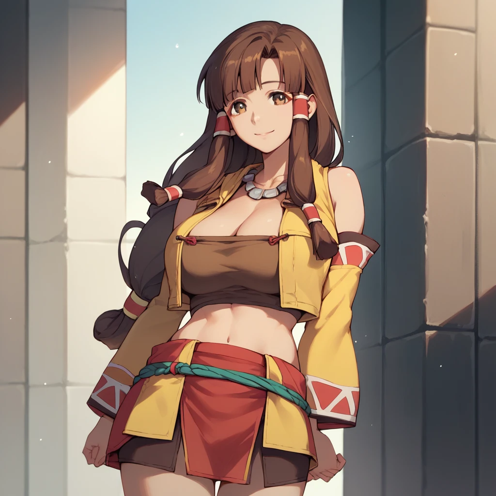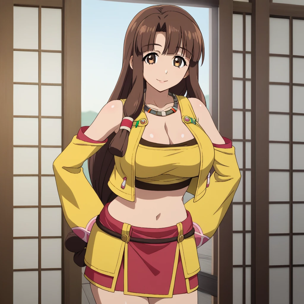 Default Outfit) - yellow jacket, open jacket, red crop top, detached sleeves, long sleeves, necklace, cleavage, bare shoulders, midriff, red skirt, sandals