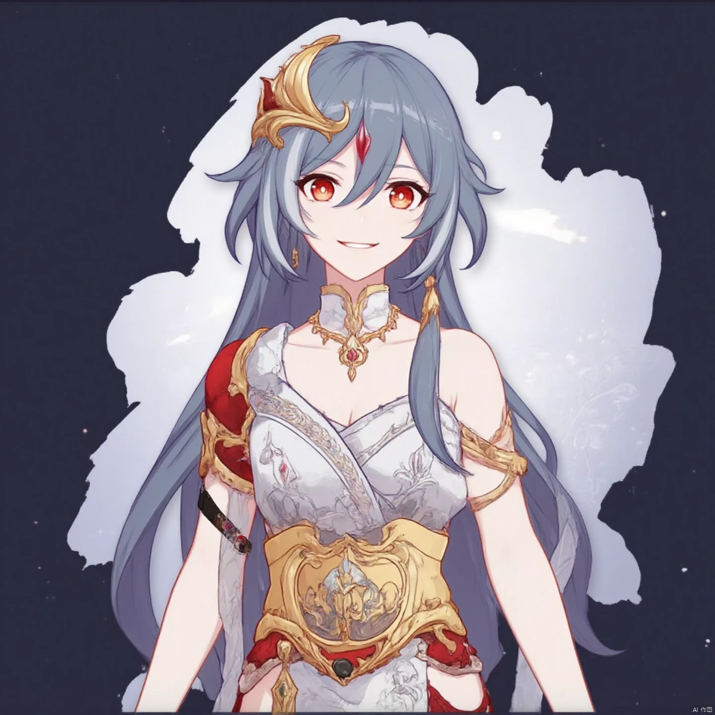 senti,fu_hua,long hair,smile, bangs, hair ornament, red eyes,hair between eyes,ponytail, silver hair,white hair,gray hair,multicolored hair,small breasts,streaked hair,yellow pupils,diamond shaped pupils,