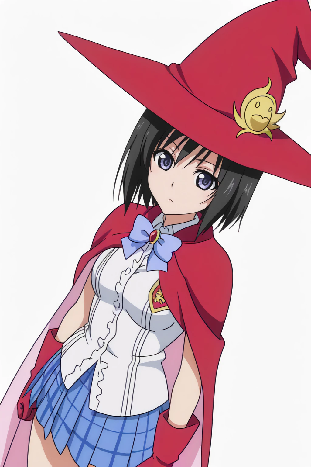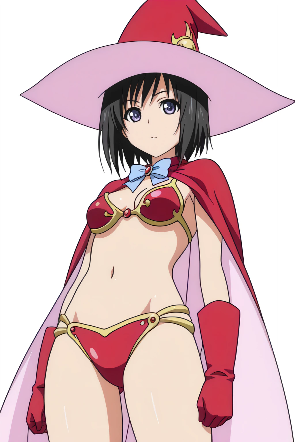 bow, gloves, pink cape, pink headwear, short hair, witch hat