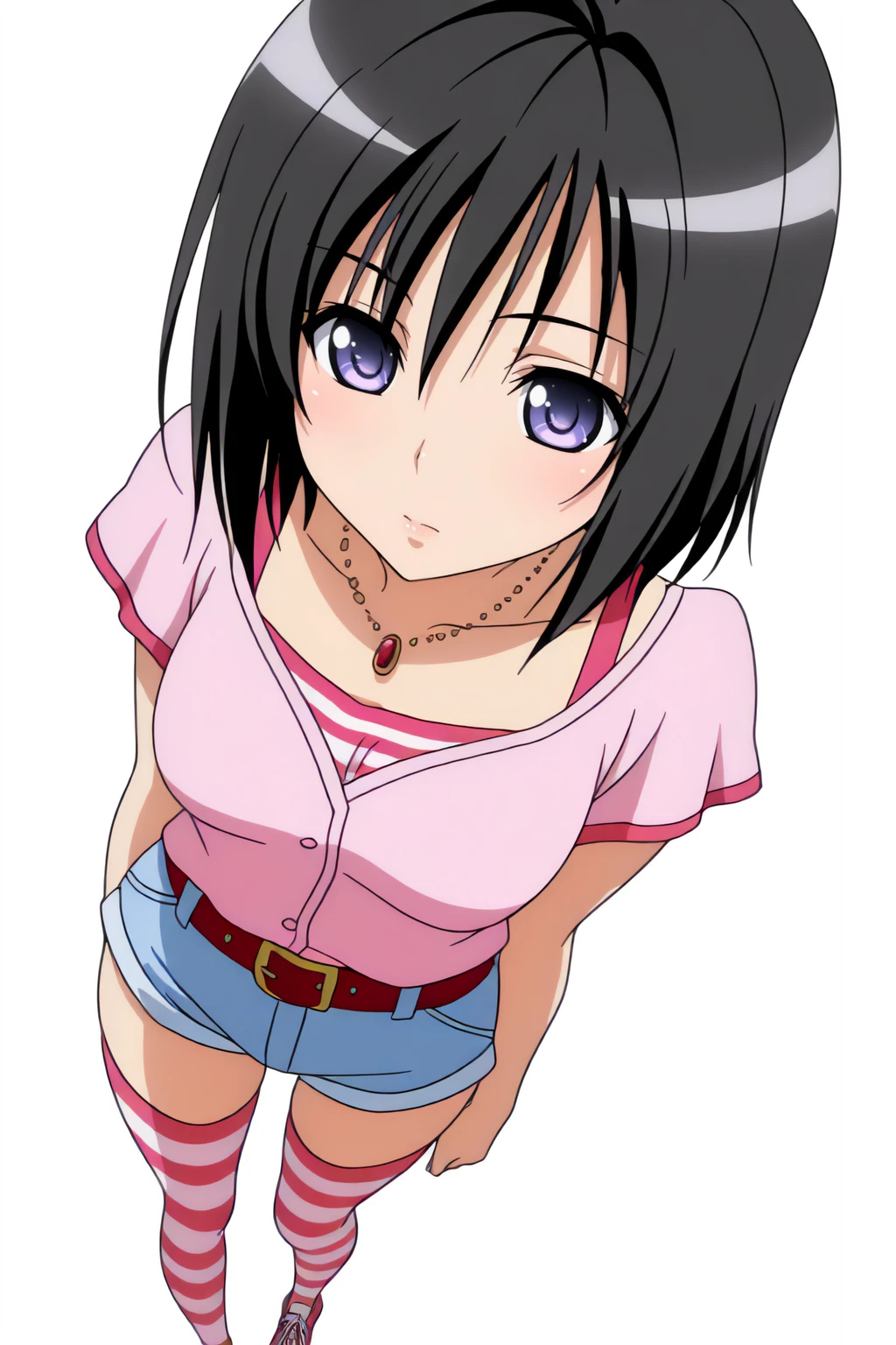 belt, jewelry, necklace, pink shirt, shoes, short hair, shorts, striped clothes, thighhighs