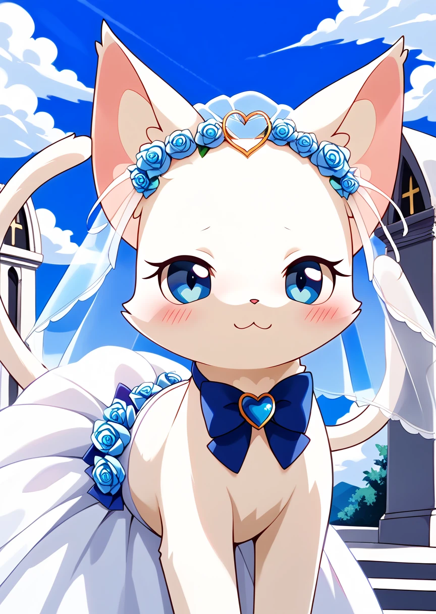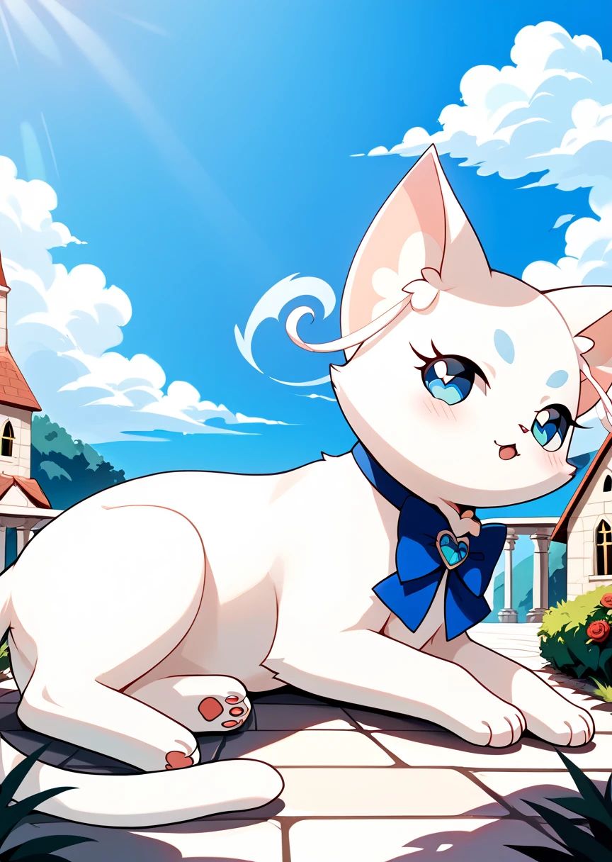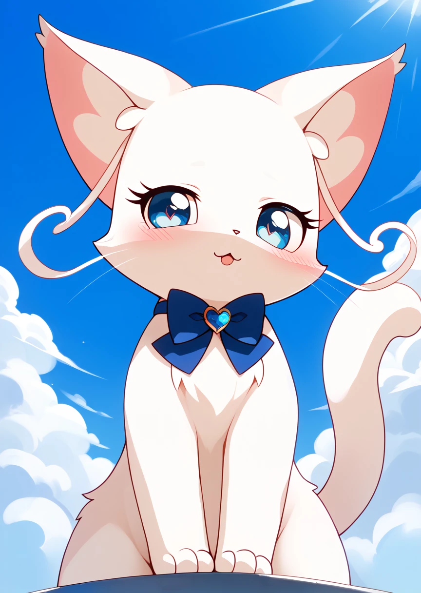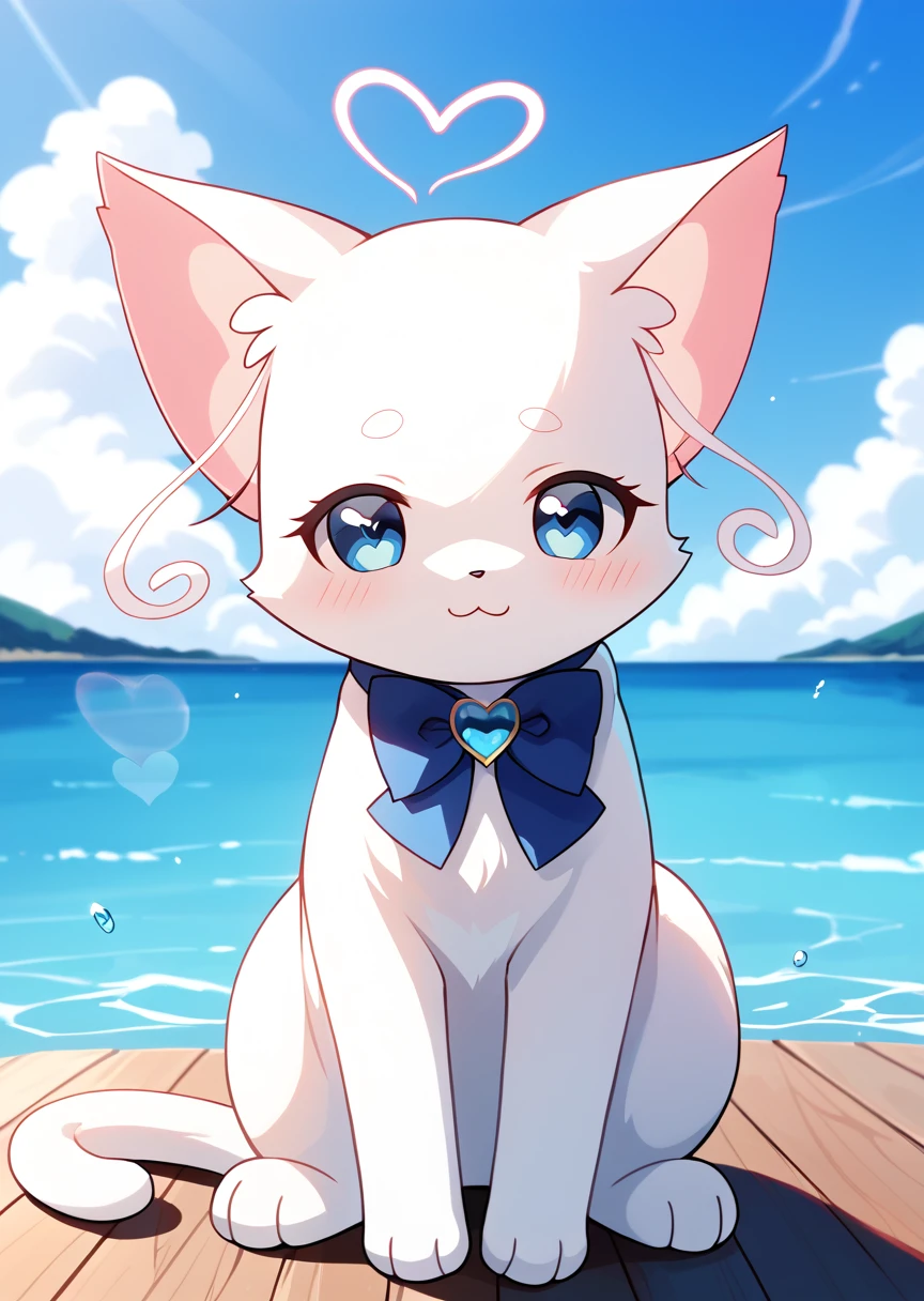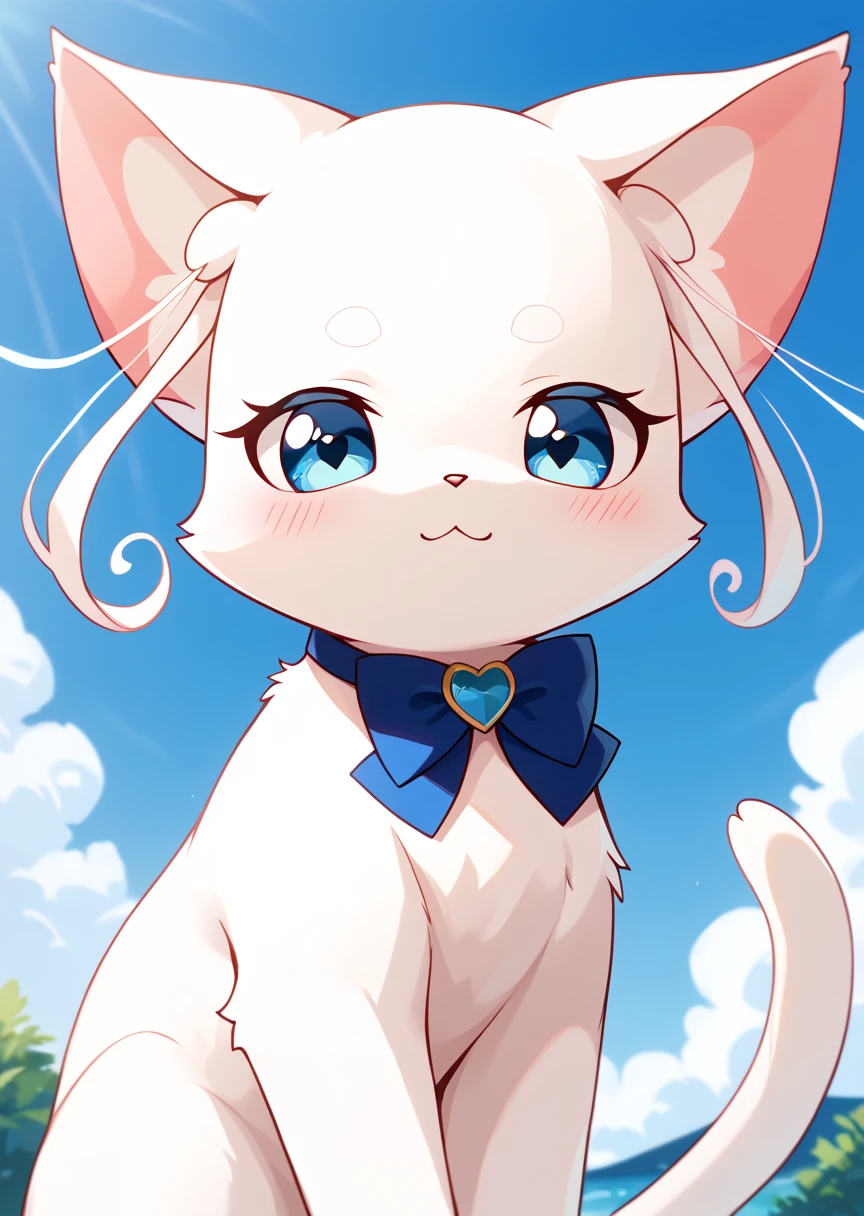prompts: yukicat, no humans, brooch, cat, blue eyes, :3, cat tail, bowtie, white fur, heart-shaped pupils, furry