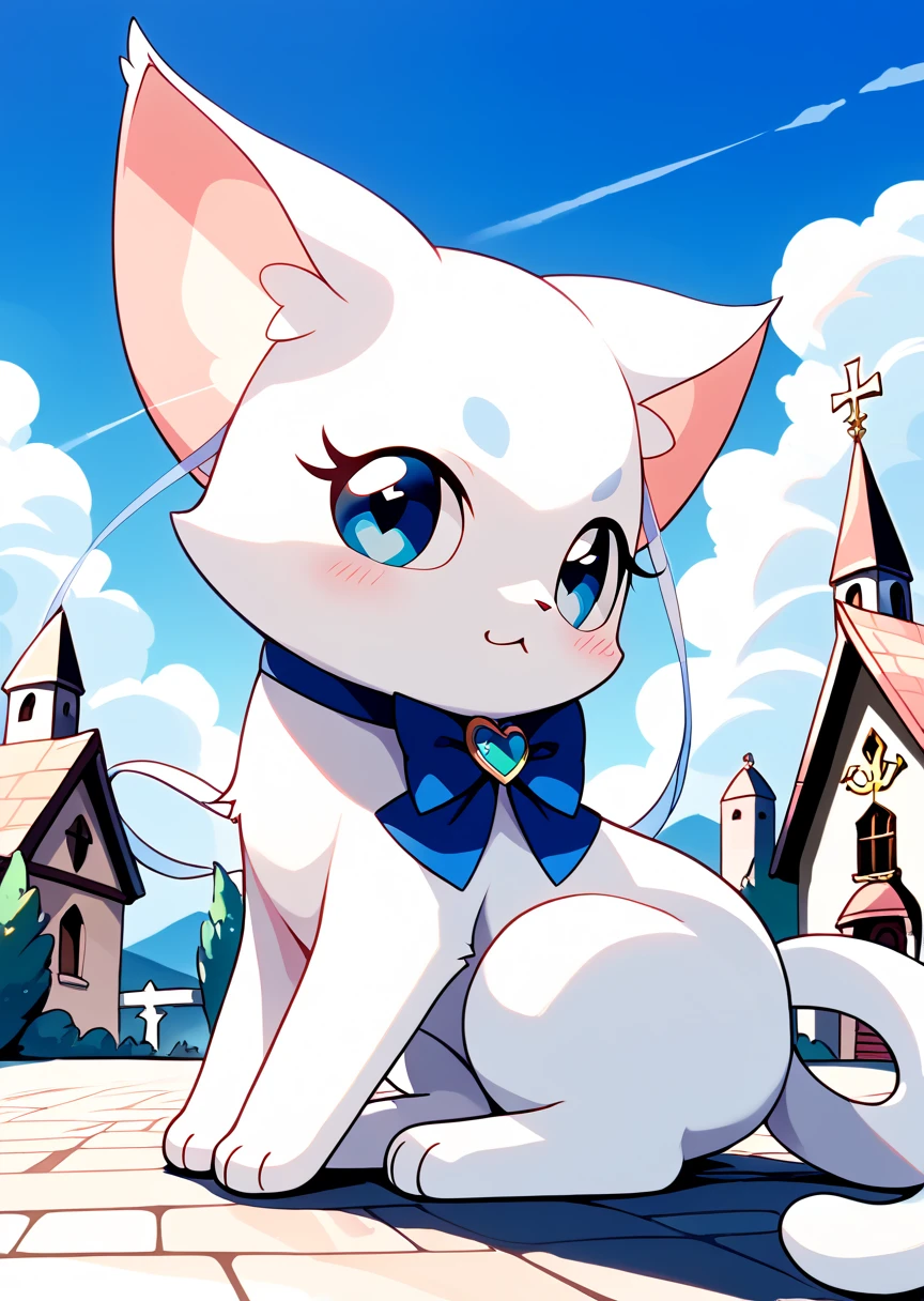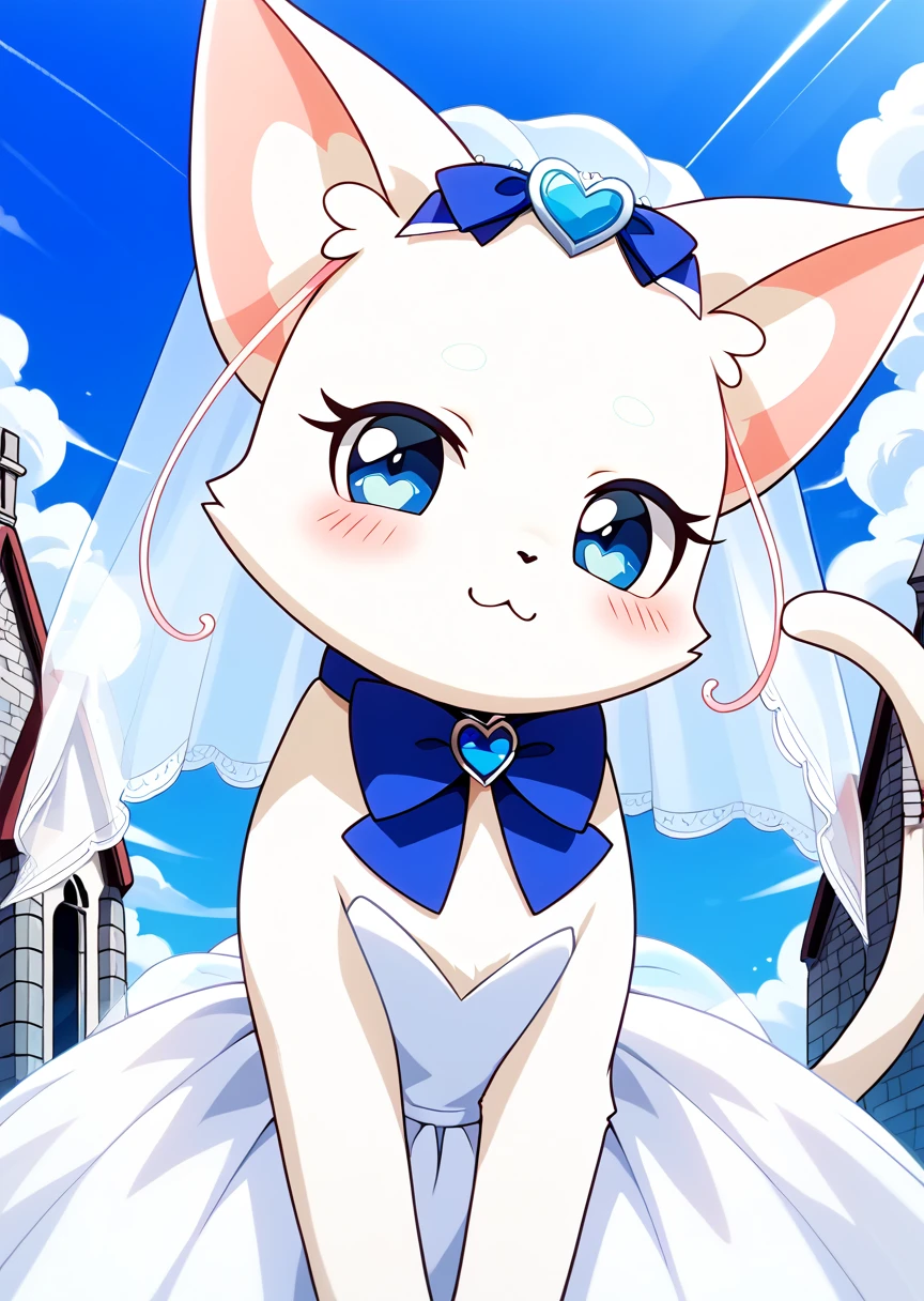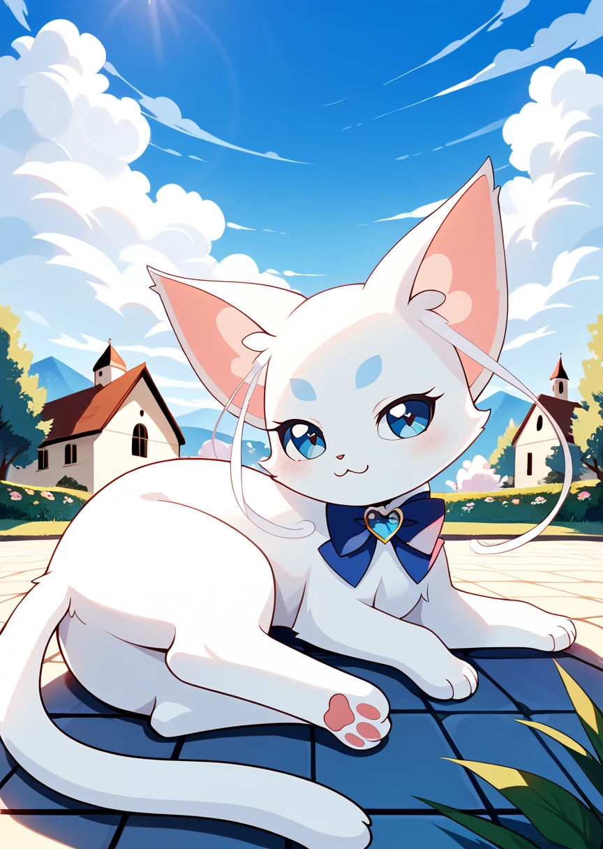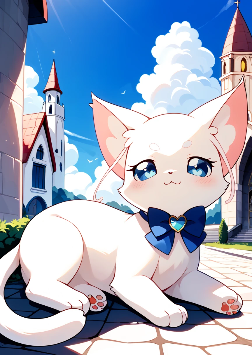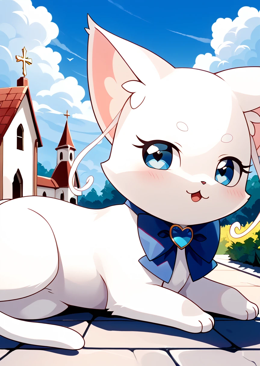 prompts: yukicat, no humans, brooch, cat, blue eyes, :3, cat tail, bowtie, white fur, heart-shaped pupils, furry