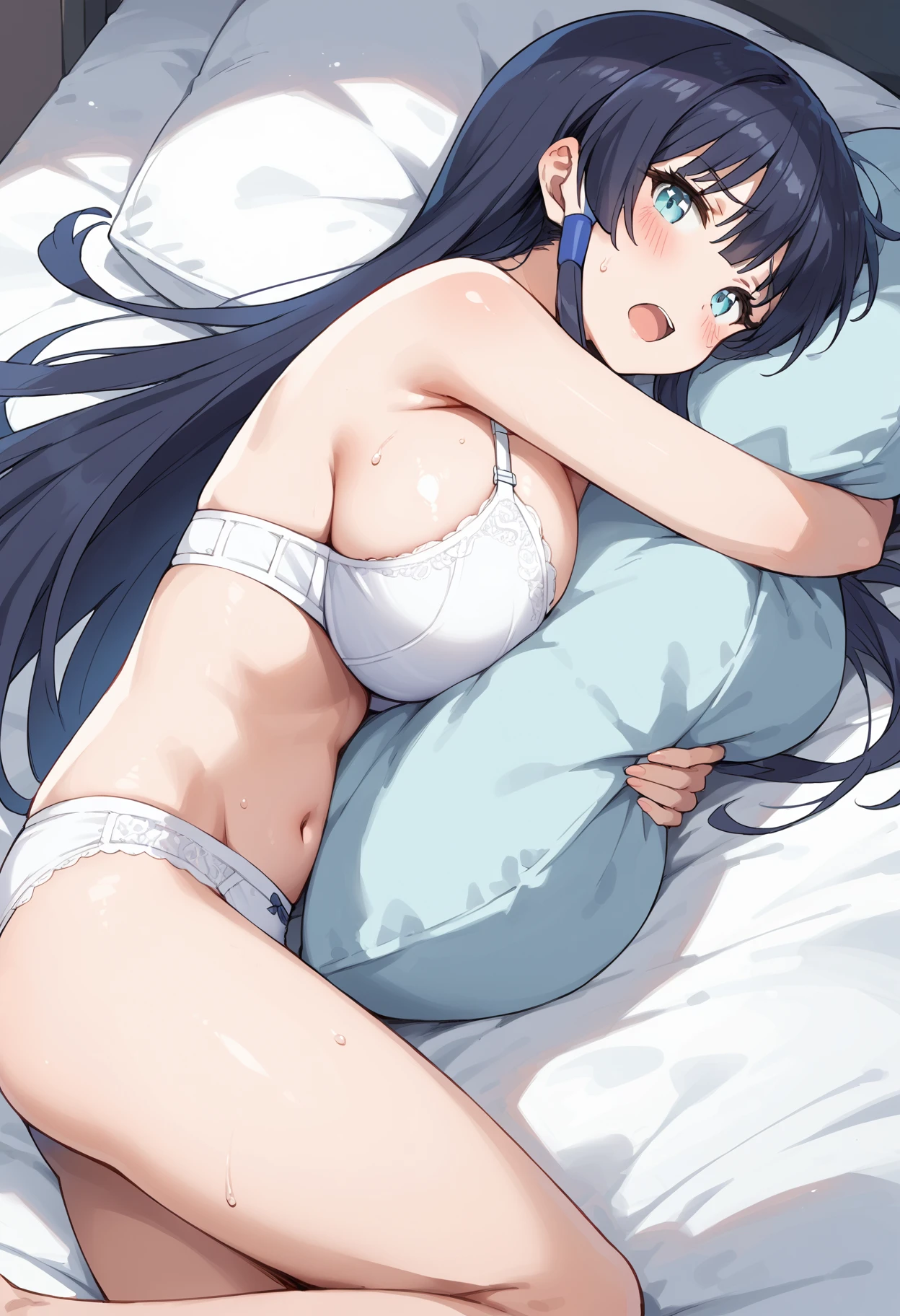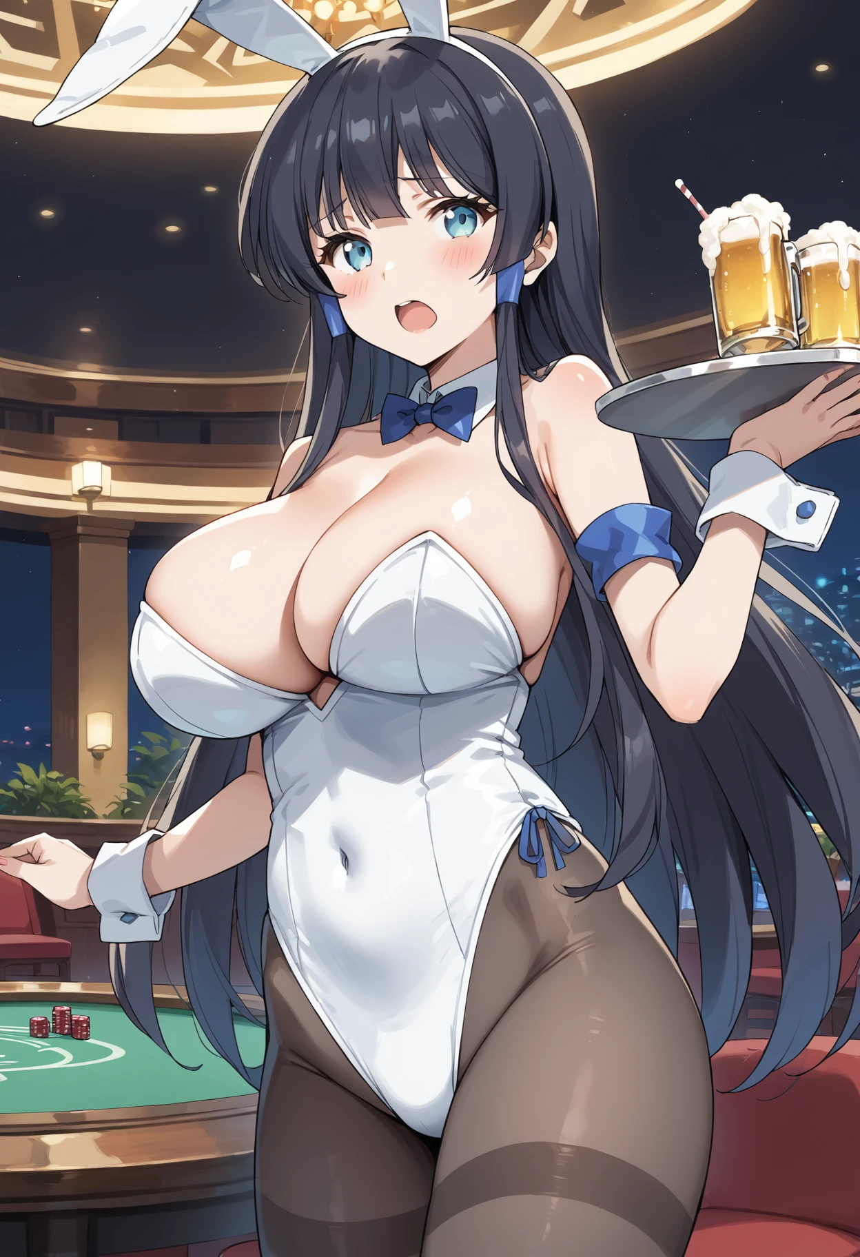 freezingastaroth, black hair, aqua eyes, very long hair, sidelocks, hair tubes, blunt bangs, hime cut, huge breasts