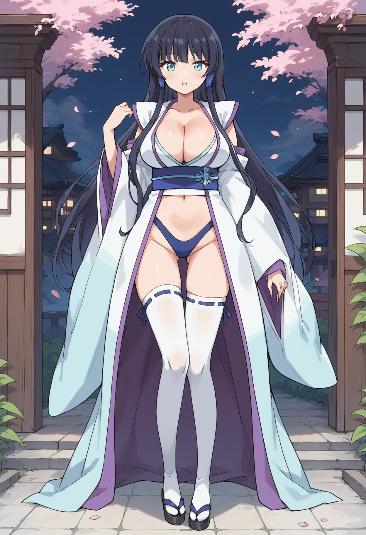 white thighhighs, navel, wide sleeves, detached sleeves, sleeveless kimono, obi, blue panties, ribbon-trimmed legwear, highleg panties, For back view, swap to these / 後ろ姿を見たいなら、これらをに変更します / 背影改用這組: