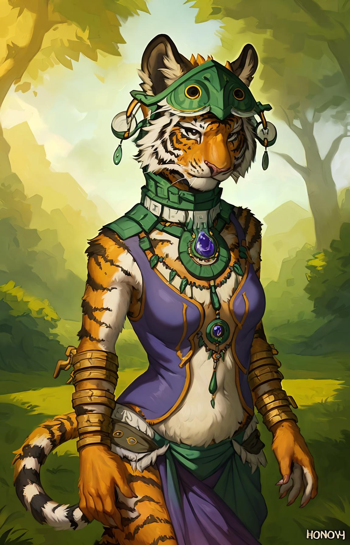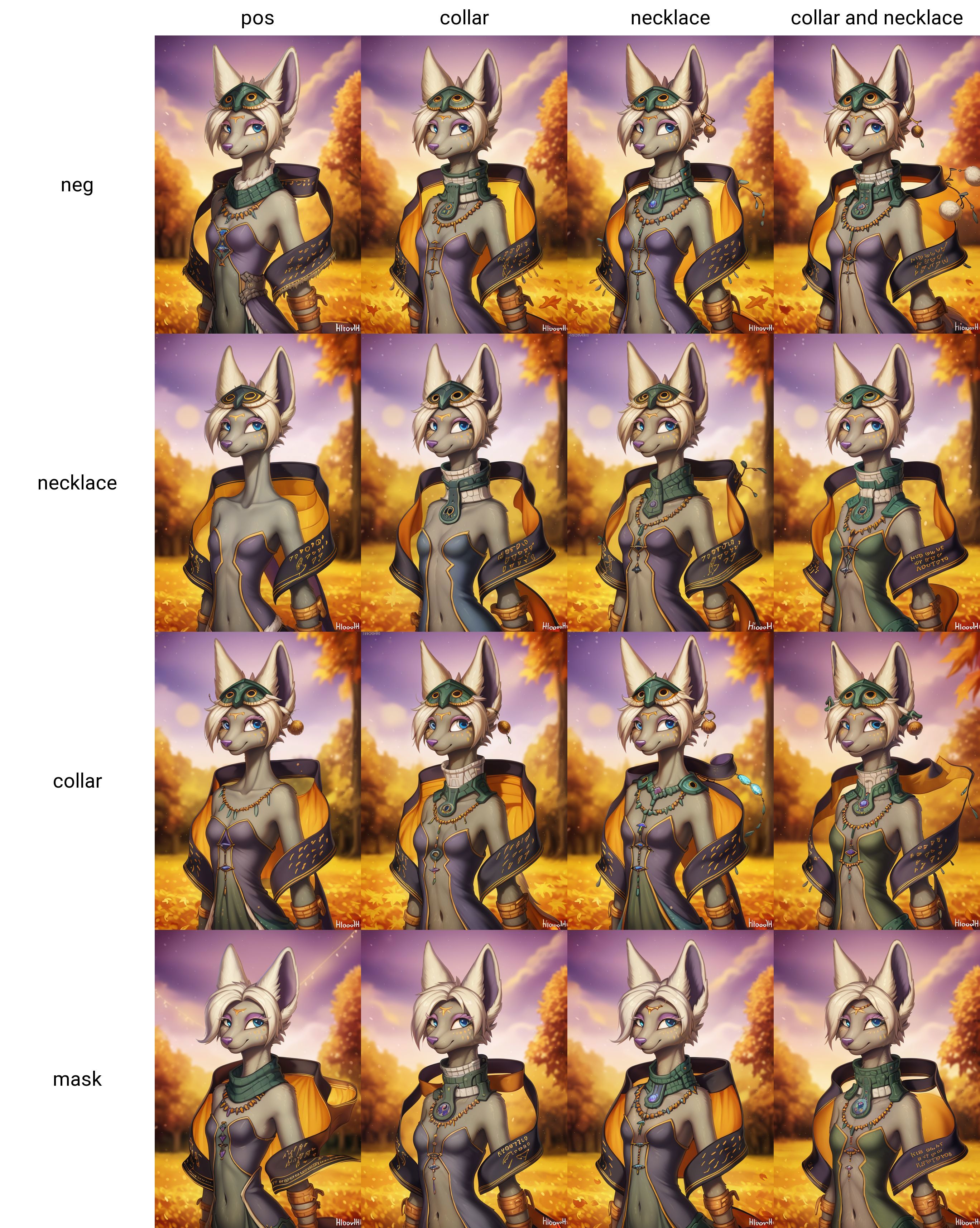 the main token elements is the collar/necklace, mask, and floating scarf. p.s. use negatives, the mask likes to stick around if you dont.