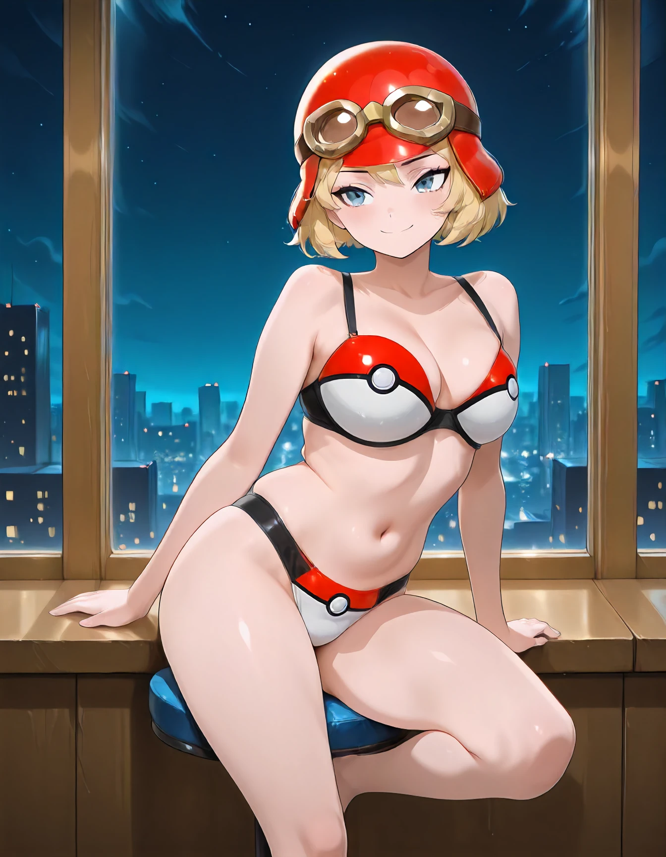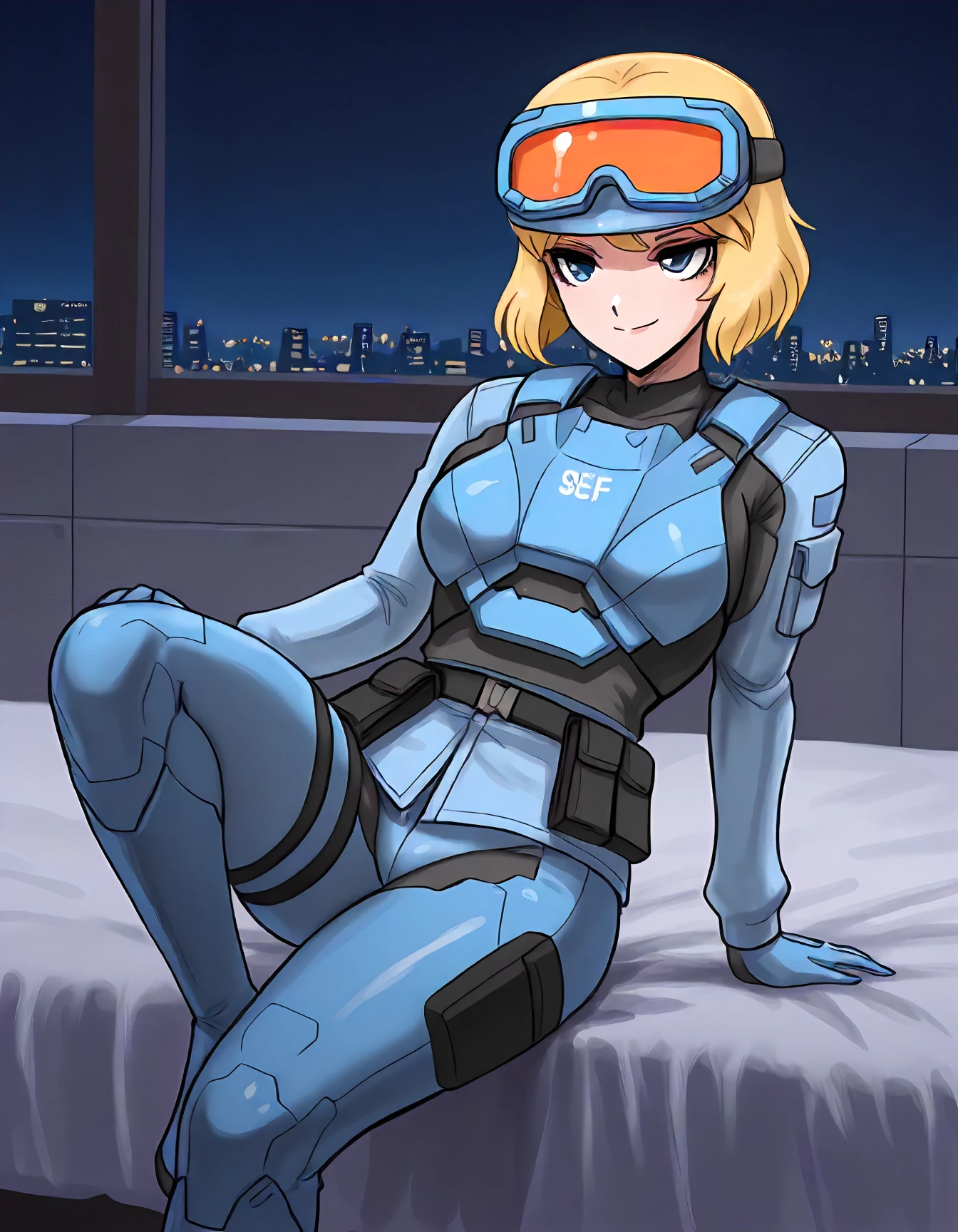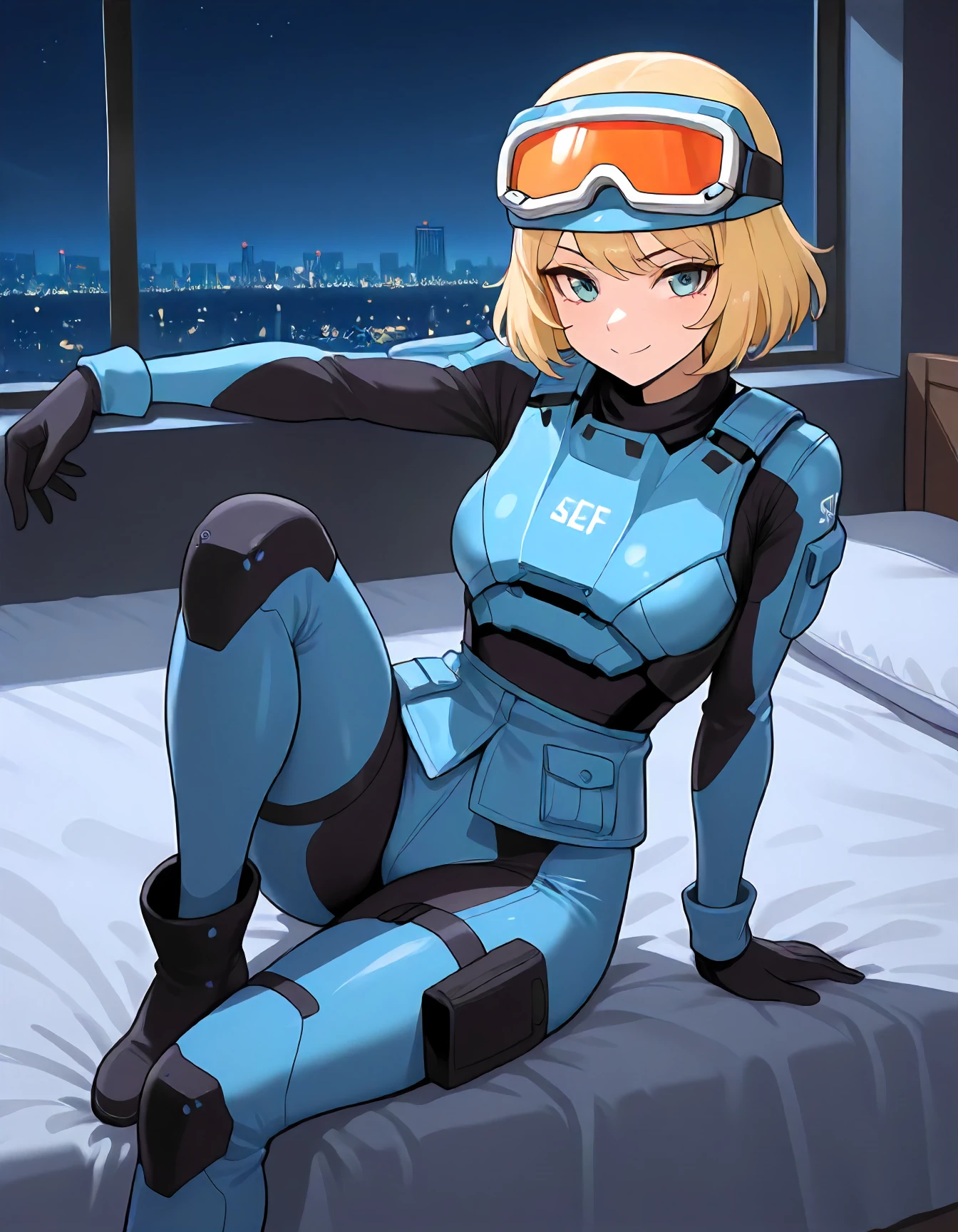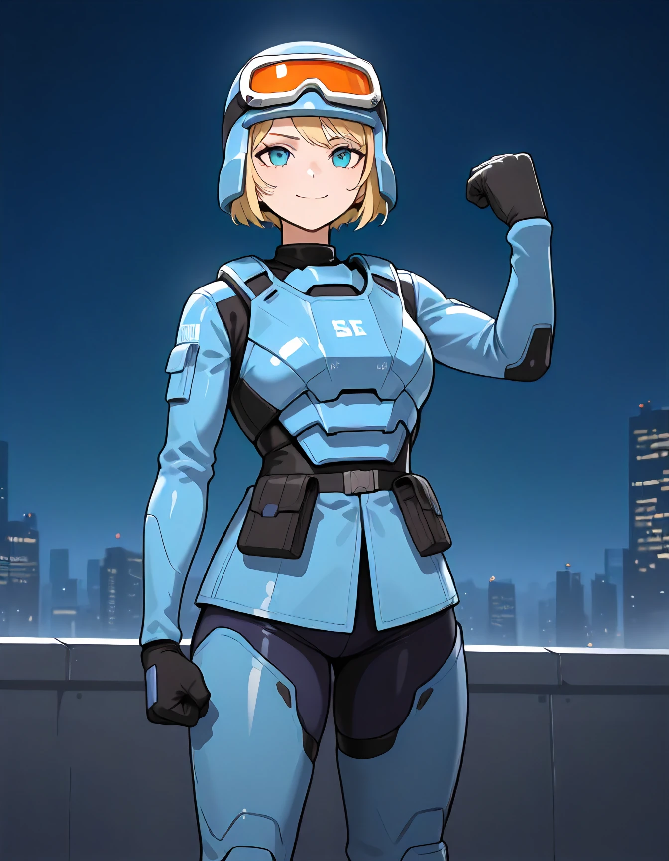 short blonde hair, helmet, goggles on head, gloves, bulletproof vest, military uniform, blue bodysuit
