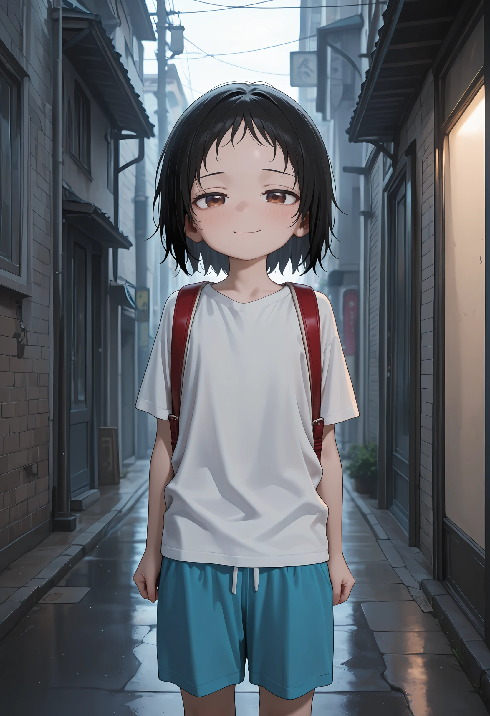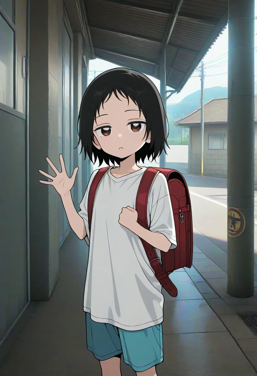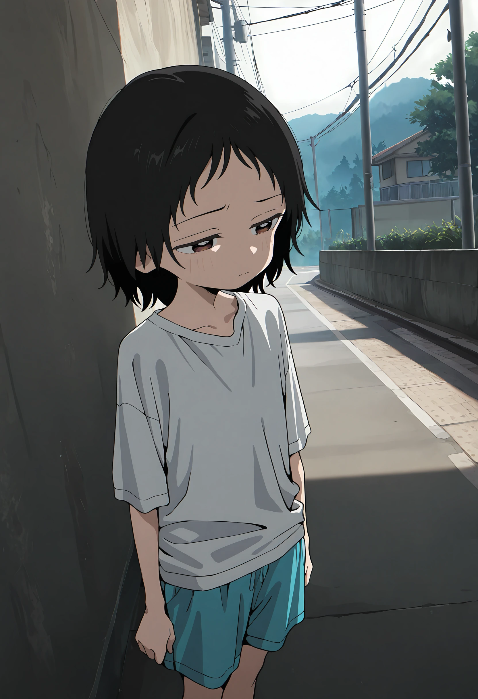 1girl, Shizuka Kuze, child, very thin, black hair, forehead, short hair, brown eyes,