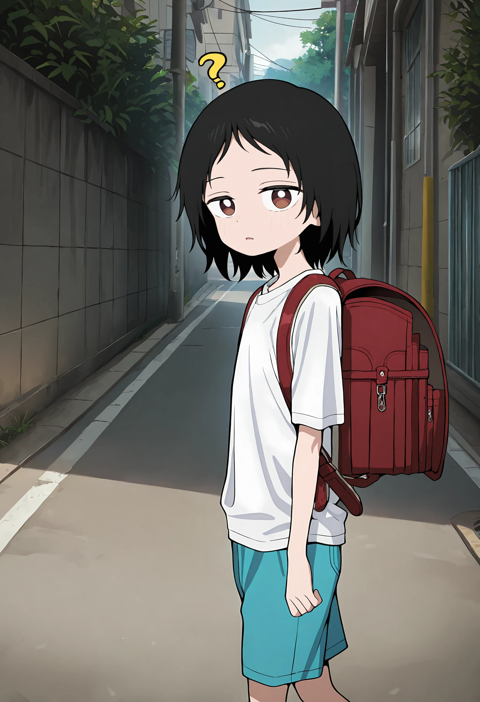 disheveled clothes, white shirt, blue shorts, red backpack,