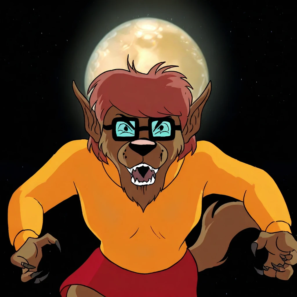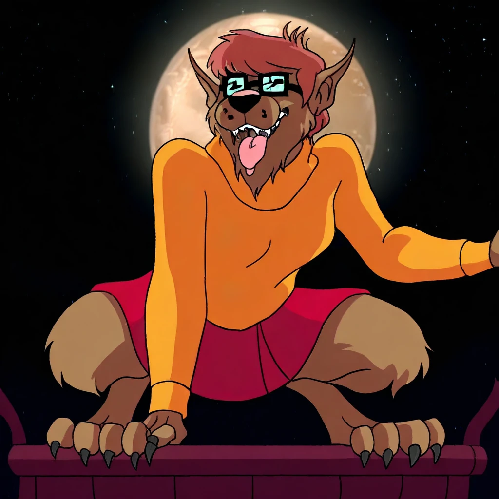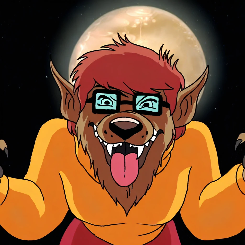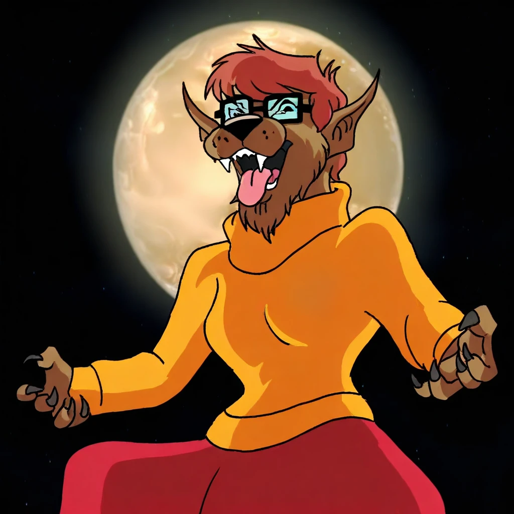 WWV3lma-SD&TGK, ginger hair, brown fur, pointy ears, square glasses, orange sweater, red skirt, claws, tail