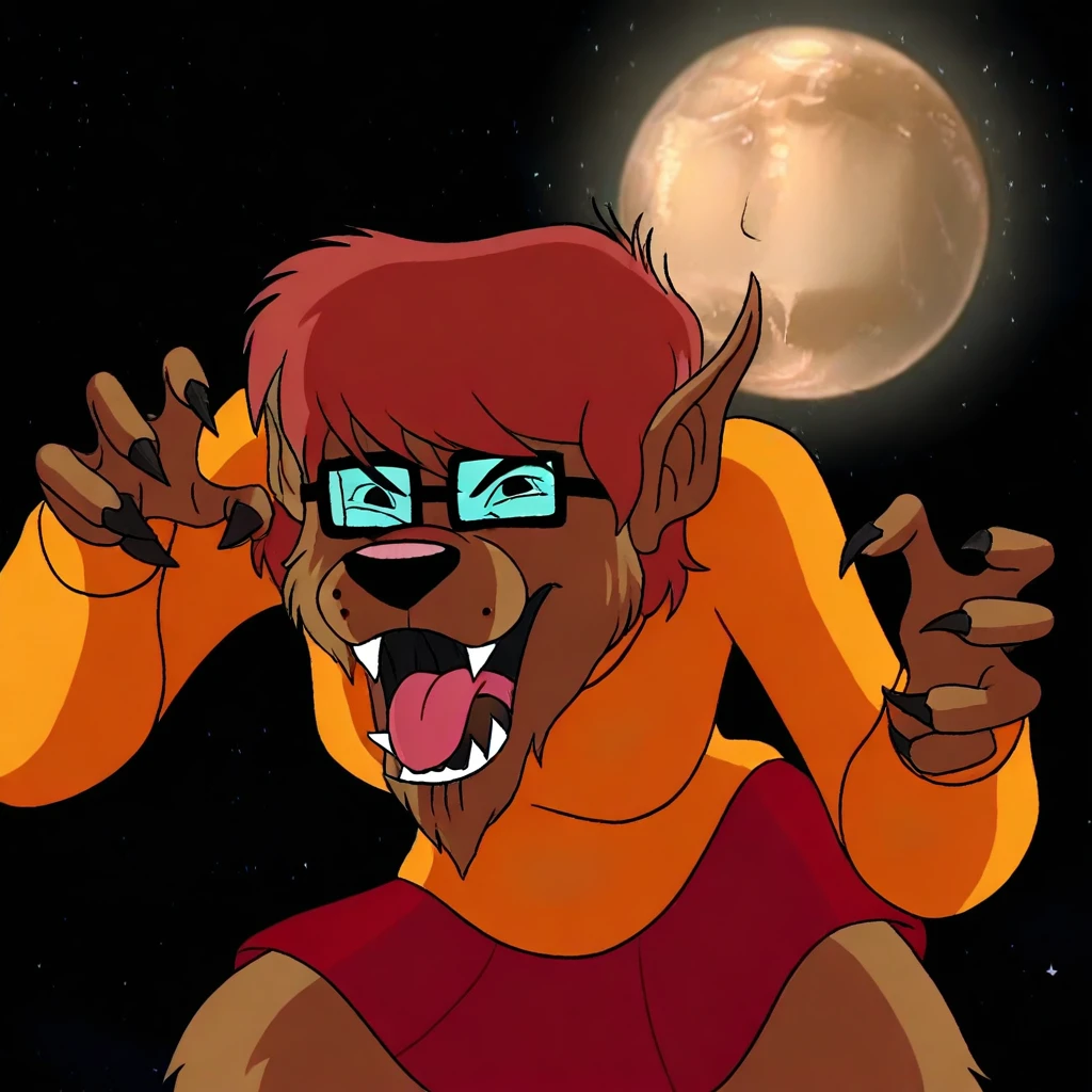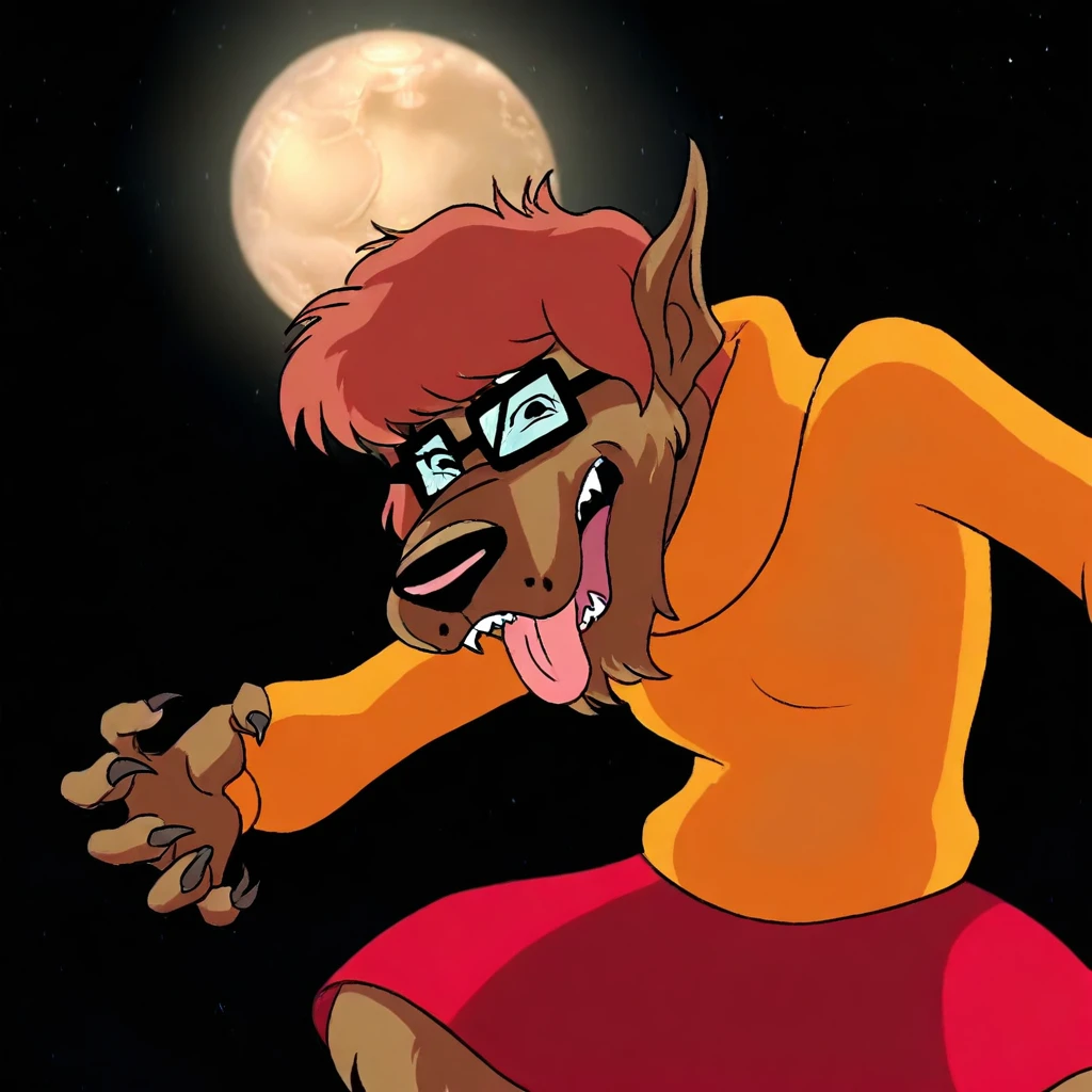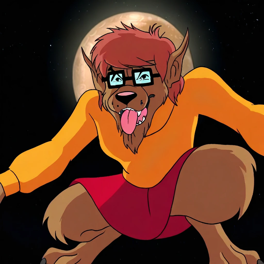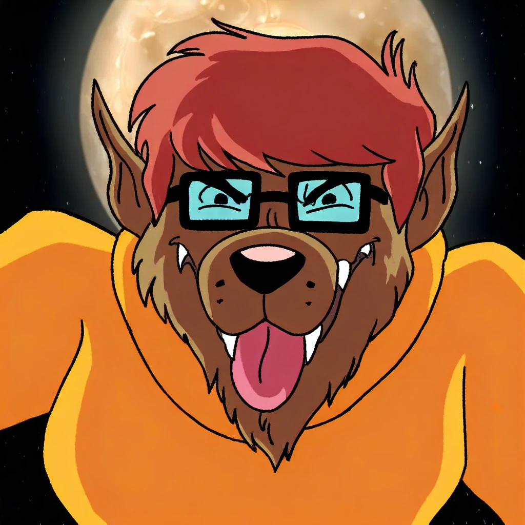 WWV3lma-SD&TGK, ginger hair, brown fur, pointy ears, square glasses, orange sweater, red skirt, claws, tail