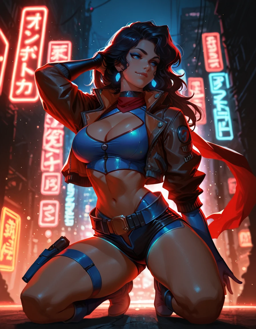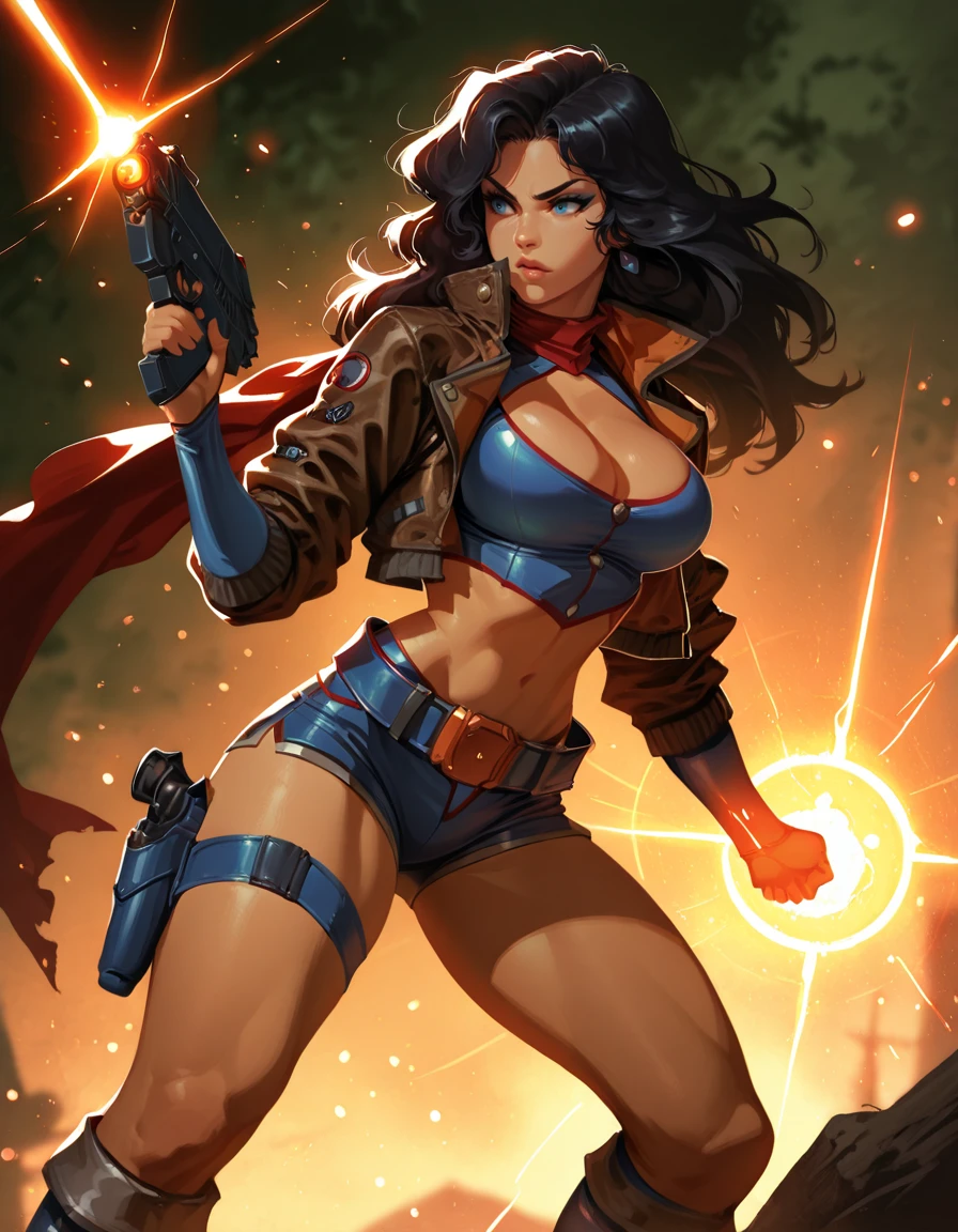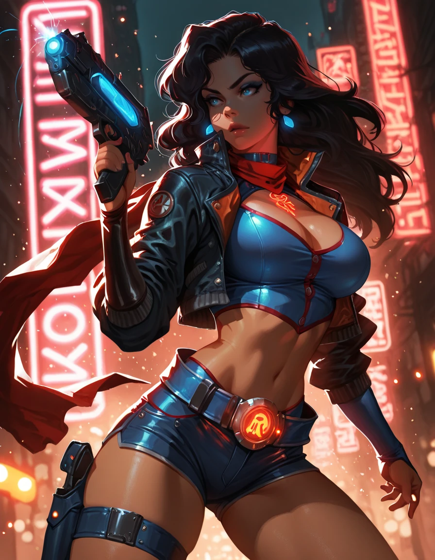 shorts, crop top, jacket, knee boots, thigh strap, red scarf, holster, choker, belt, elbow gloves,