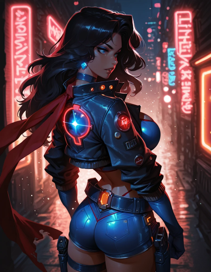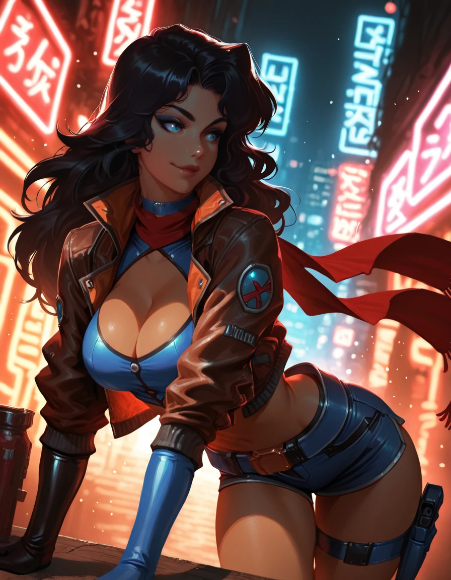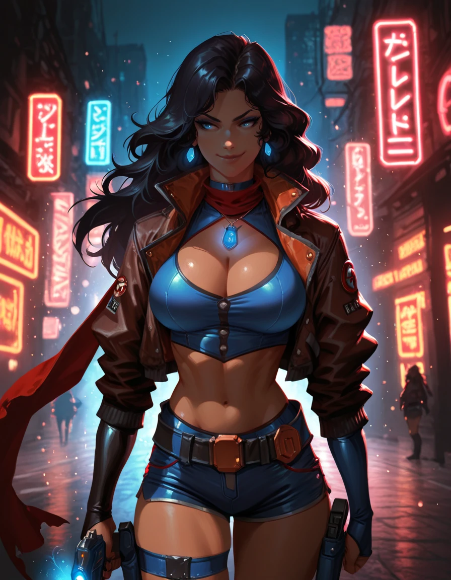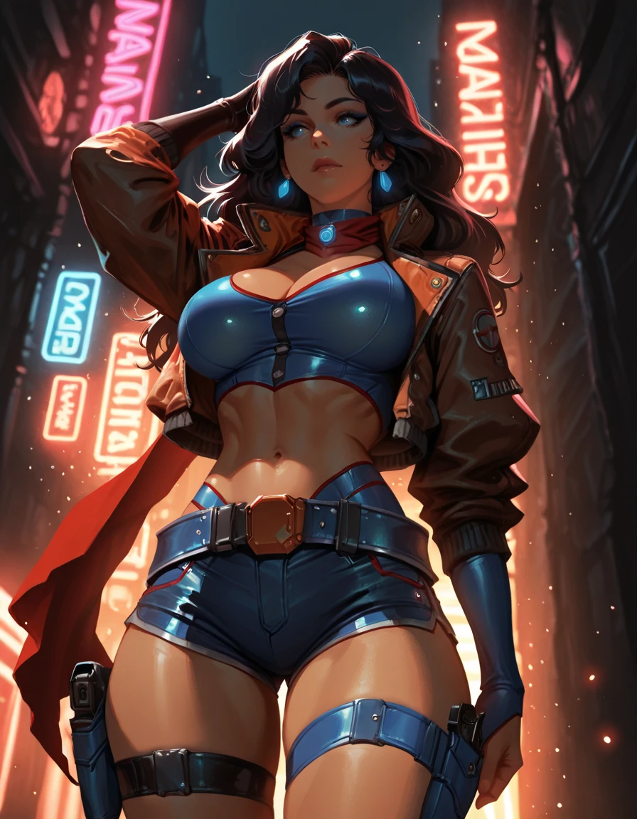 shorts, crop top, jacket, knee boots, thigh strap, red scarf, holster, choker, belt, elbow gloves,