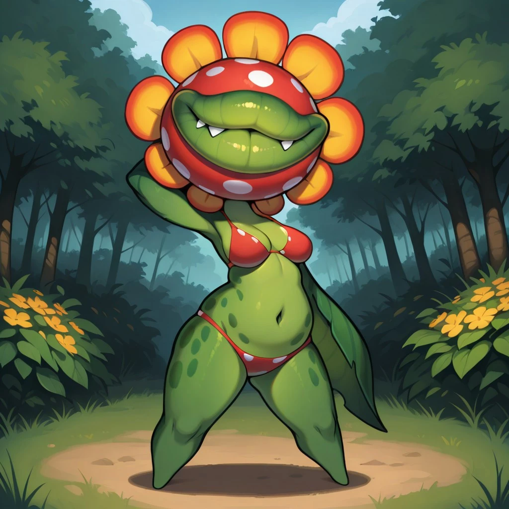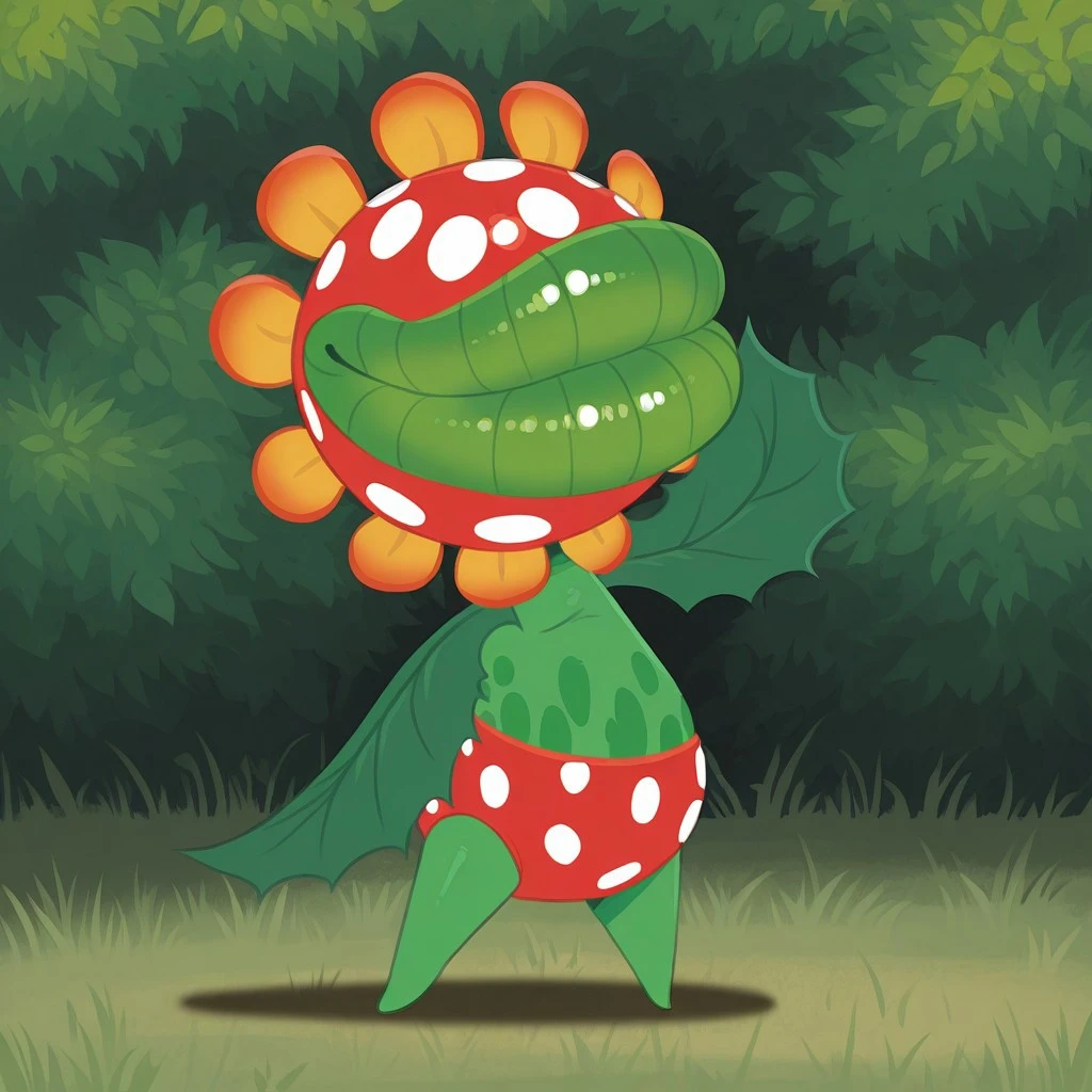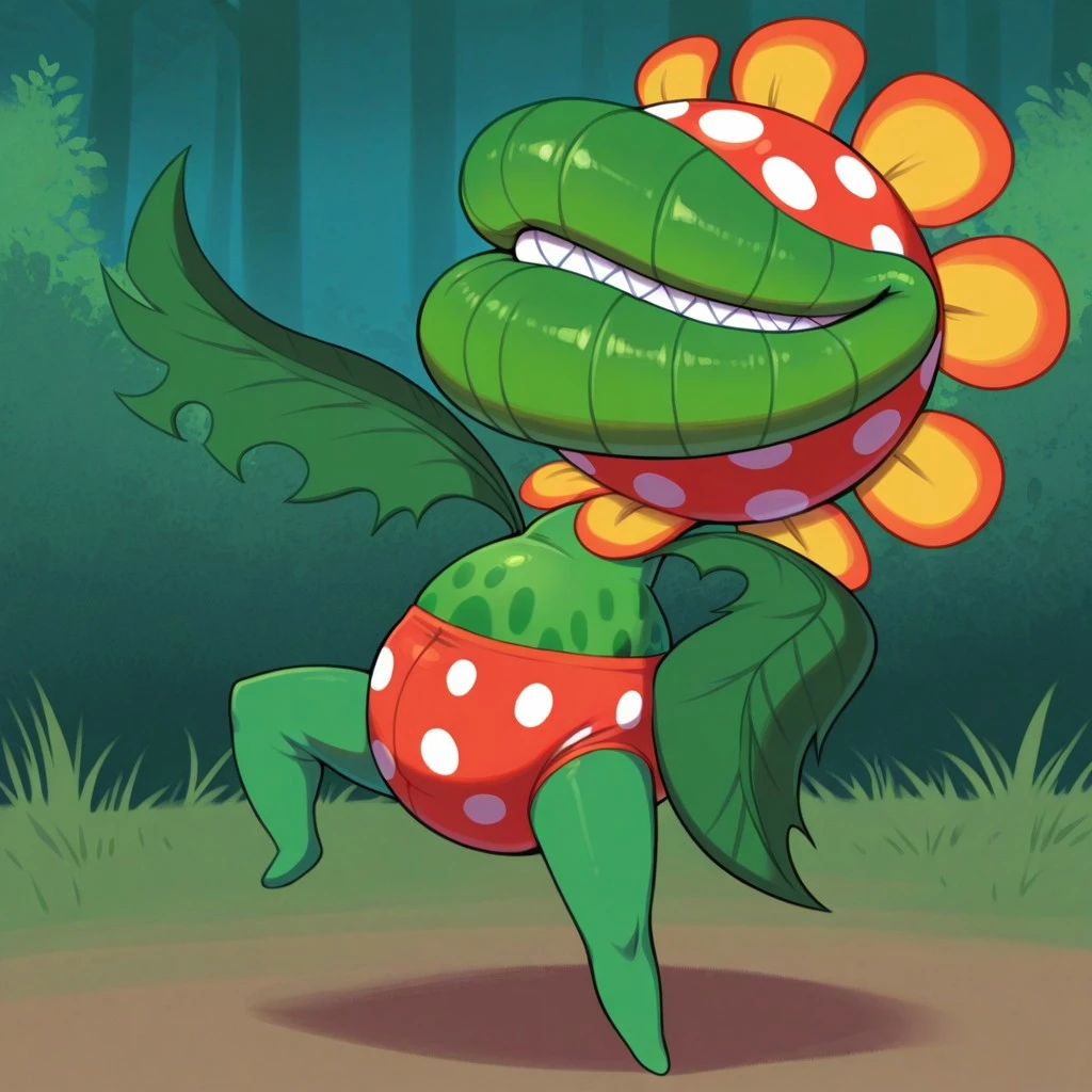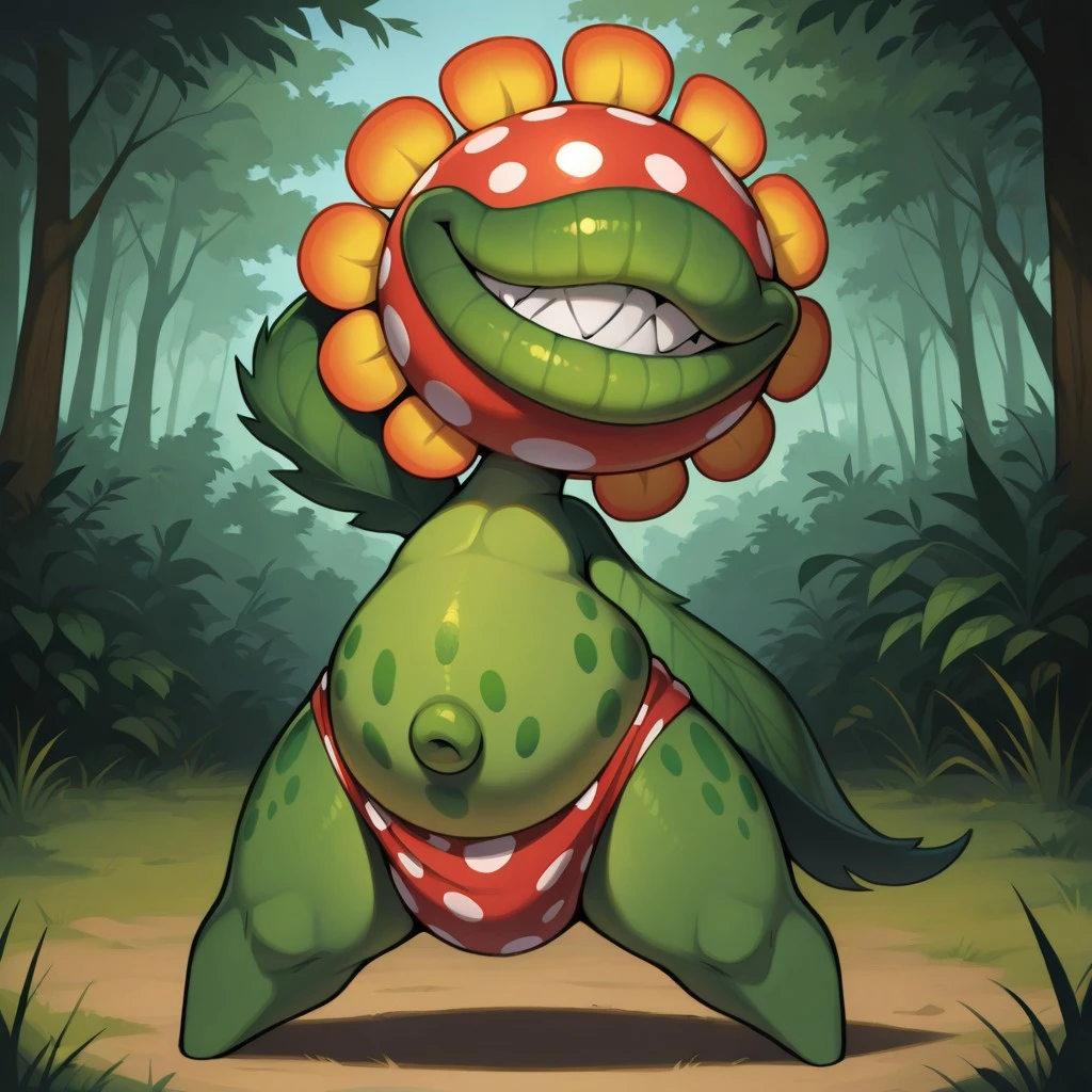Tags: Petey_Piranha, big head, round head, red colored head with white spots, yellow and orange flower pedals around head, no eyes, no nose, big lips, green lips, sharp teeth, overweight, all green body, dark green belly spots, short, short stubby legs, no toes, leaf arms, no hands, no fingers, underwear, red underwear with white spots