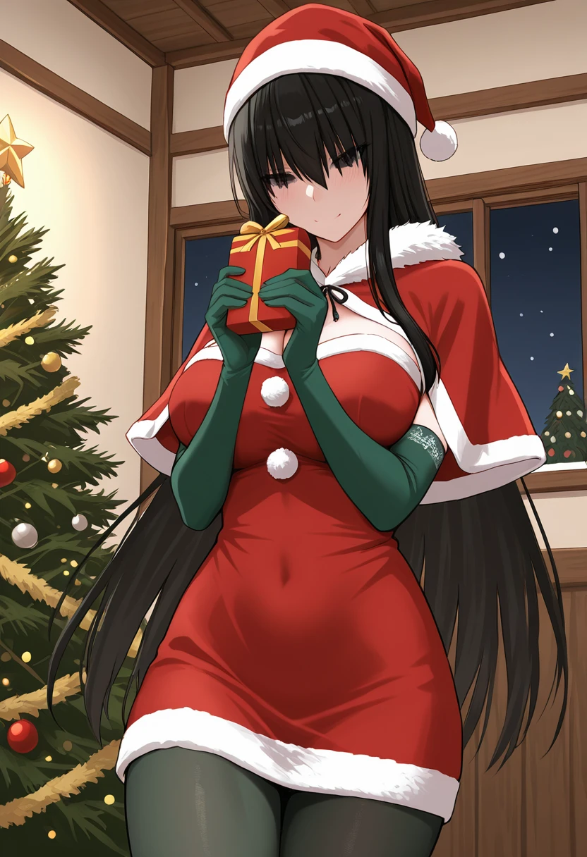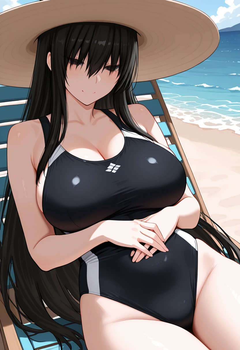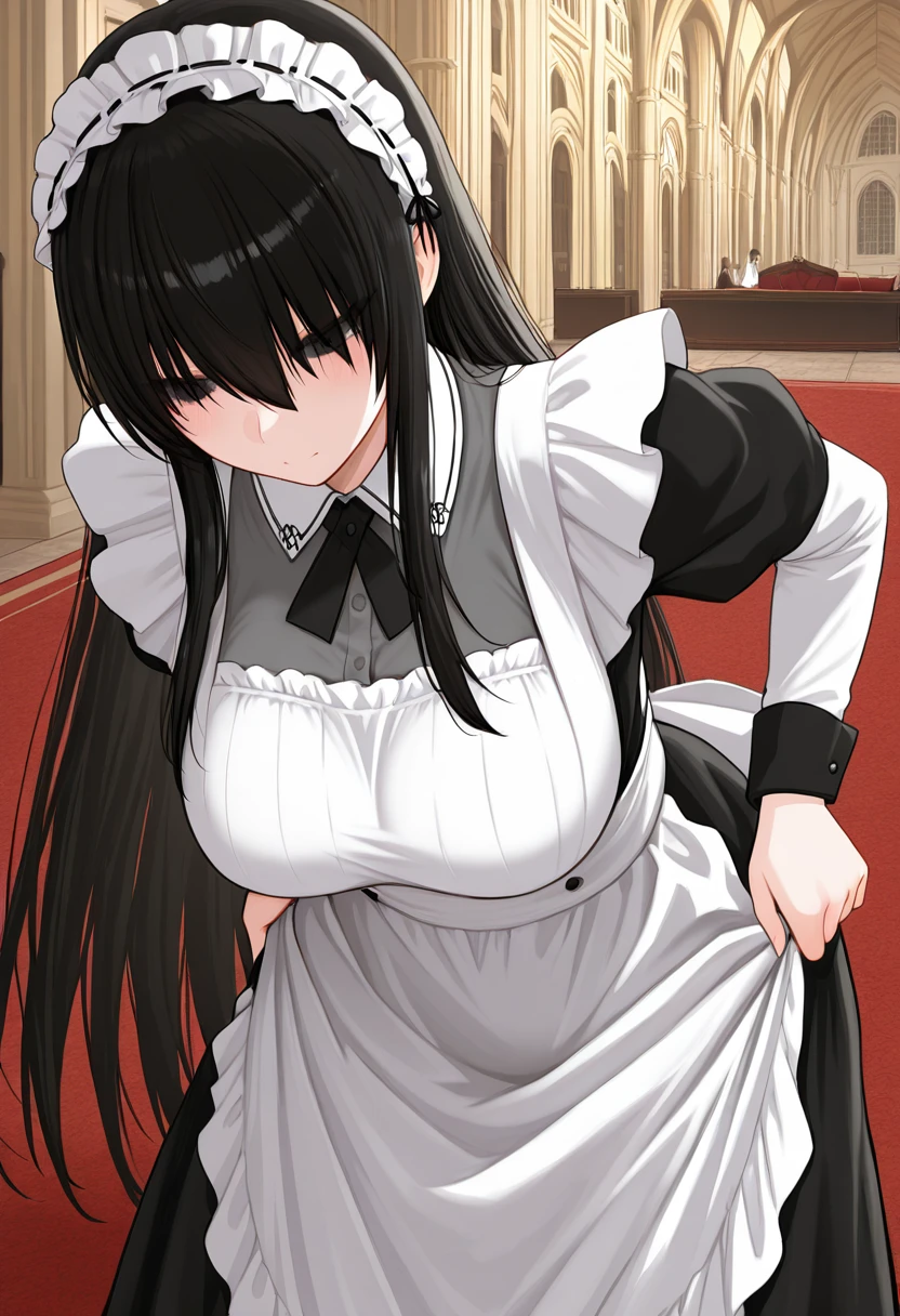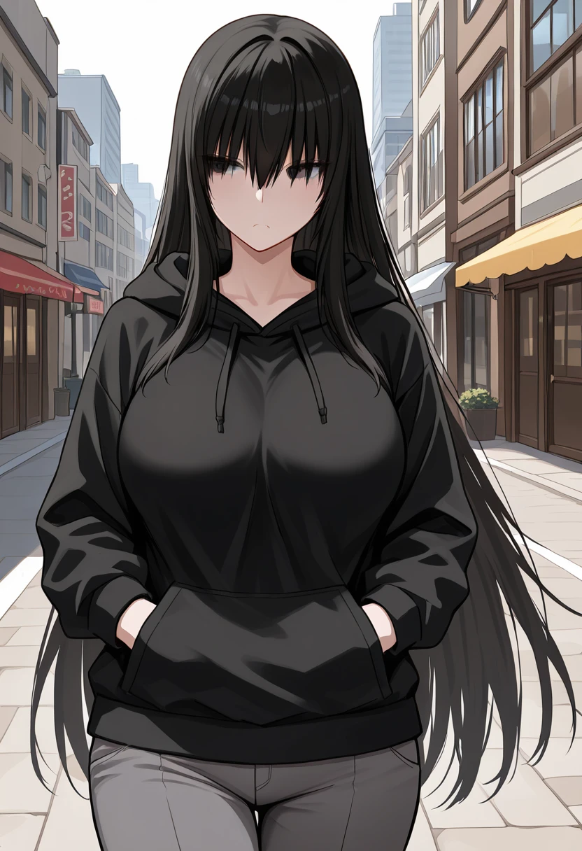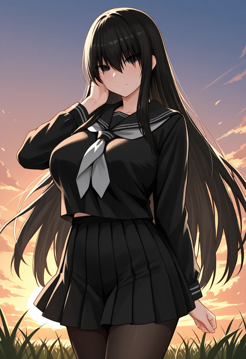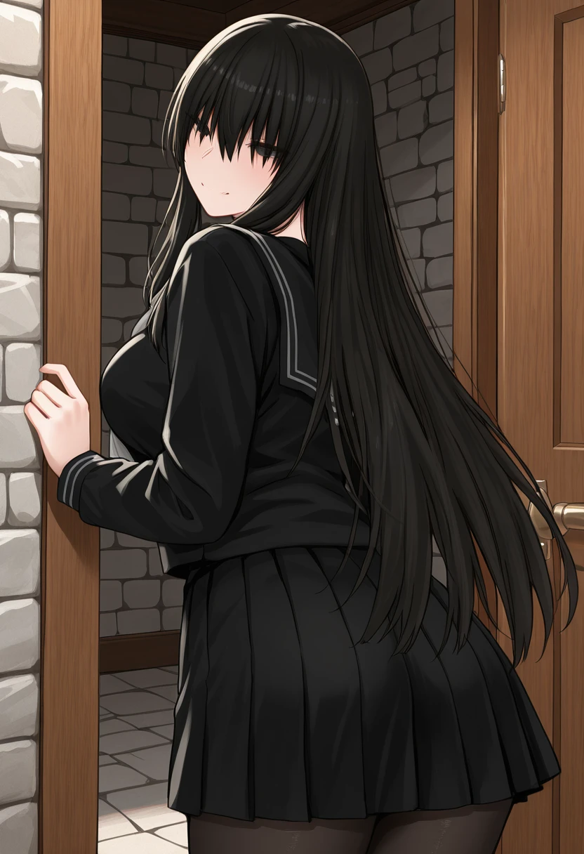 KuroSenpaiToKuro, (pale skin:0.8), black hair, very long hair, hair over eyes, wispy bangs, long sidelocks, black eyes, large breasts,