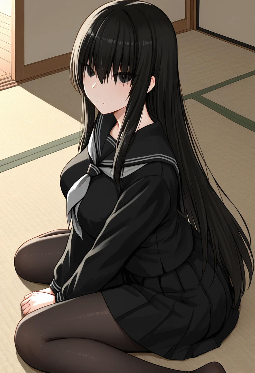 Trigger Words (Outfit): black serafuku, gray neckerchief, long sleeves, pleated skirt, miniskirt, pantyhose