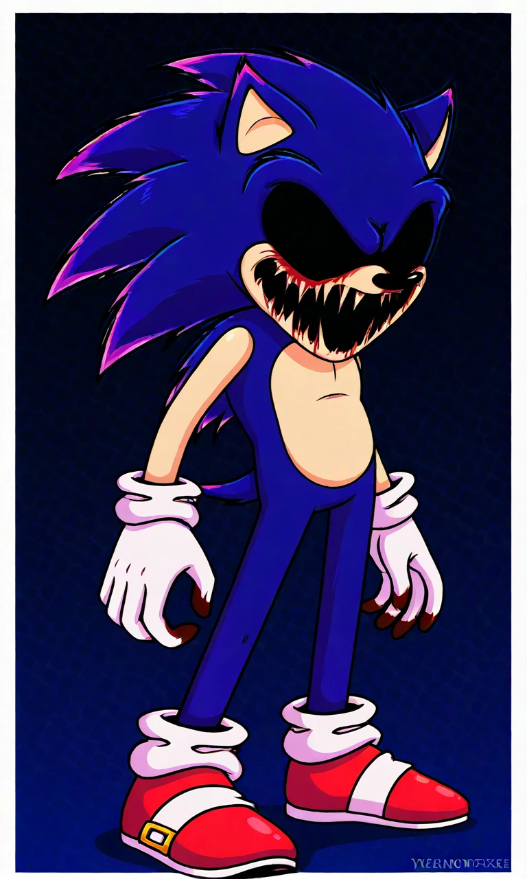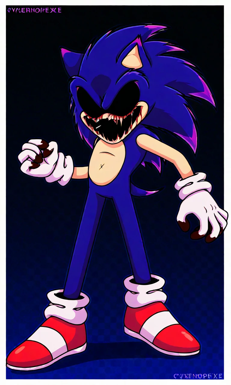 YCRXenophanesEXE, 1boy, dark blue-purple fur, peach skin, black hollow eyes, white gloves with red bloodstains, iconic red shoes, sonic the hedgehog, bloody tears, horror, melting mouth
