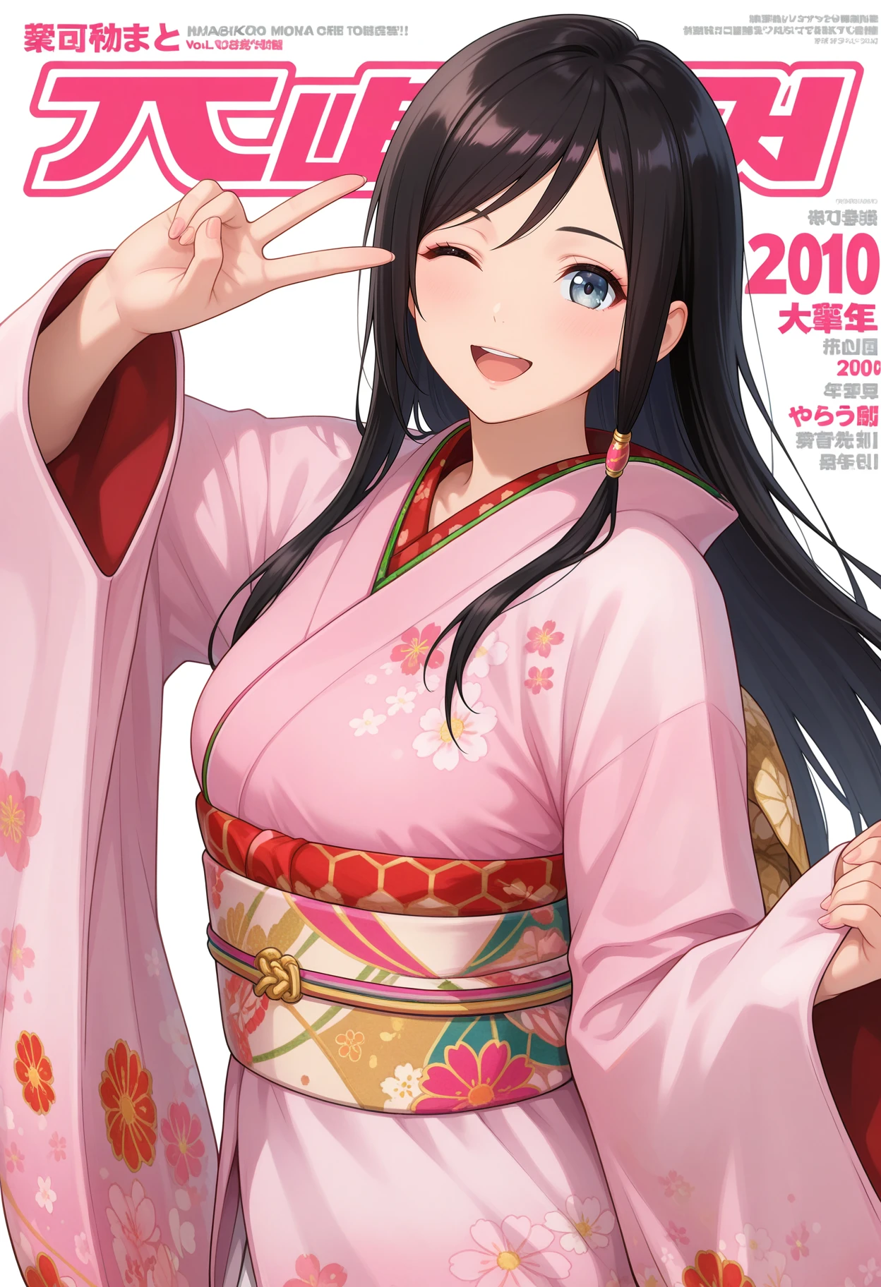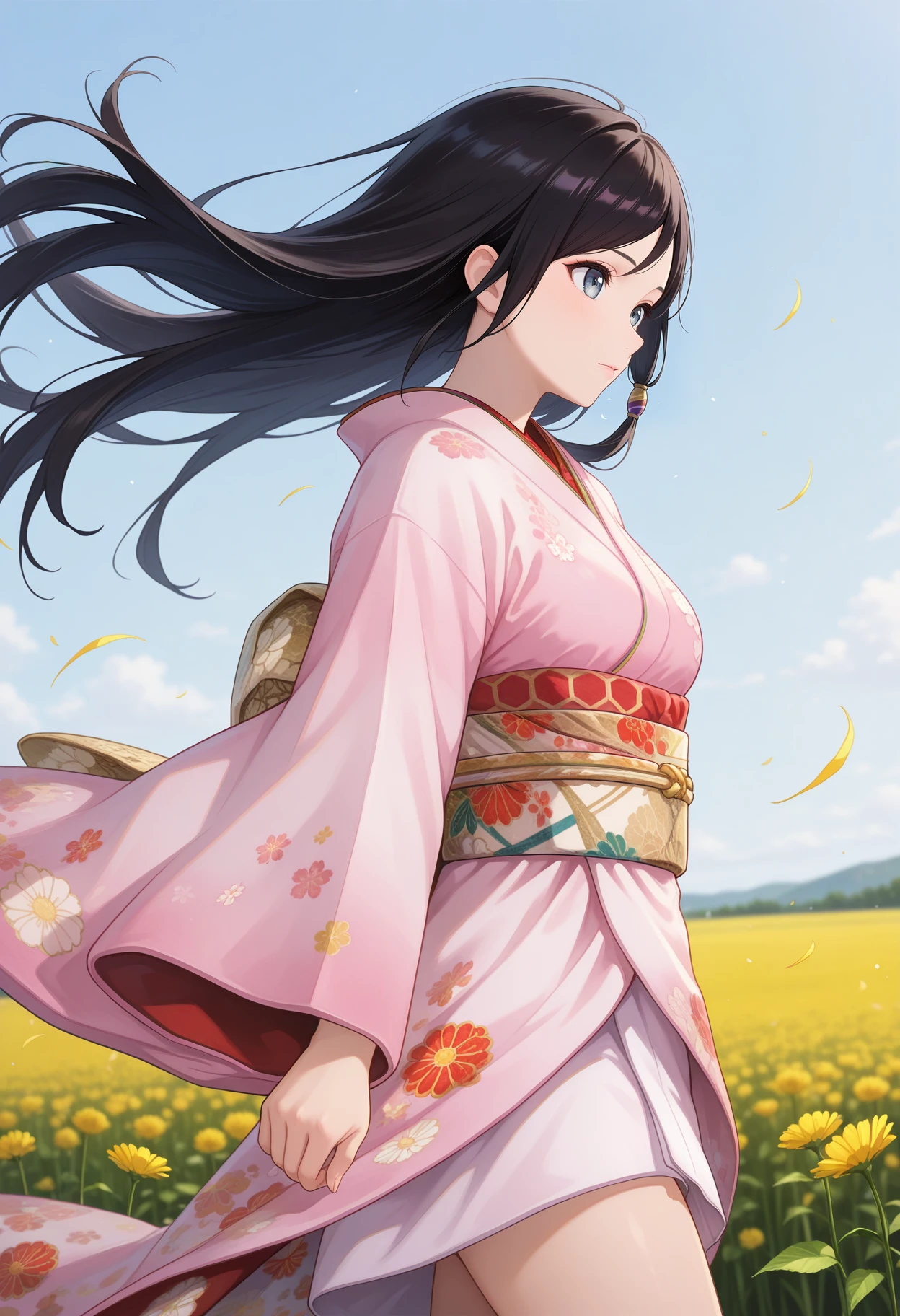 aakokoro, long hair, black hair, hair ornament, grey eyes, print kimono, pink kimono, long sleeves, wide sleeves, sash, obi